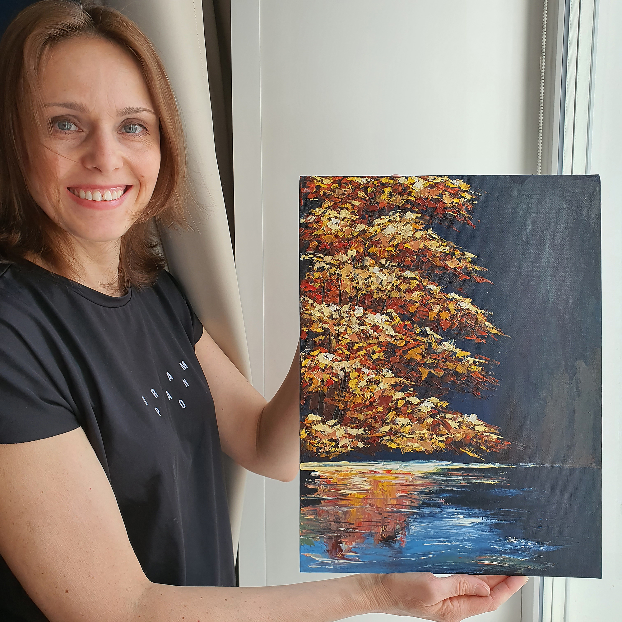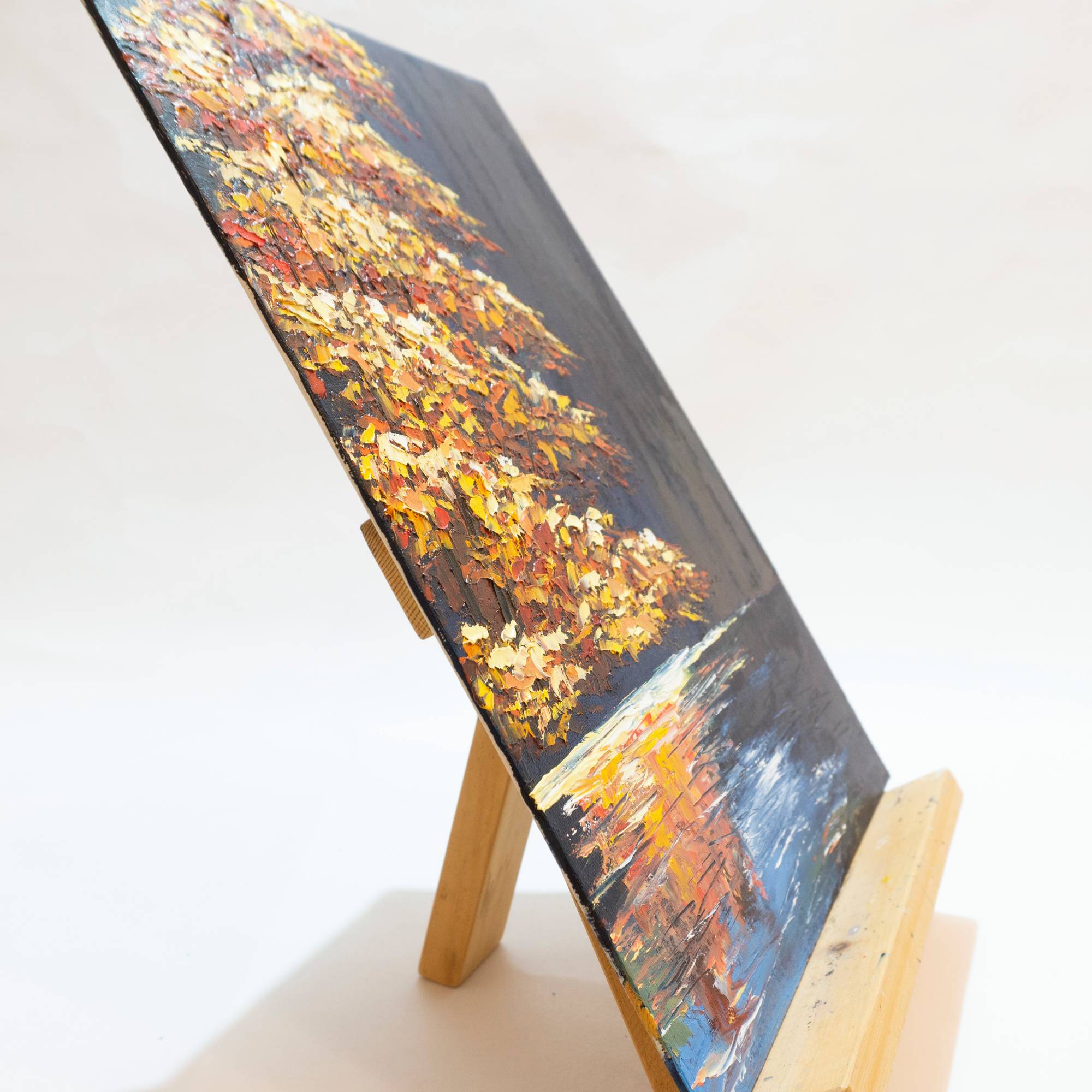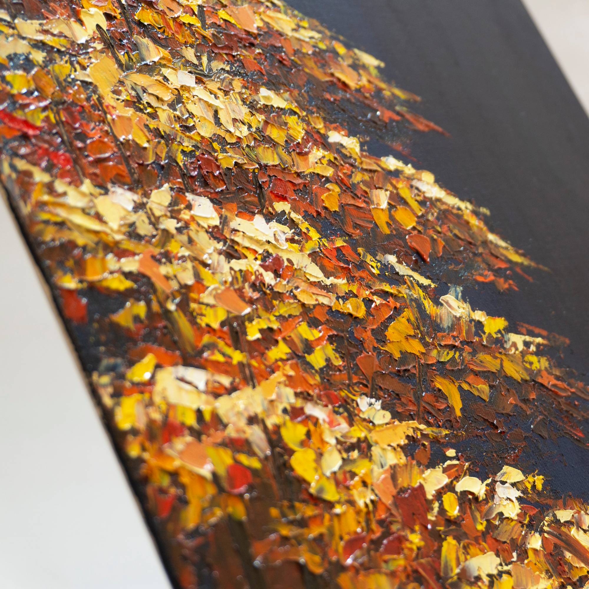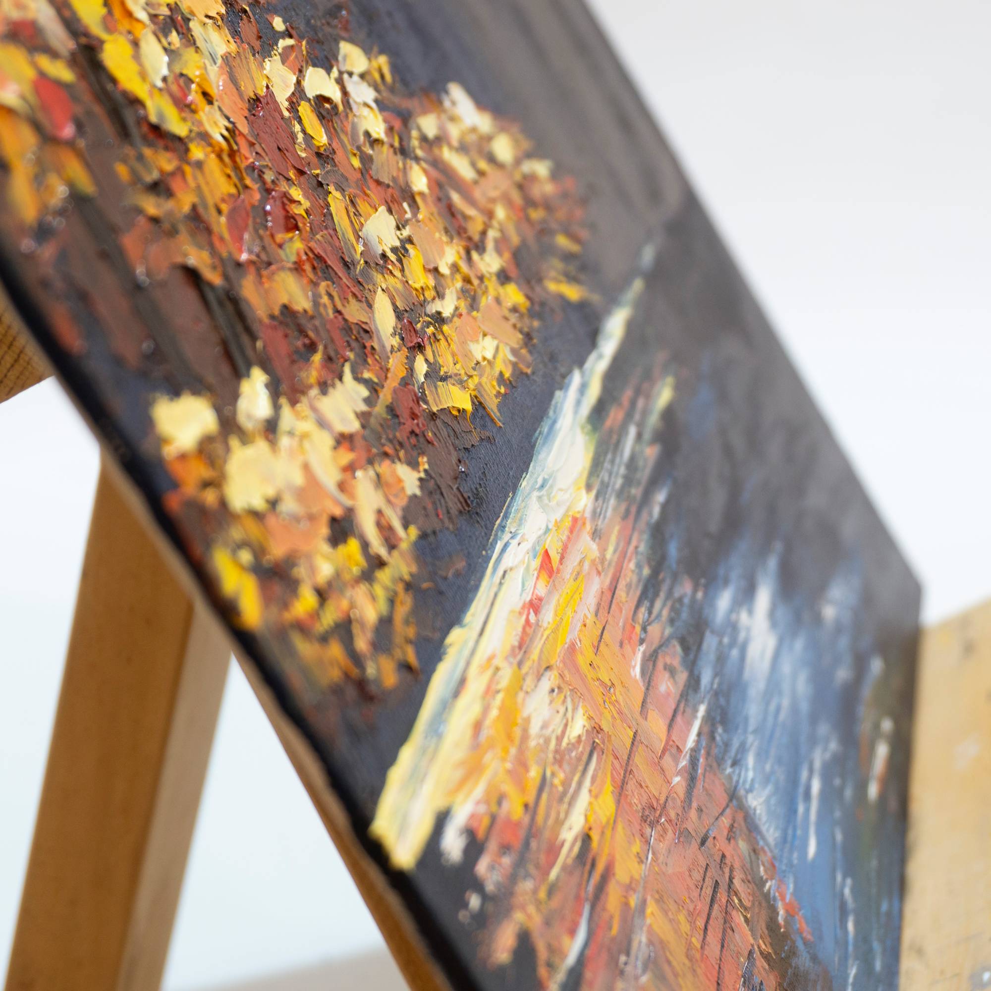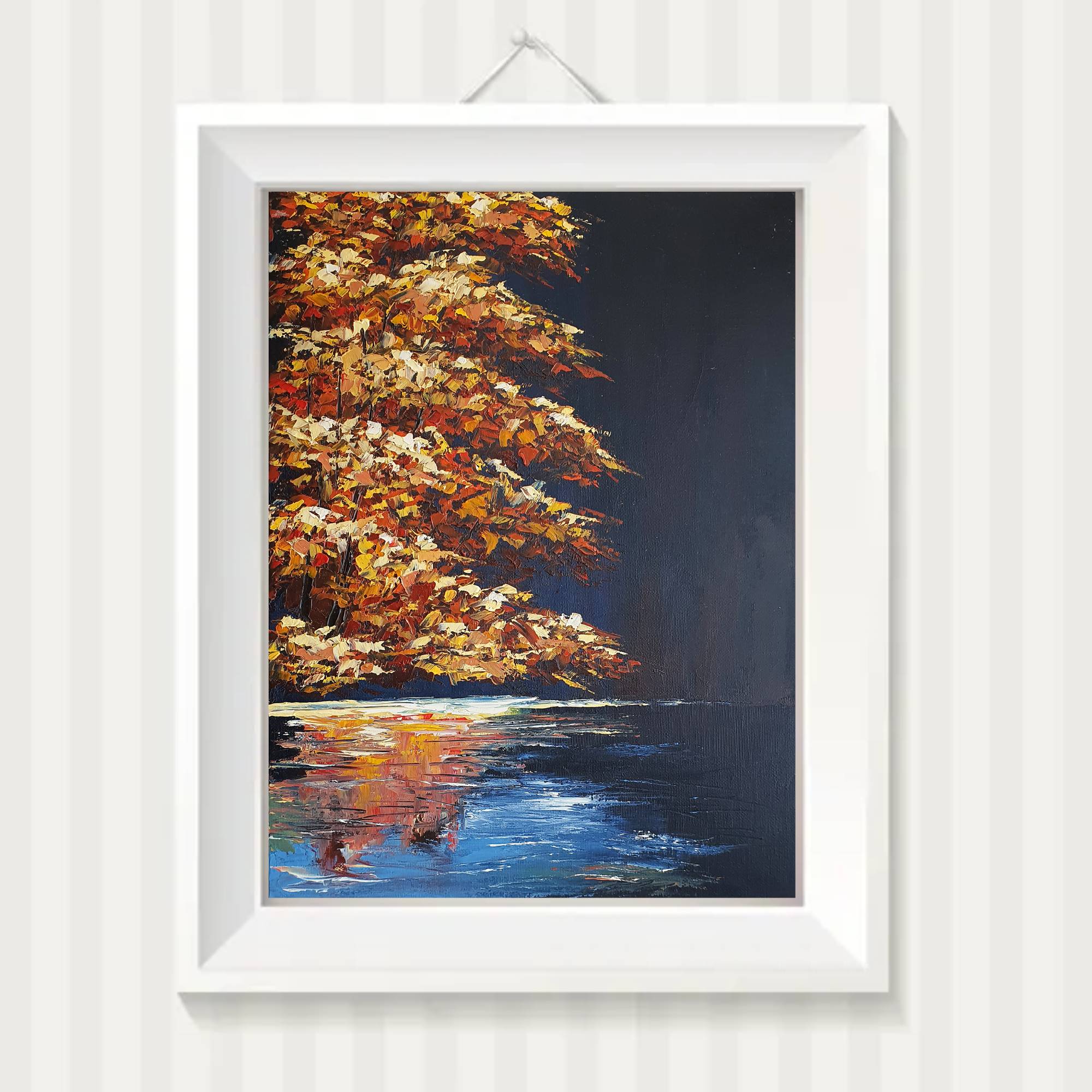 This impasto oil painting captures a tranquil moment of nature’s poetry. Against a deep black background, the fragment of a quiet lake shimmers with golden reflections. Above, heavy branches hang gracefully, covered with vibrant yellow leaves, their bold strokes echoing in the water below.
