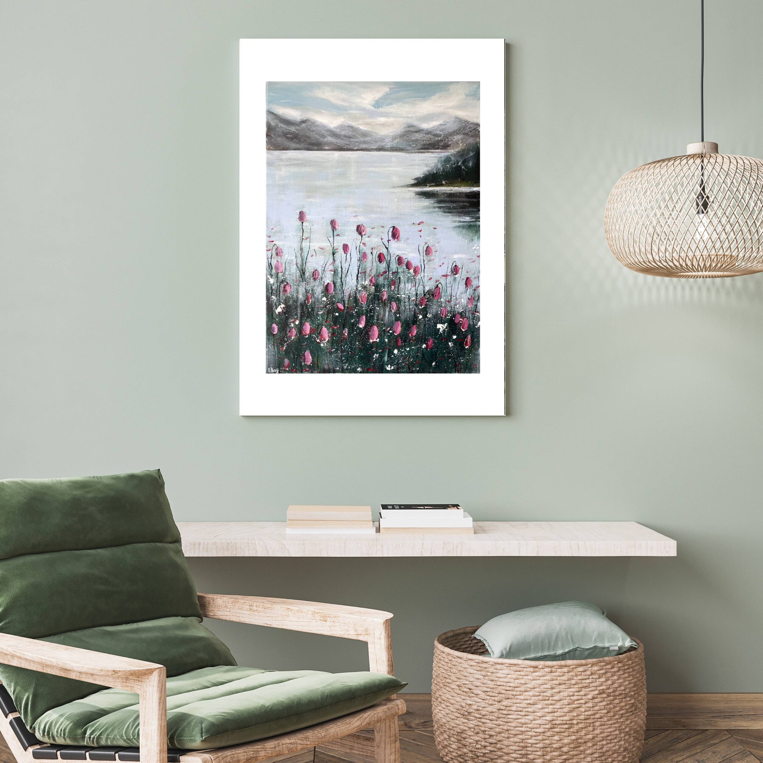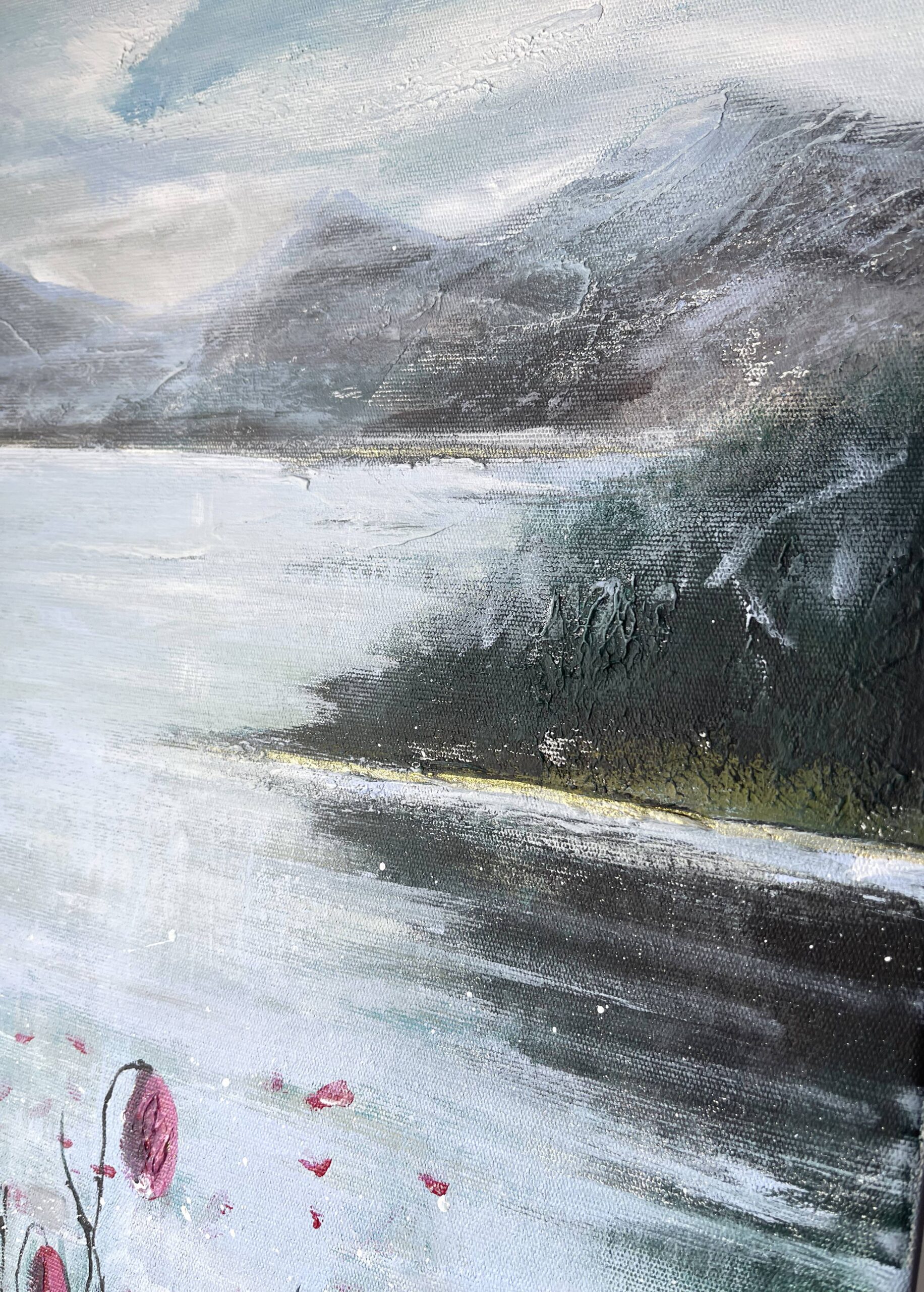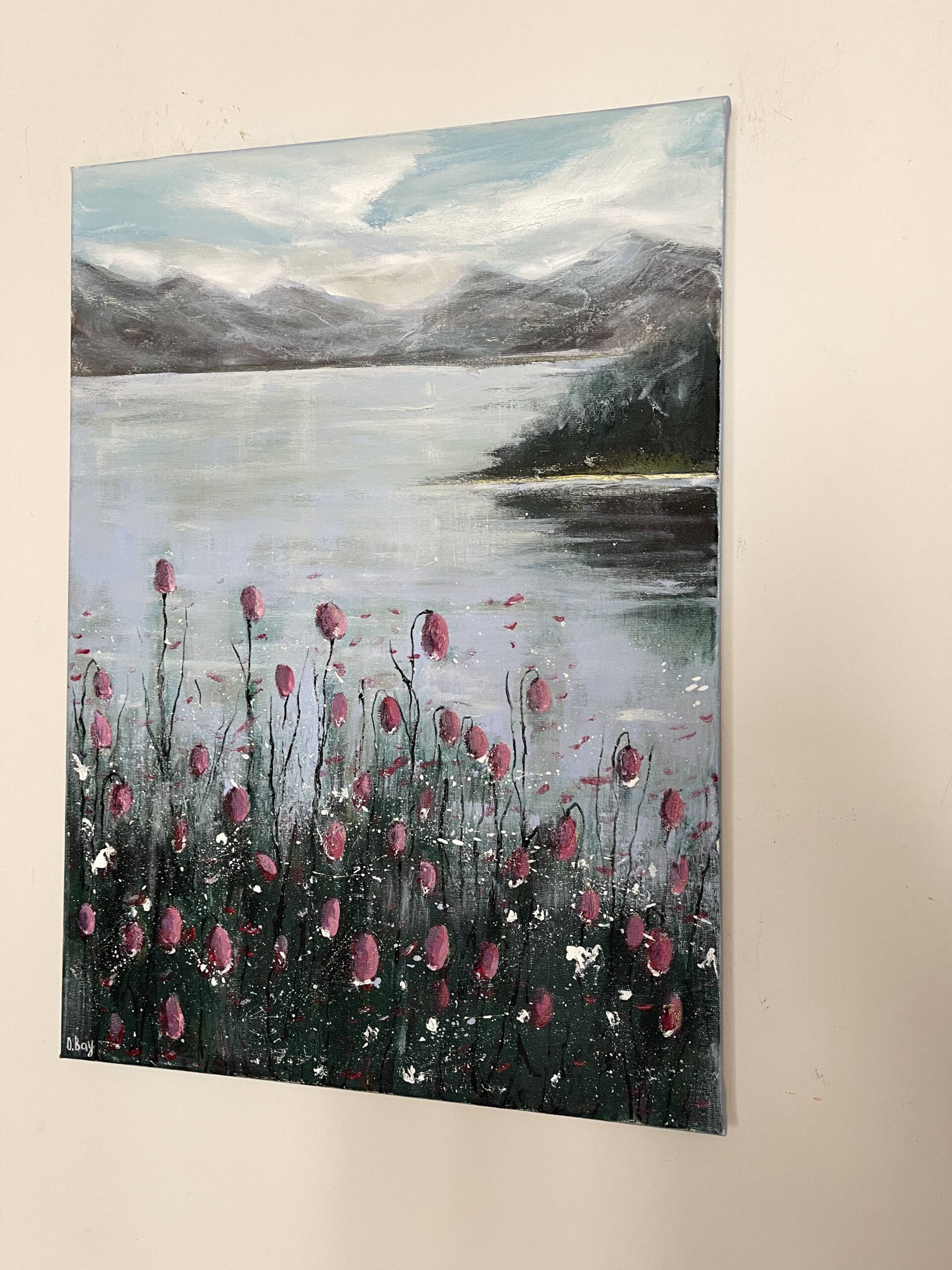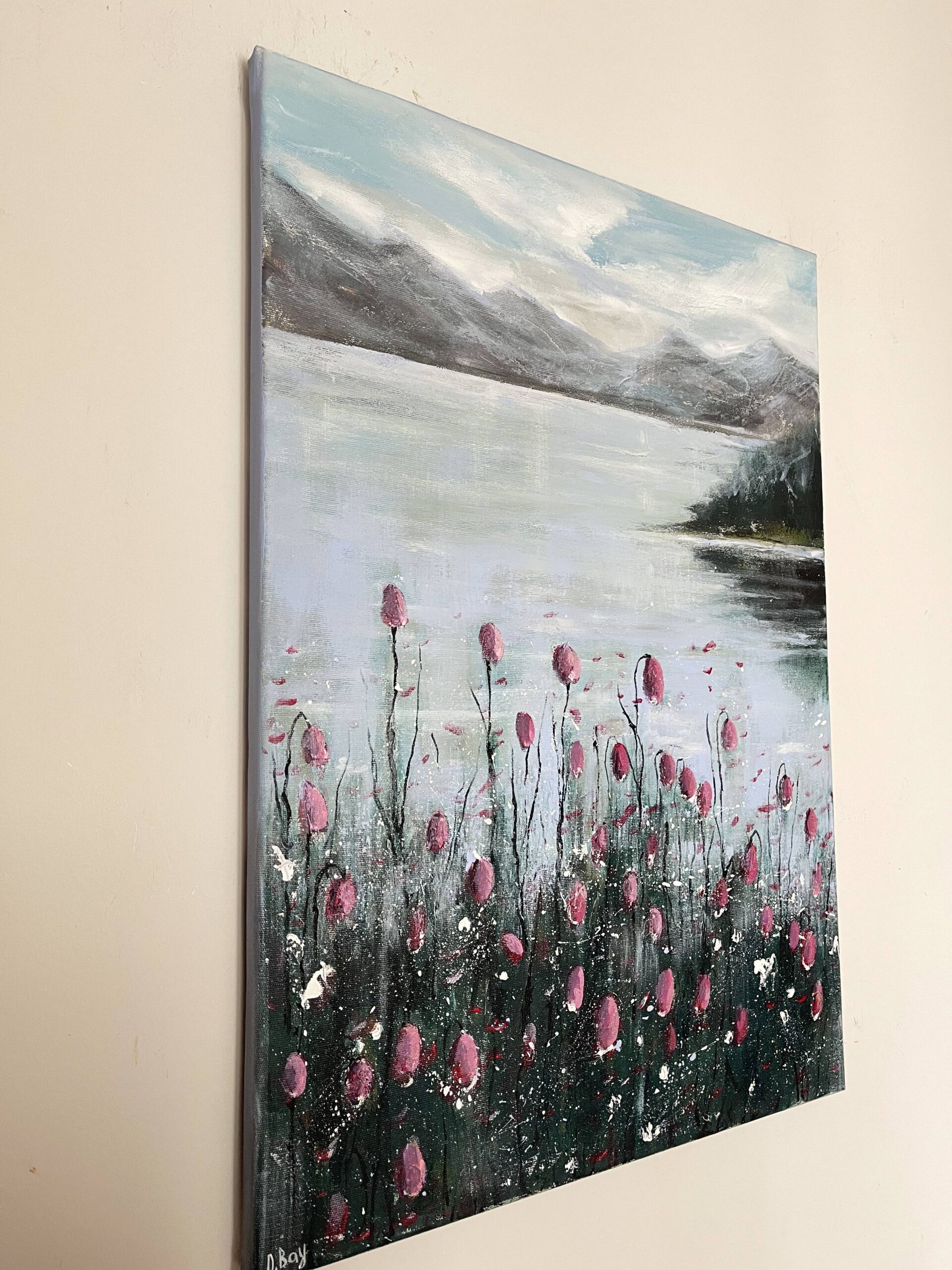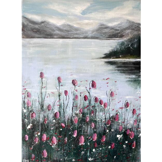 This modern acrylic painting captures early morning stillness by a mountain lake, where vivid pink flowers contrast with cool grey-blue tones of sky and water. The mirrored lake surface symbolizes balance, making it a work of calm art.