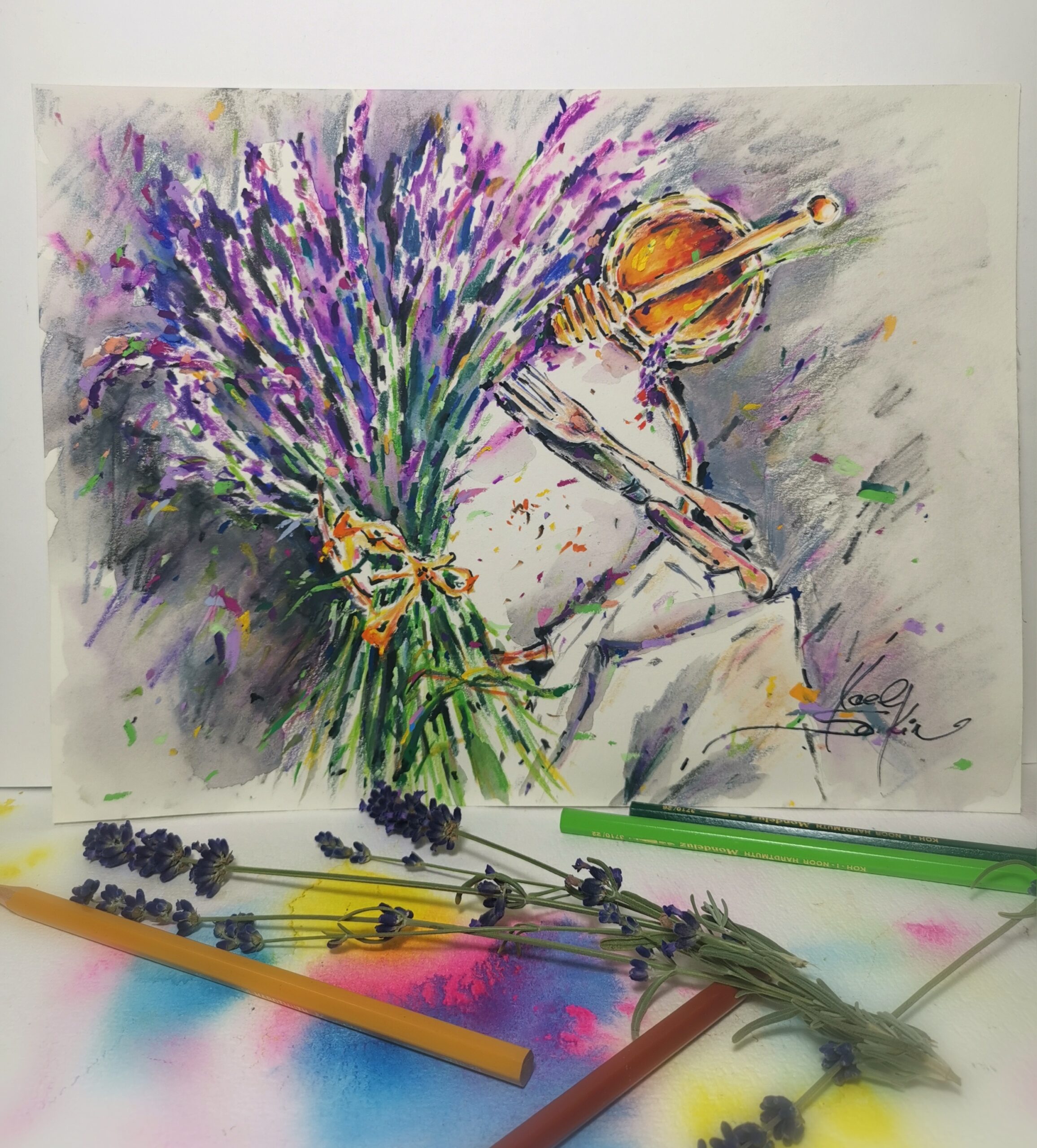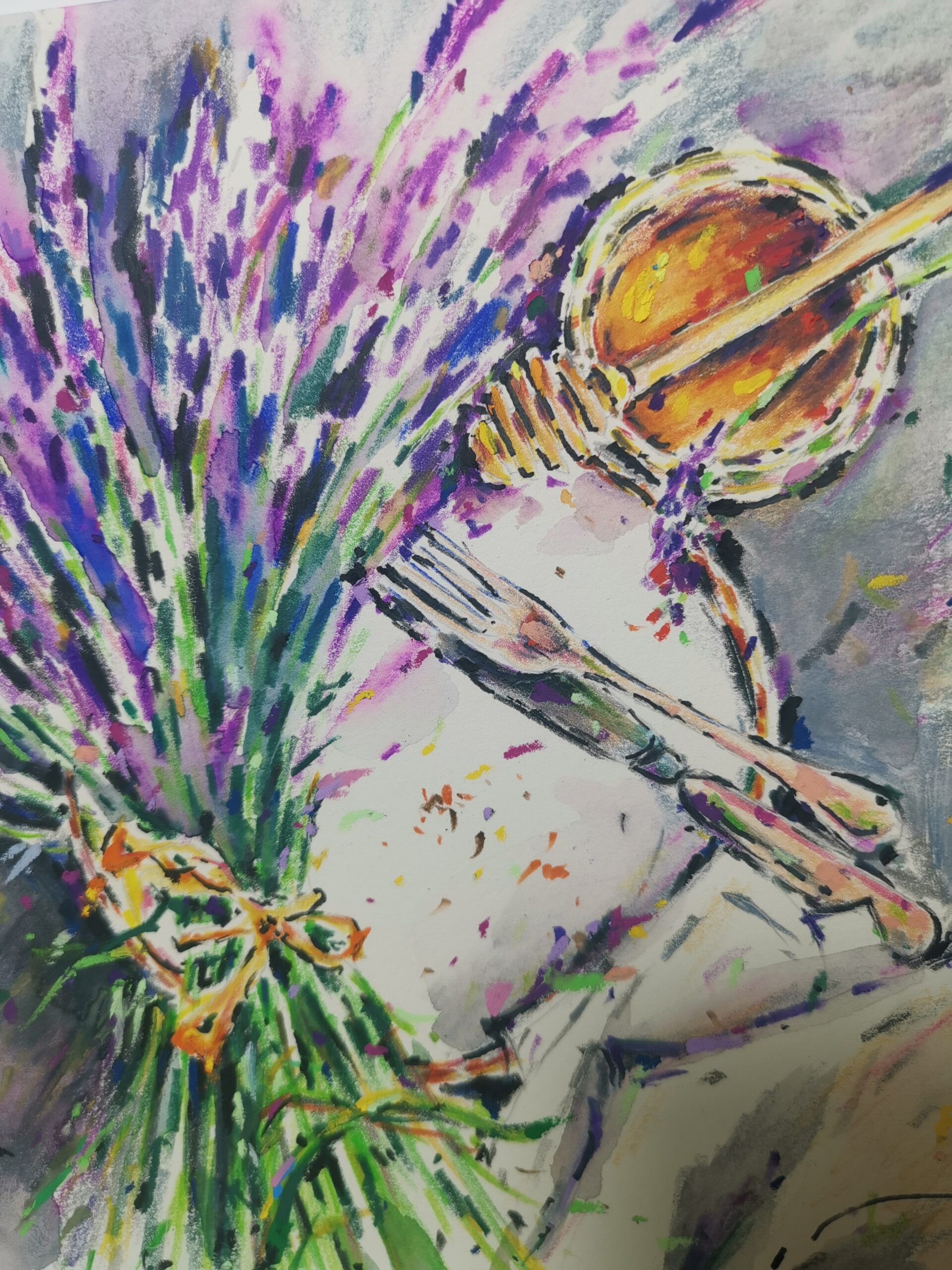 🖌️This delicate still life painting captures the cozy atmosphere of a summer morning – a fragrant bouquet of lavender, a jar of golden honey, and a small plate on a soft napkin. The gentle strokes of watercolor pencils create a luminous texture, blending freshness and warmth in perfect harmony.