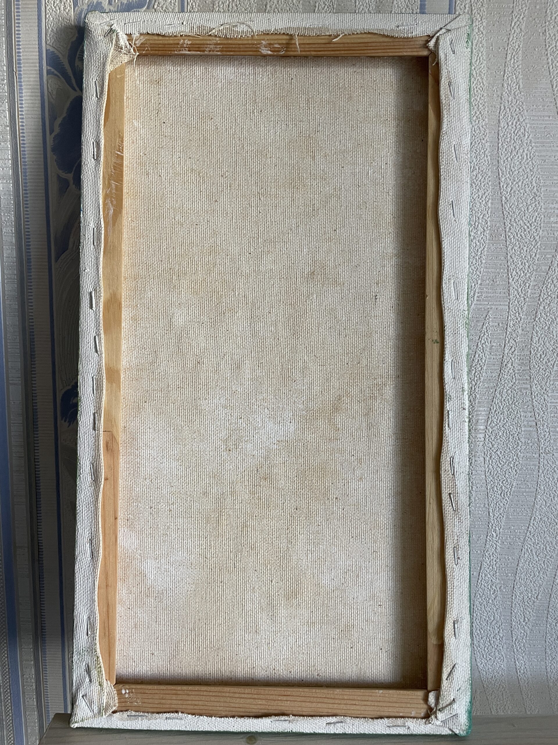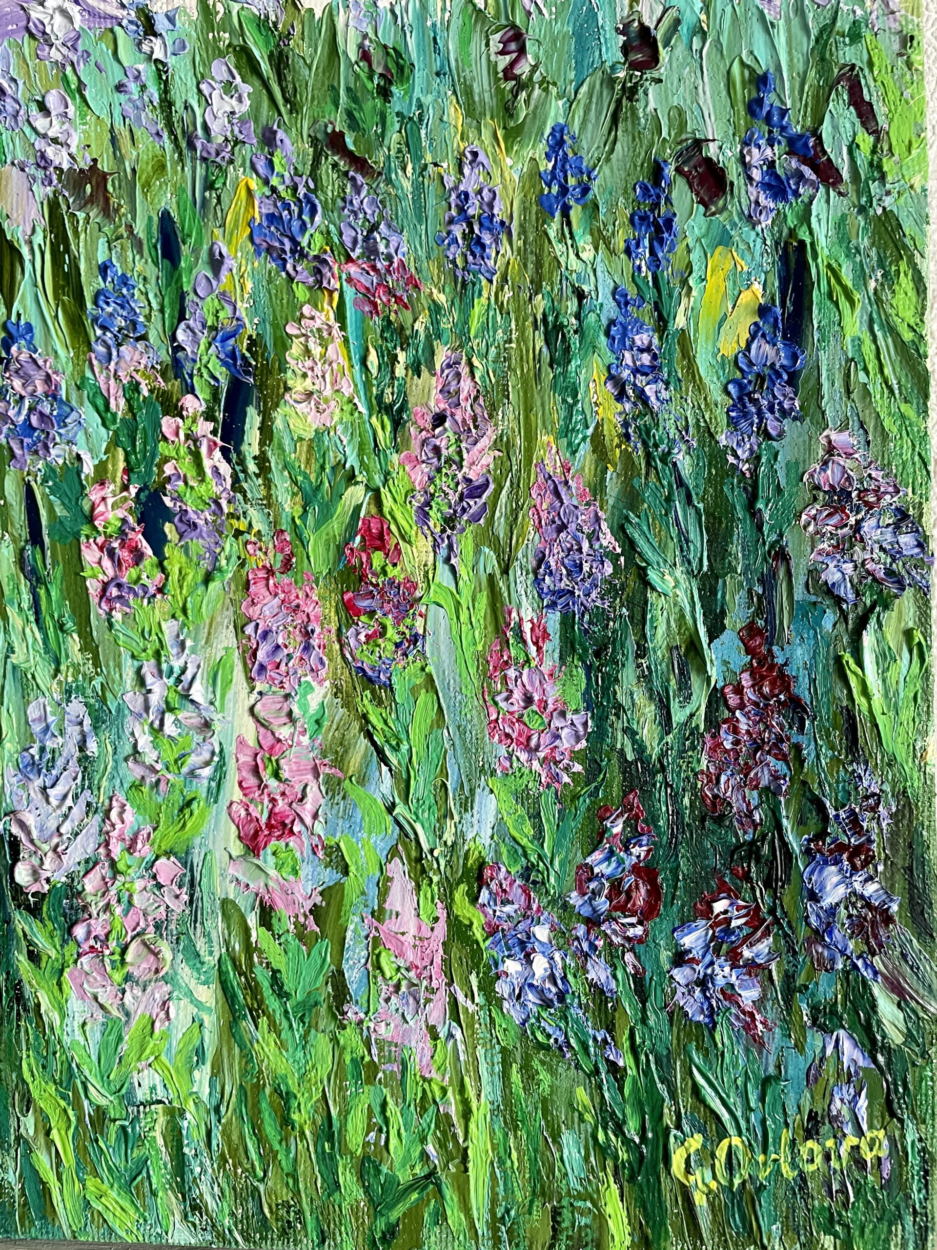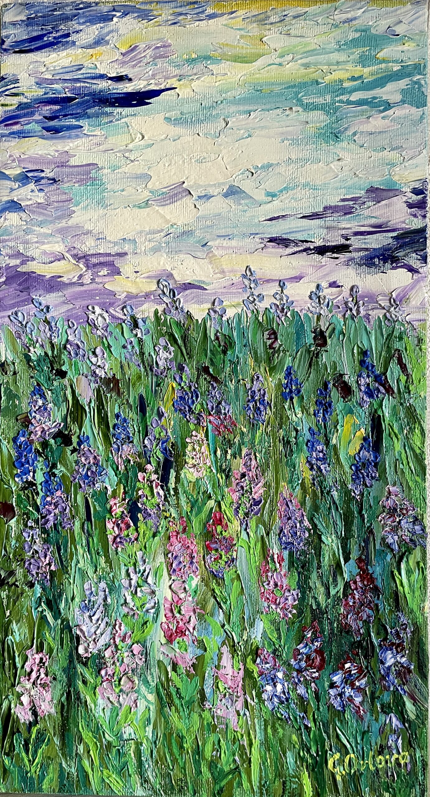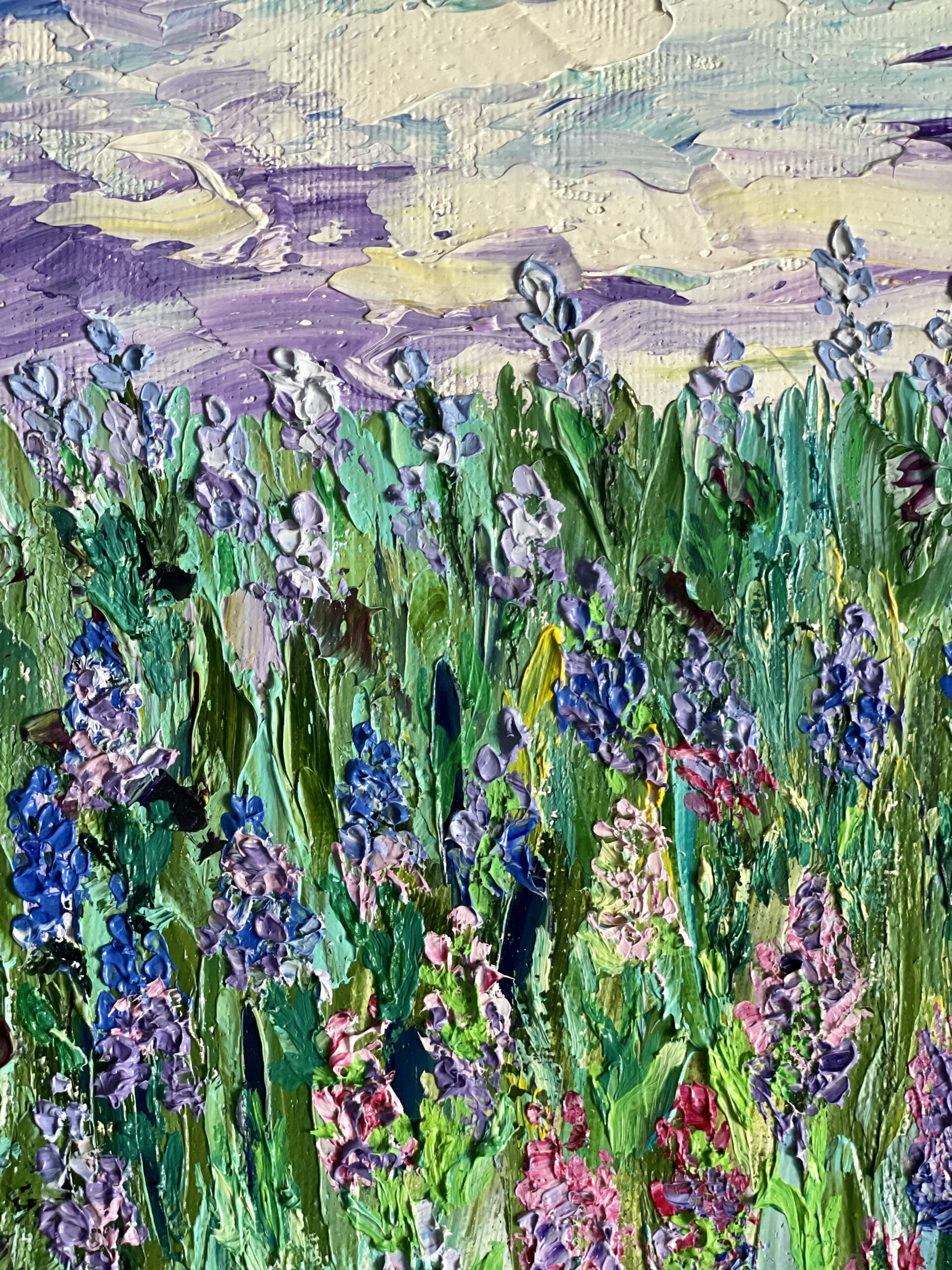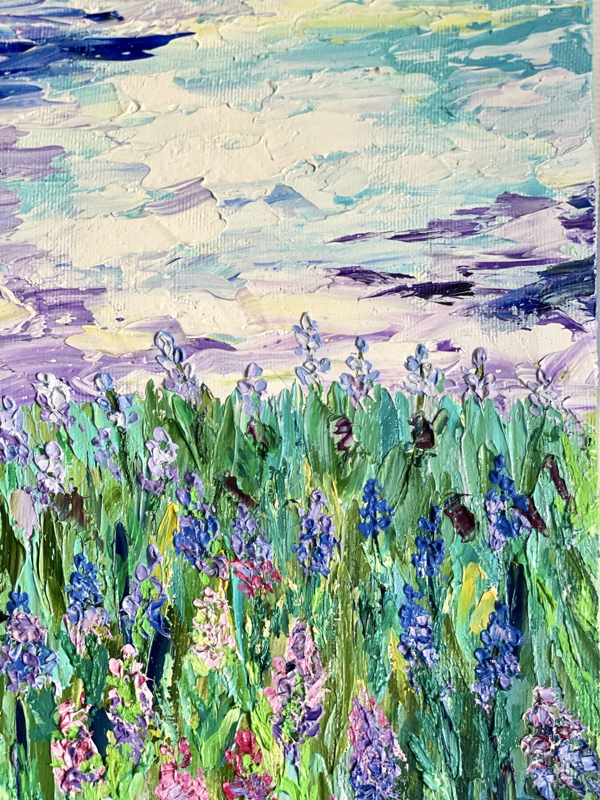 Hand-painted one-of-a- kind art to buy online, signed, vertical middle size 24×44 cm. Purple flowers of different shades with lush green leaves, combining with the same purple and blue in the sky and clouds. Made with a pallet-knife, modern abstract technique, thick texture pleasant to touch.