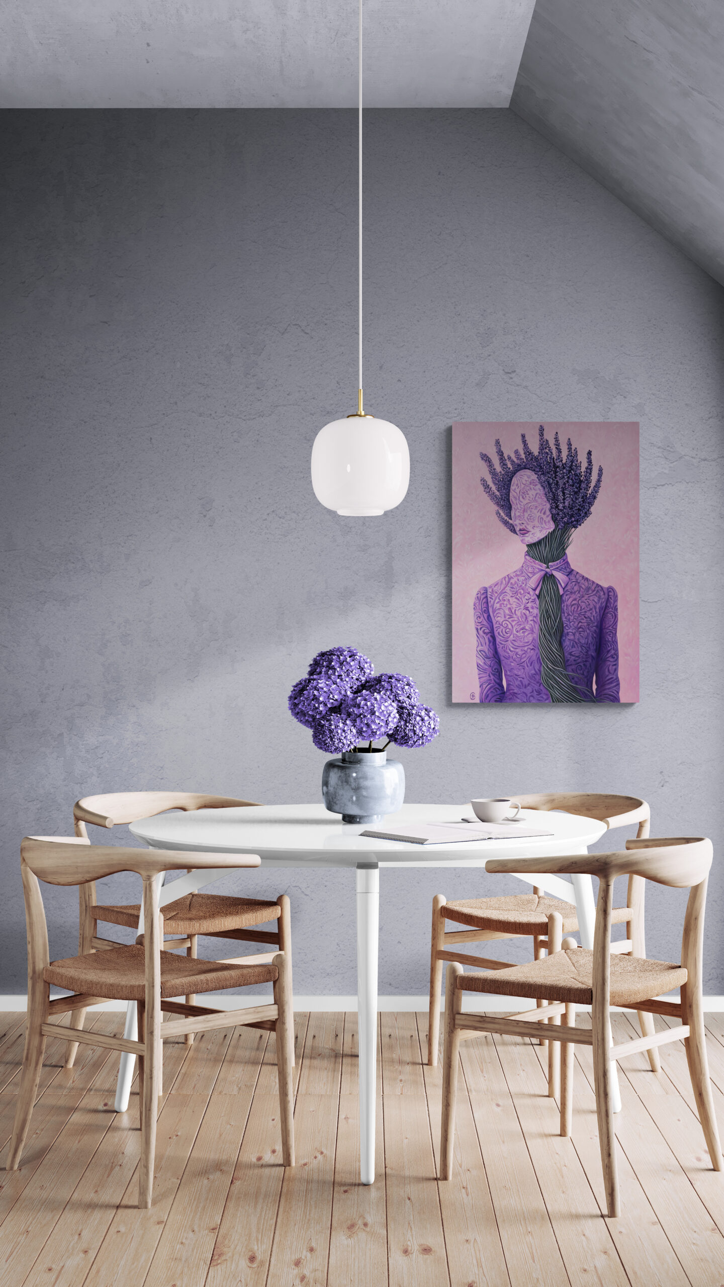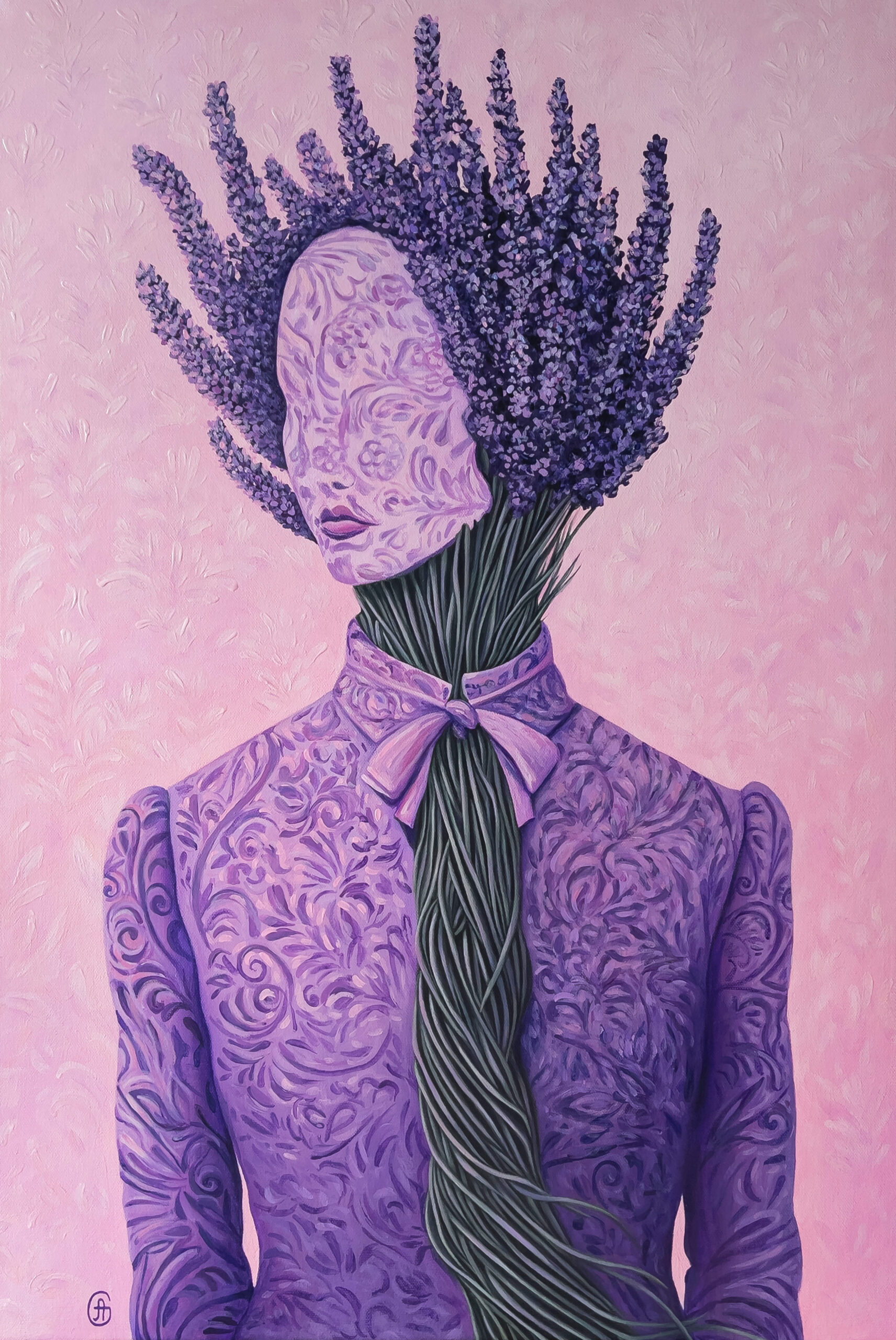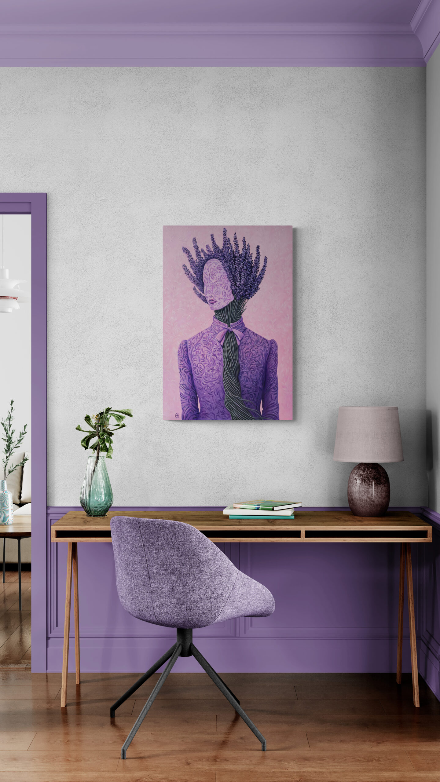 In Lavender Silence, the human form dissolves into nature. A bouquet becomes a crown, stems replace the neck, and the bow seals the voice. A soft rebellion, wrapped in peace.