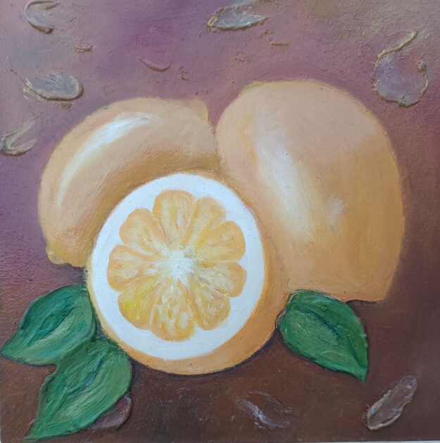 “Lemons on the Table” citrus fruits. Original 3D oil painting on fiberboard, 20×20 cm (7.6×7.6 inches)