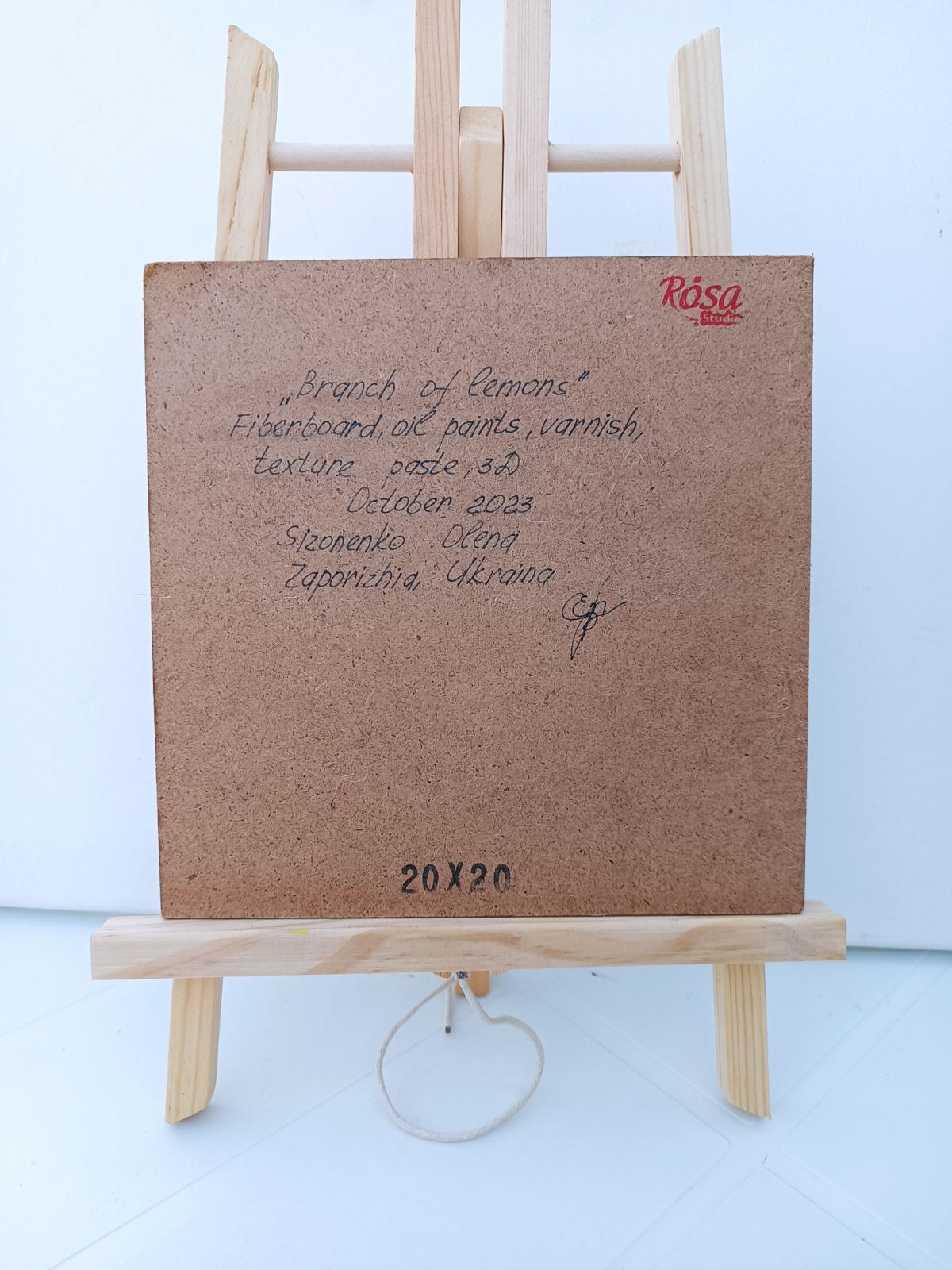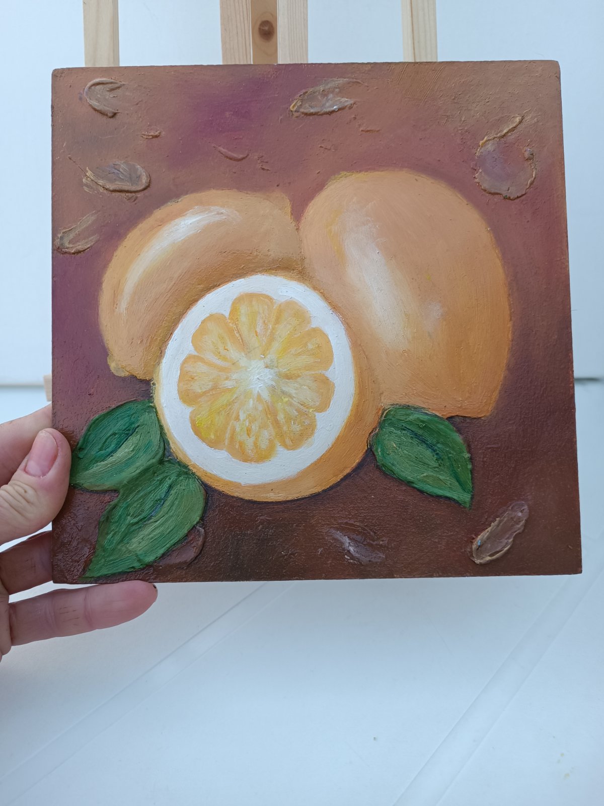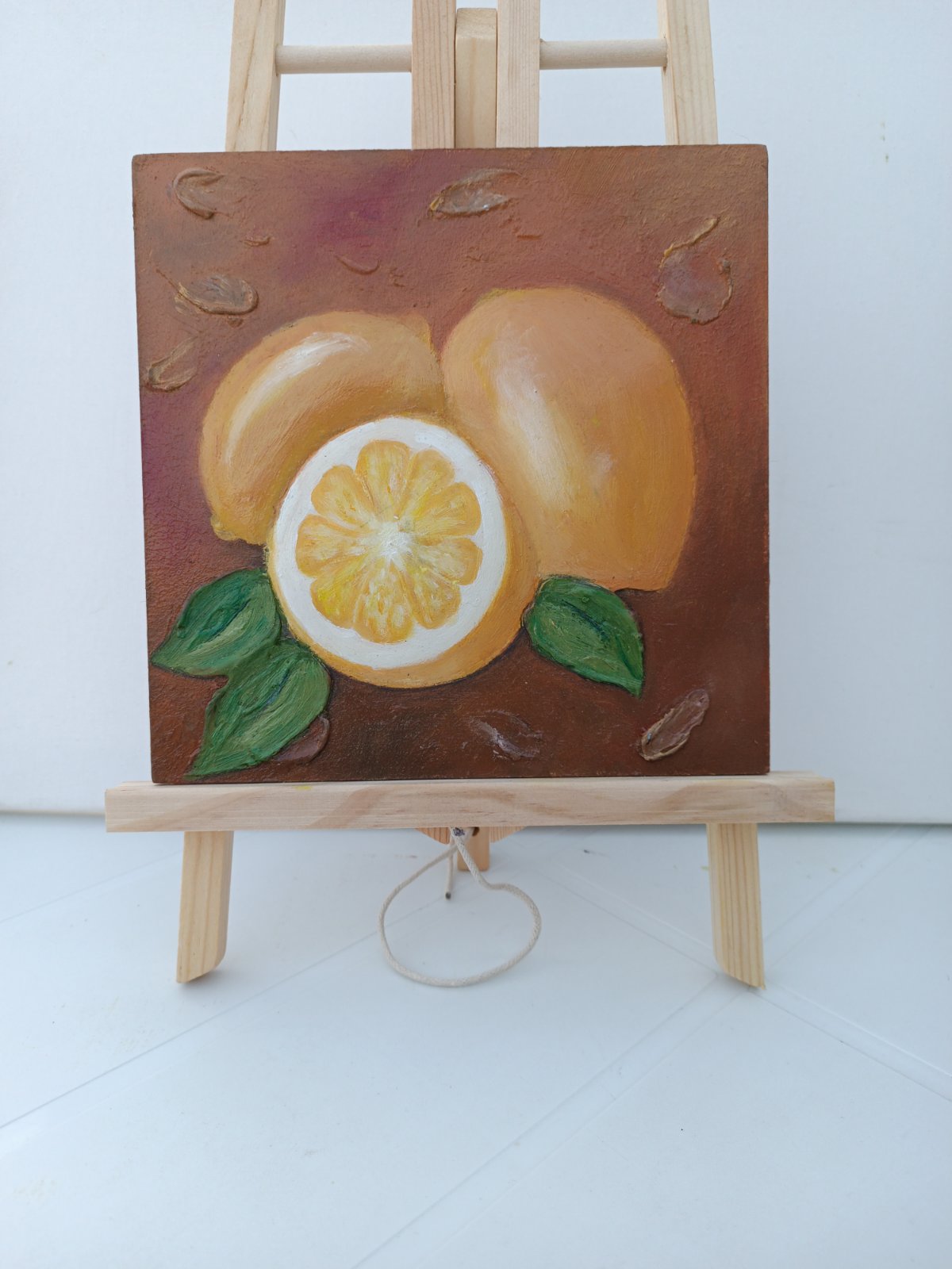 "Lemons on the Table" citrus fruits. Original 3D oil painting on fiberboard, 20x20 cm (7.6x7.6 inches). Wall art, gift. Color may vary slightly on monitors. Materials: oil, putty with marble chips, fiberboard.