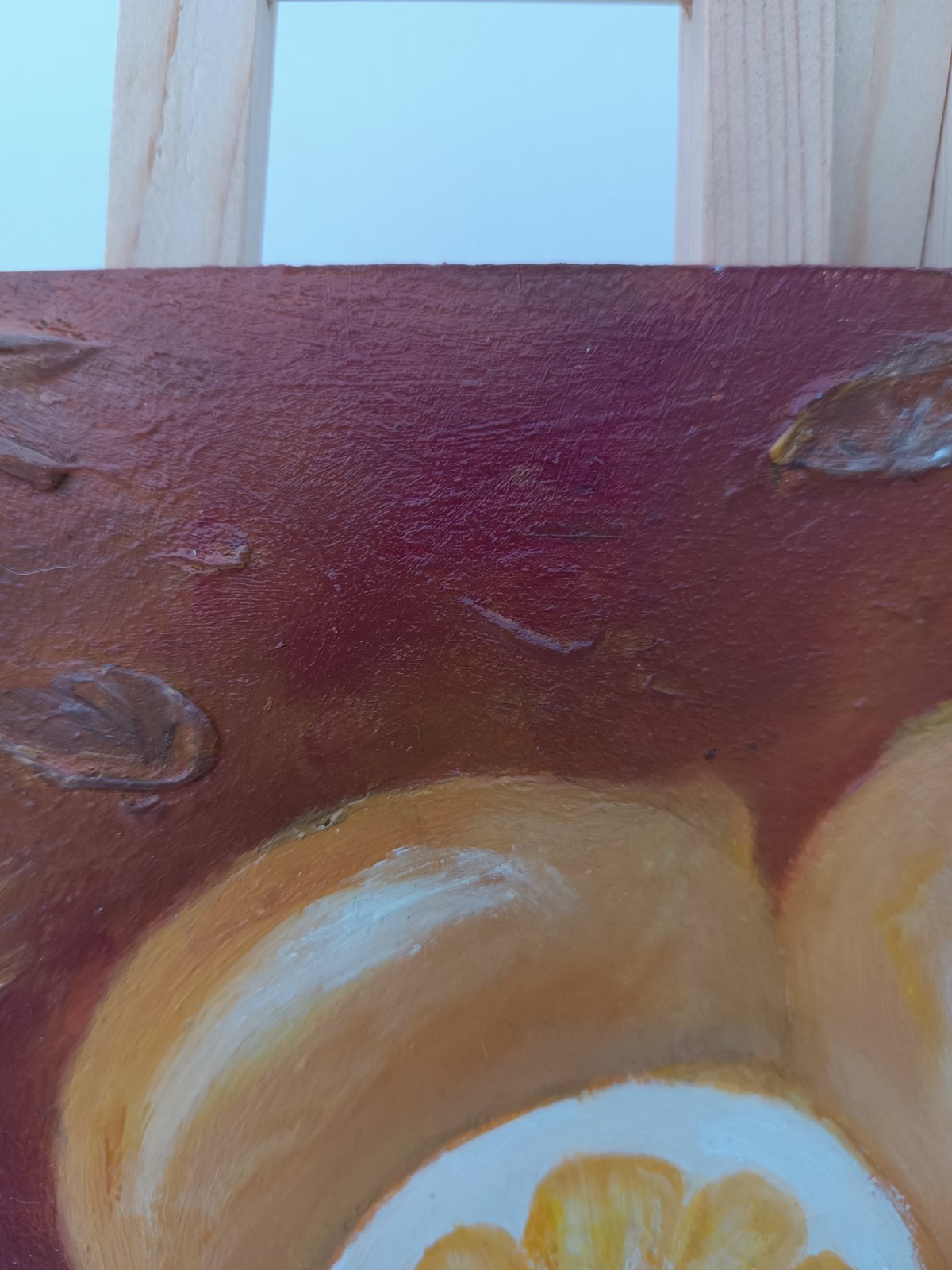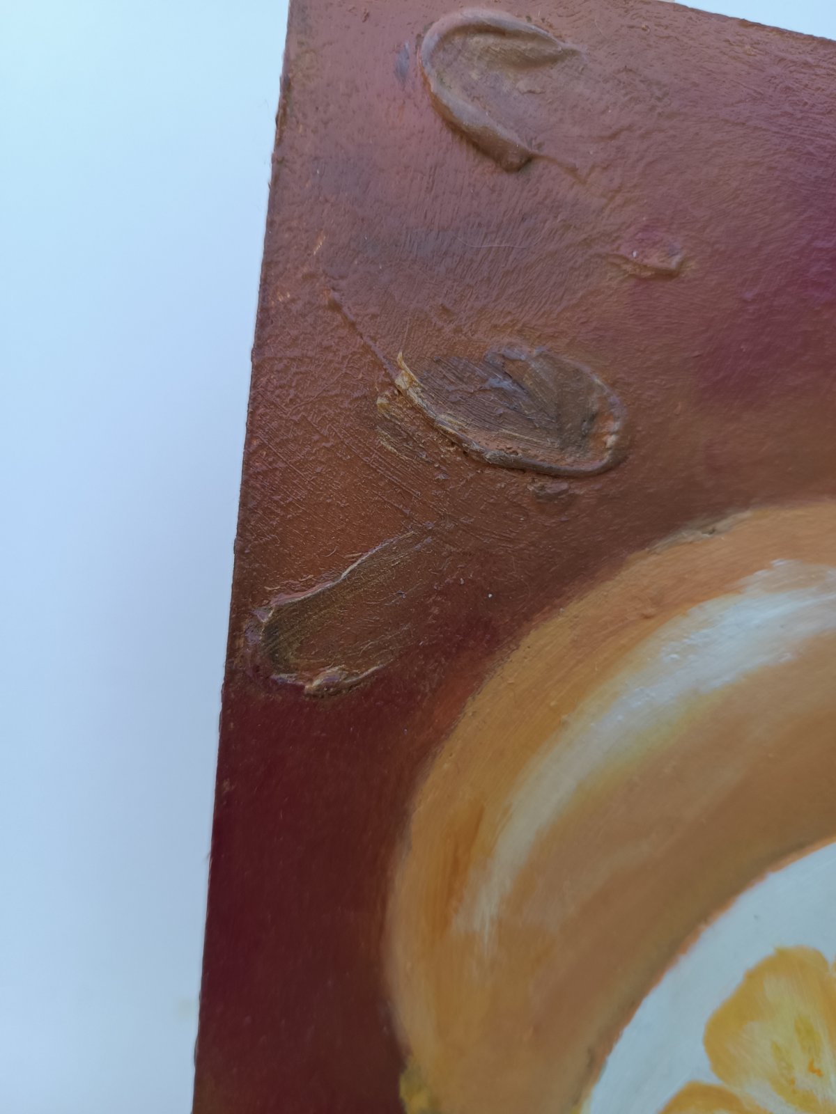 Dimensions: 20x20 cm (7.6x7.6 inches). Materials: oil, putty with marble chips, fiberboard.