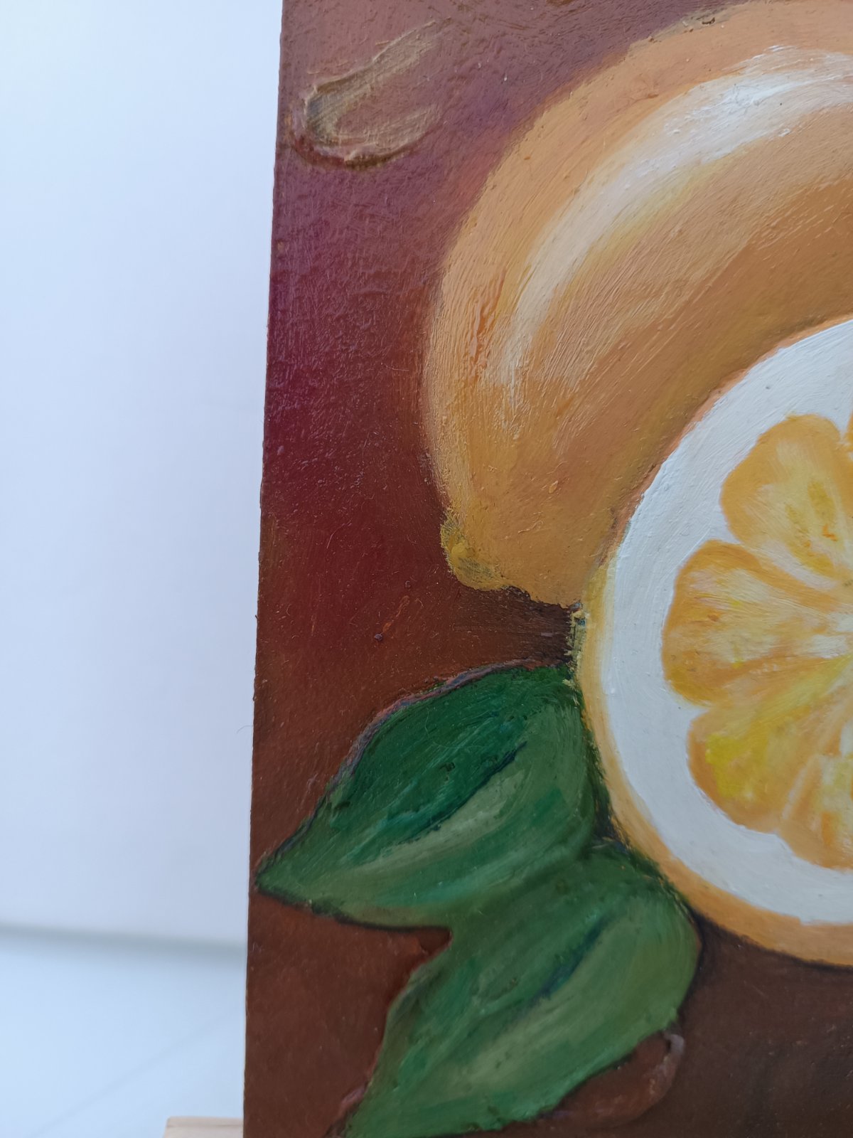 "Lemons on the Table" citrus fruits. Original 3D oil painting on fiberboard. Wall art, gift. Color may vary slightly on monitors.