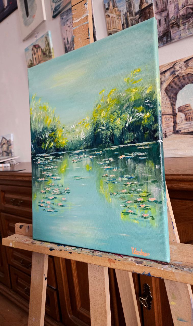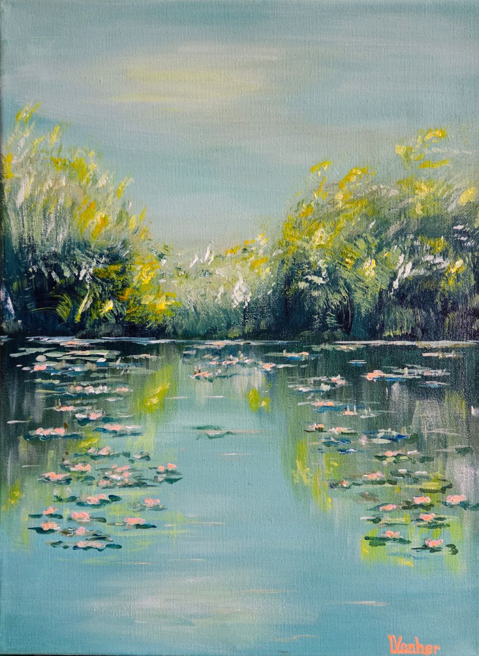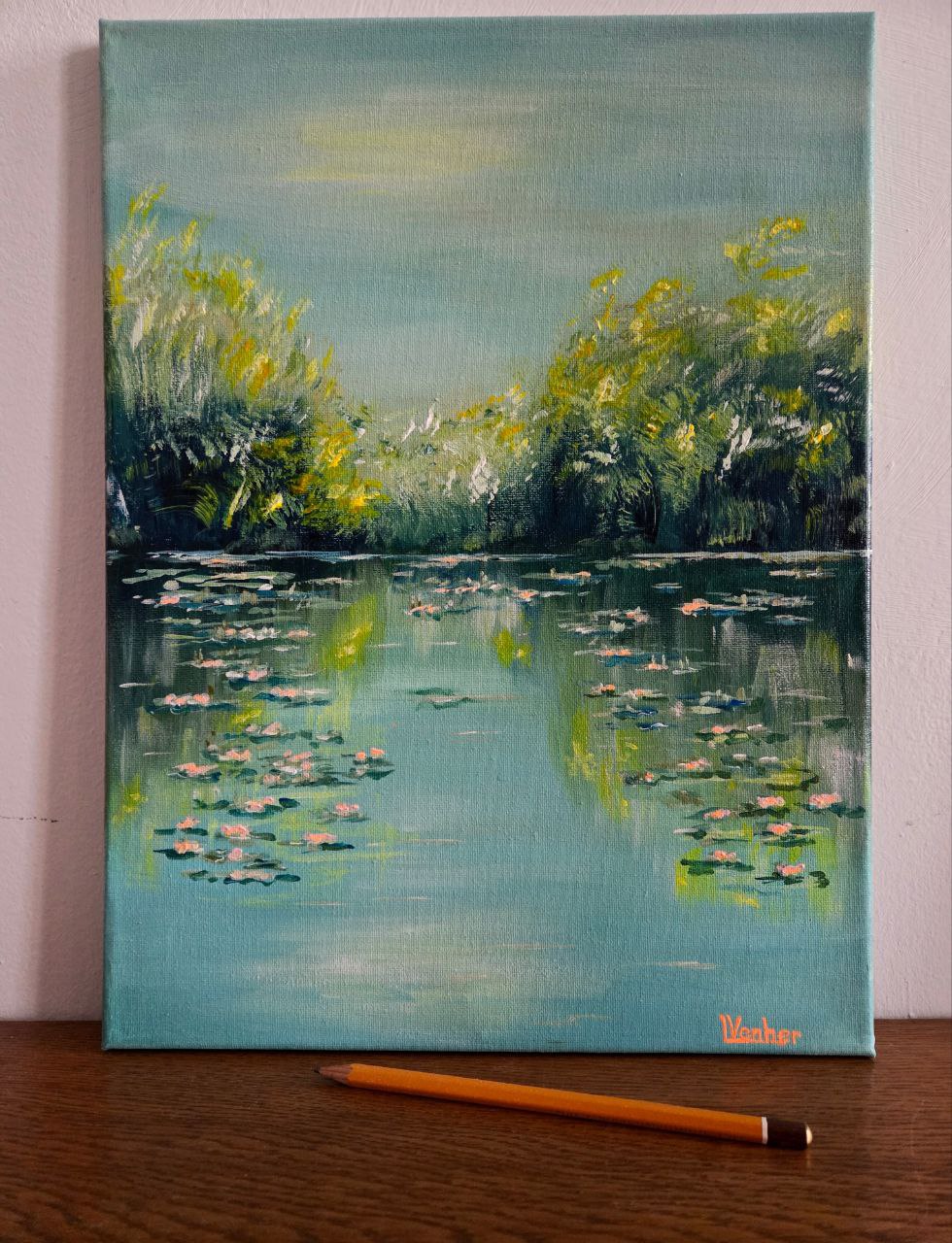 The painting depicts a peaceful landscape of a lake covered with a water surface strewn with white and pinkish lilies. The petals of the flowers sway delicately on the water, reflecting a soft light, as if gently illuminated by the sun. The surface of the lake is calm, almost mirror-like, reflecting the sky and the shadow of the coastal thickets.