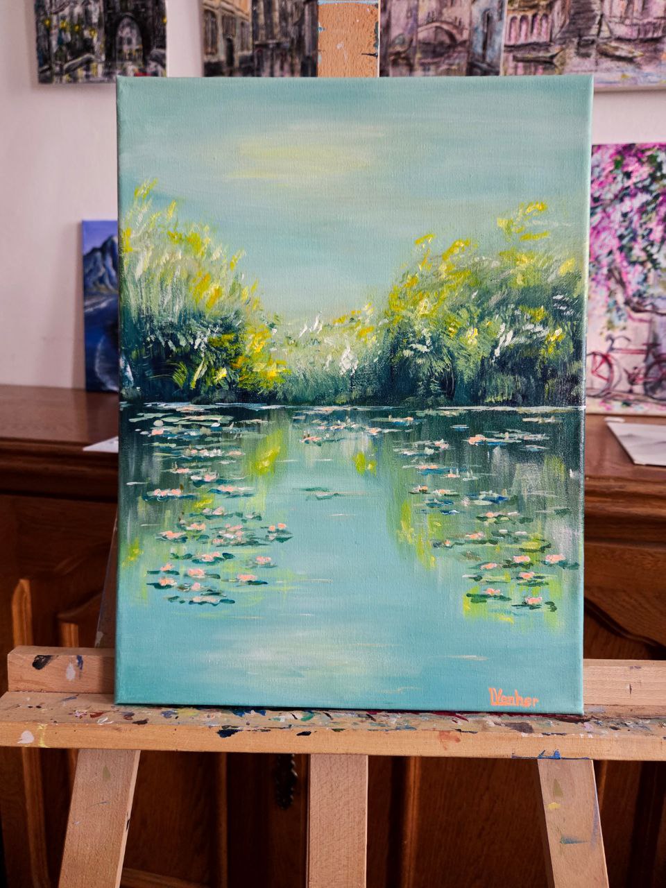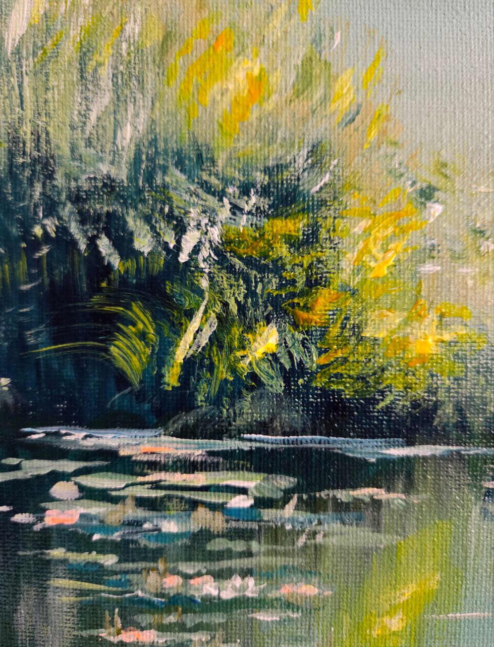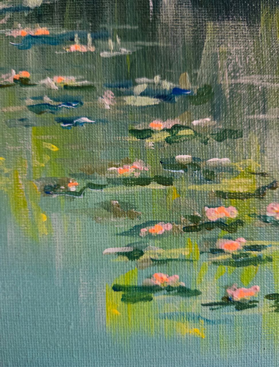 The painting depicts a peaceful landscape of a lake covered with a water surface strewn with white and pinkish lilies. The petals of the flowers sway delicately on the water, reflecting a soft light, as if gently illuminated by the sun. The surface of the lake is calm, almost mirror-like, reflecting the sky and the shadow of the coastal thickets.