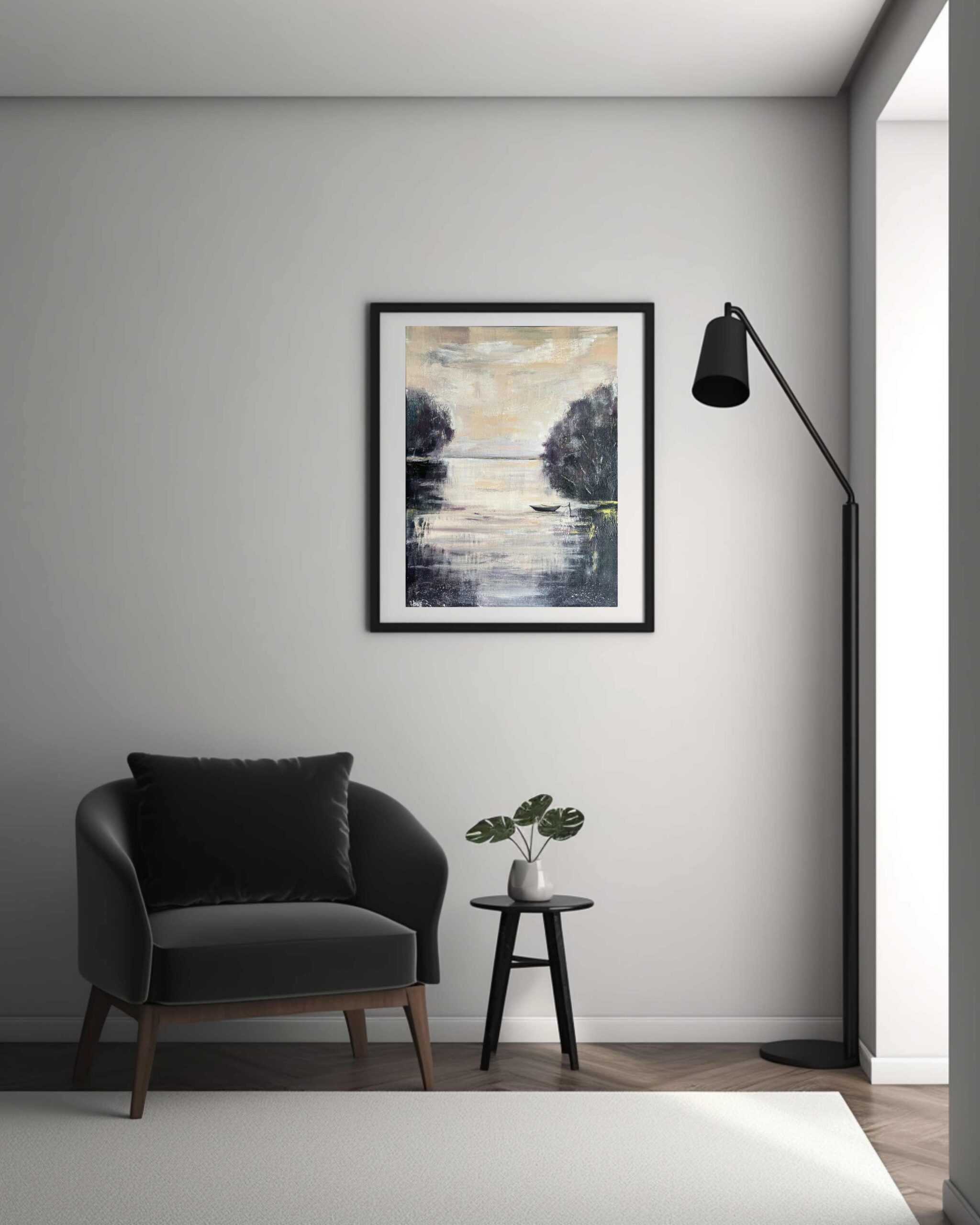 Evening Melody is a modern acrylic painting of dusk, where a quiet boat rests on still waters framed by shadowy trees. Soft tones of burgundy beige, and grey create a reflective mood, a work of calm art that feels dreamlike and serene.