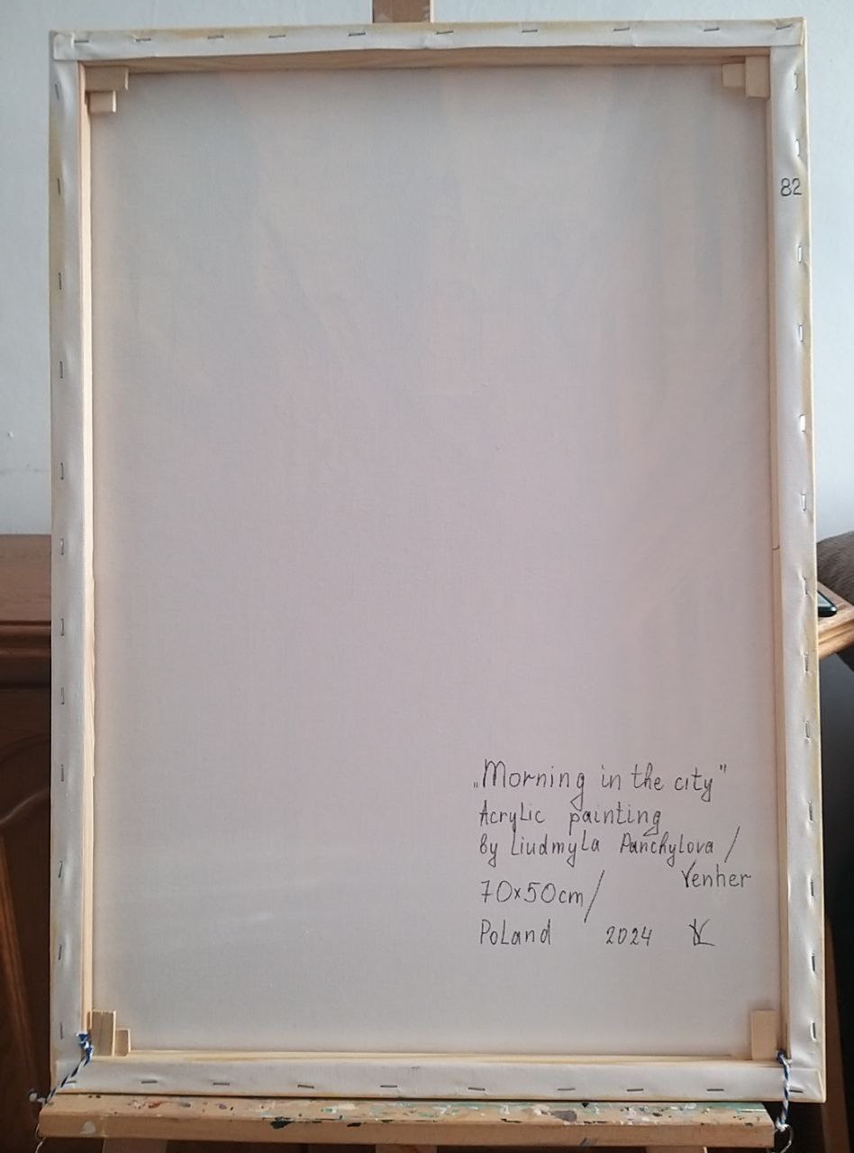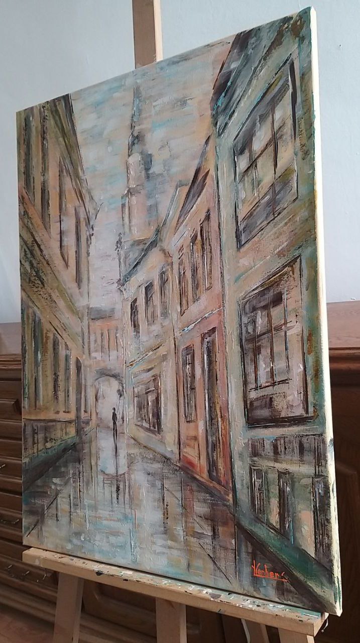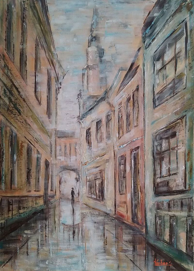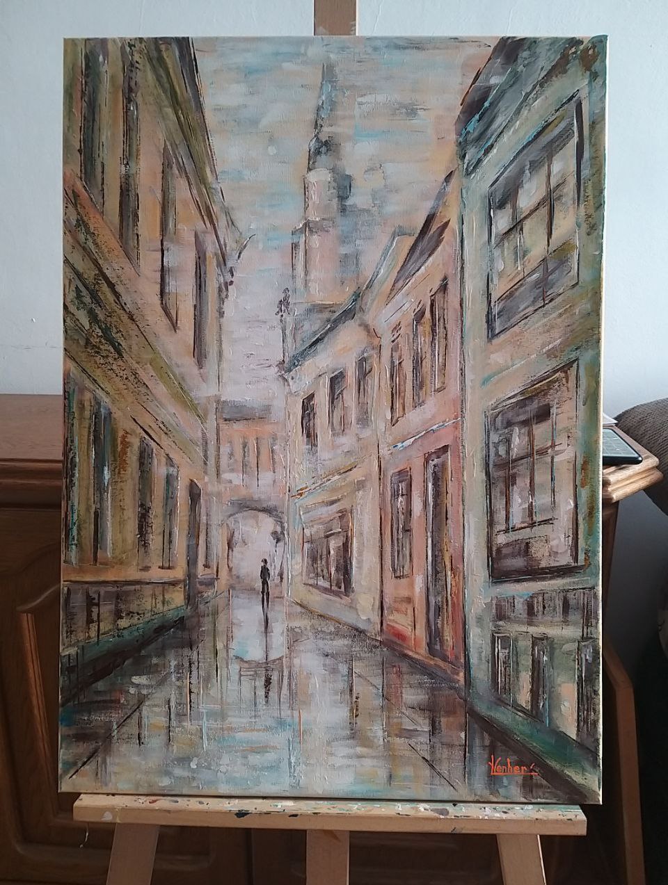 The painting depicts a narrow street in the old town in the early morning hours after the rain. The stone pavement reflects the light of the sky and the facades of the houses. The air is clear and fresh.
