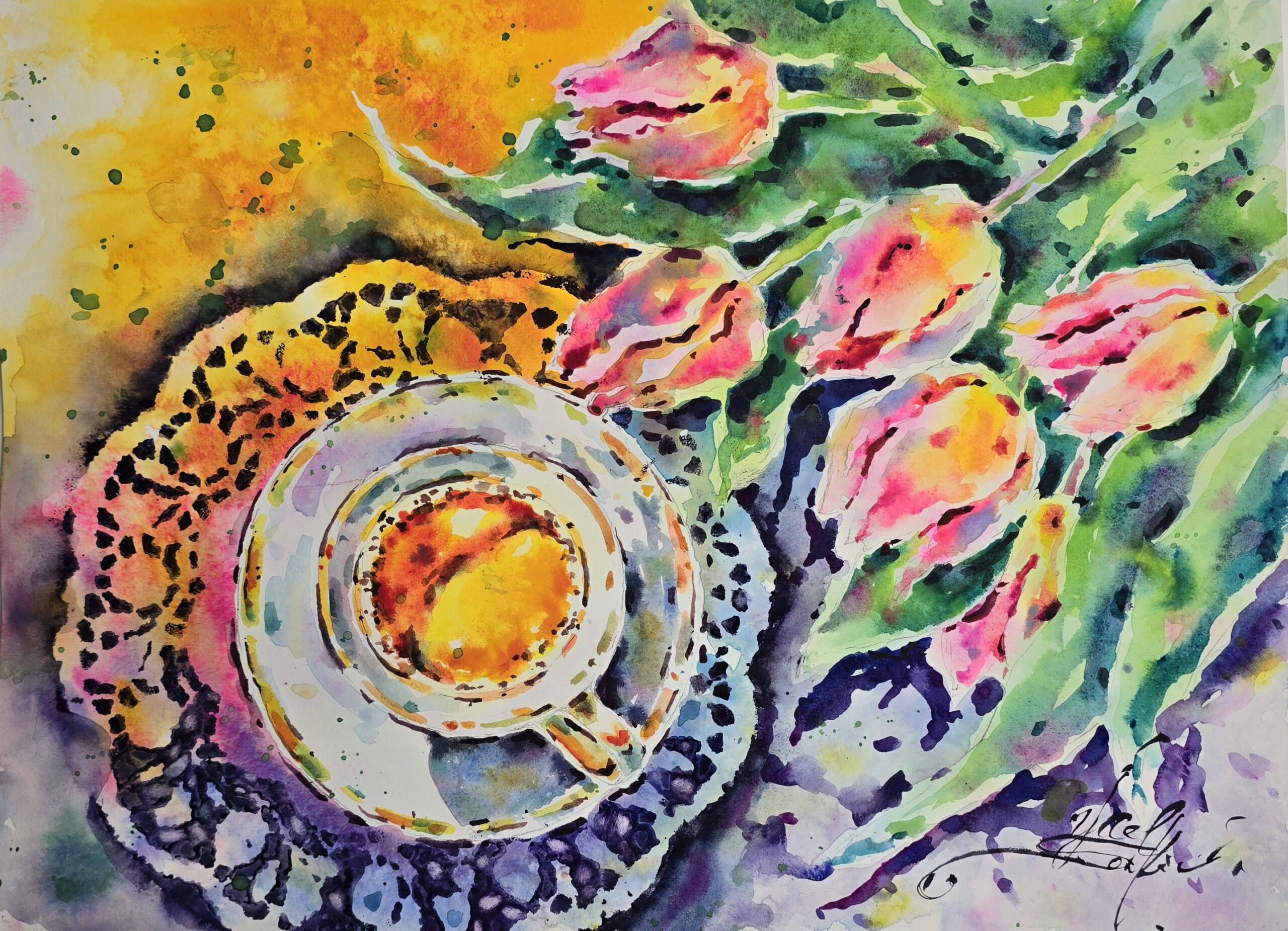 🌸“Morning Vibes” is an original watercolor painting that celebrates the beauty of a new day. A delicate cup of coffee, surrounded by blooming pink tulips, is painted in vibrant, joyful tones that bring warmth and positivity. The play of colors and textures creates a sense of coziness, freshness, and morning inspiration.
