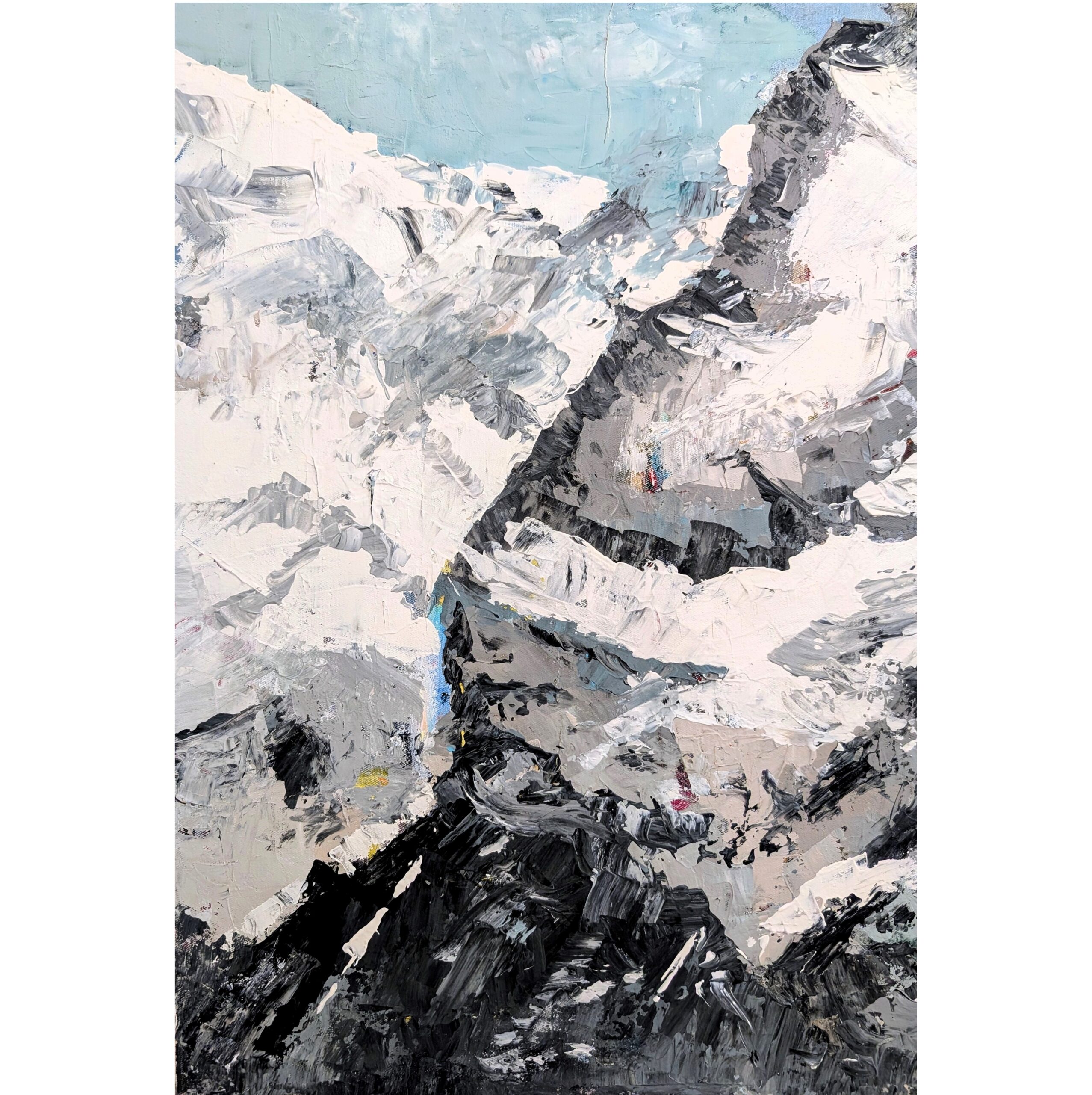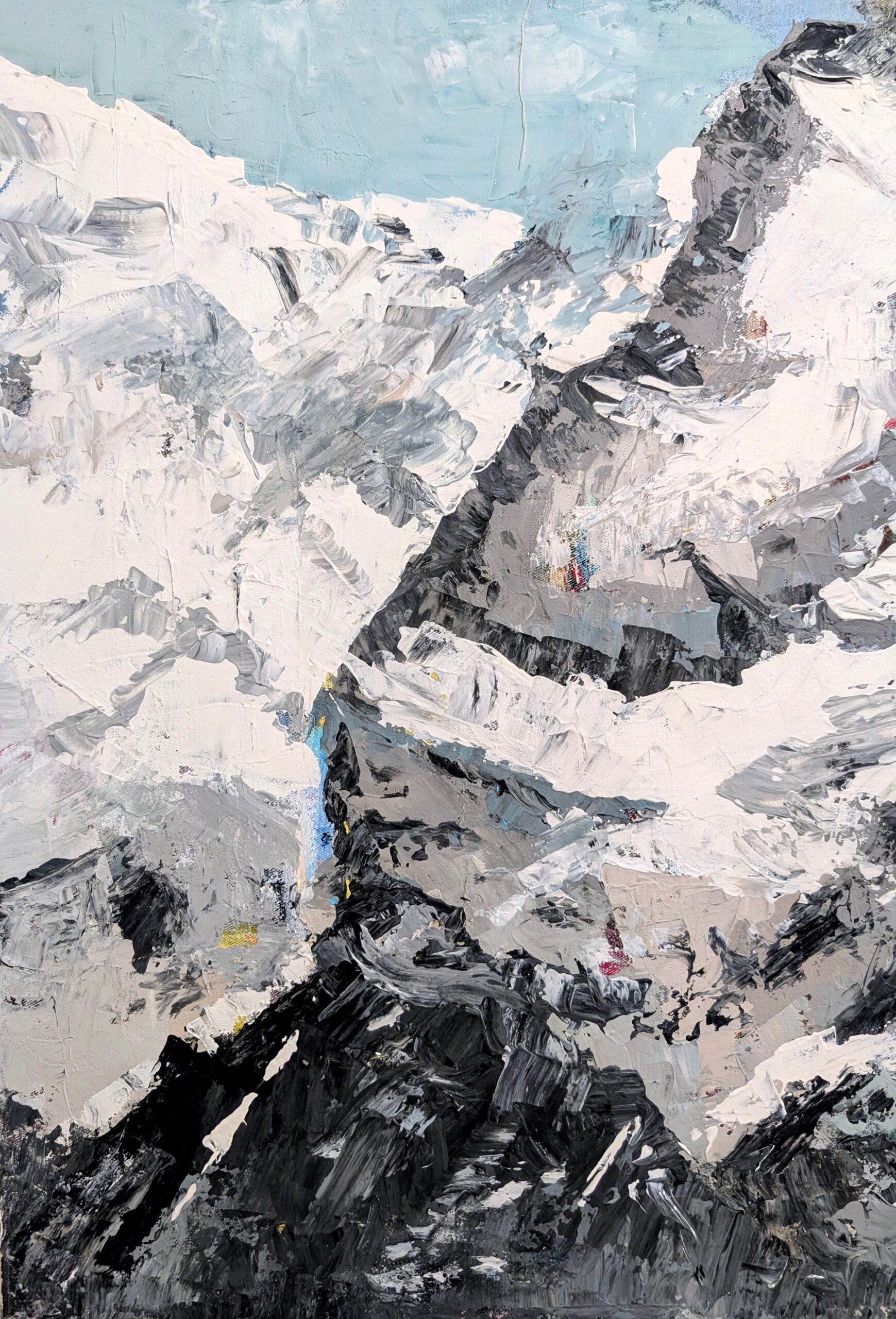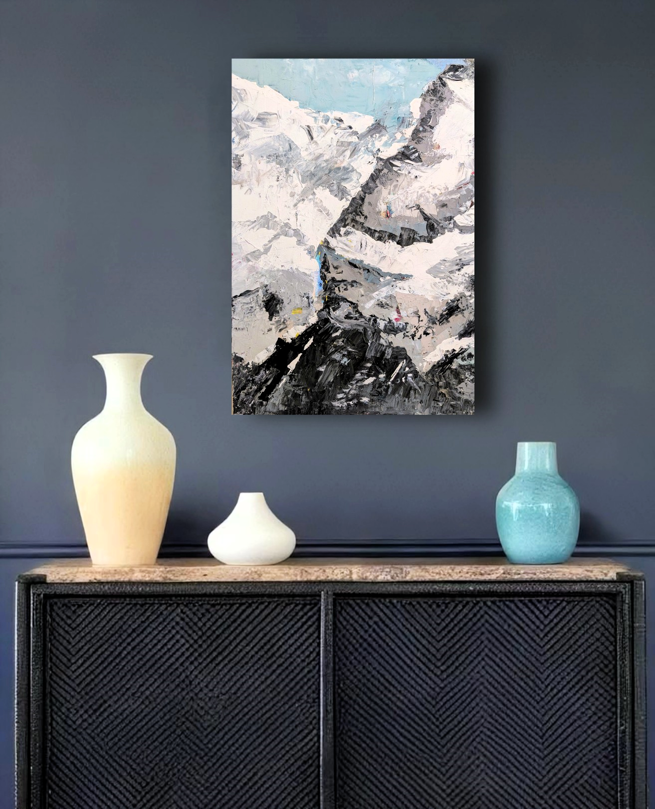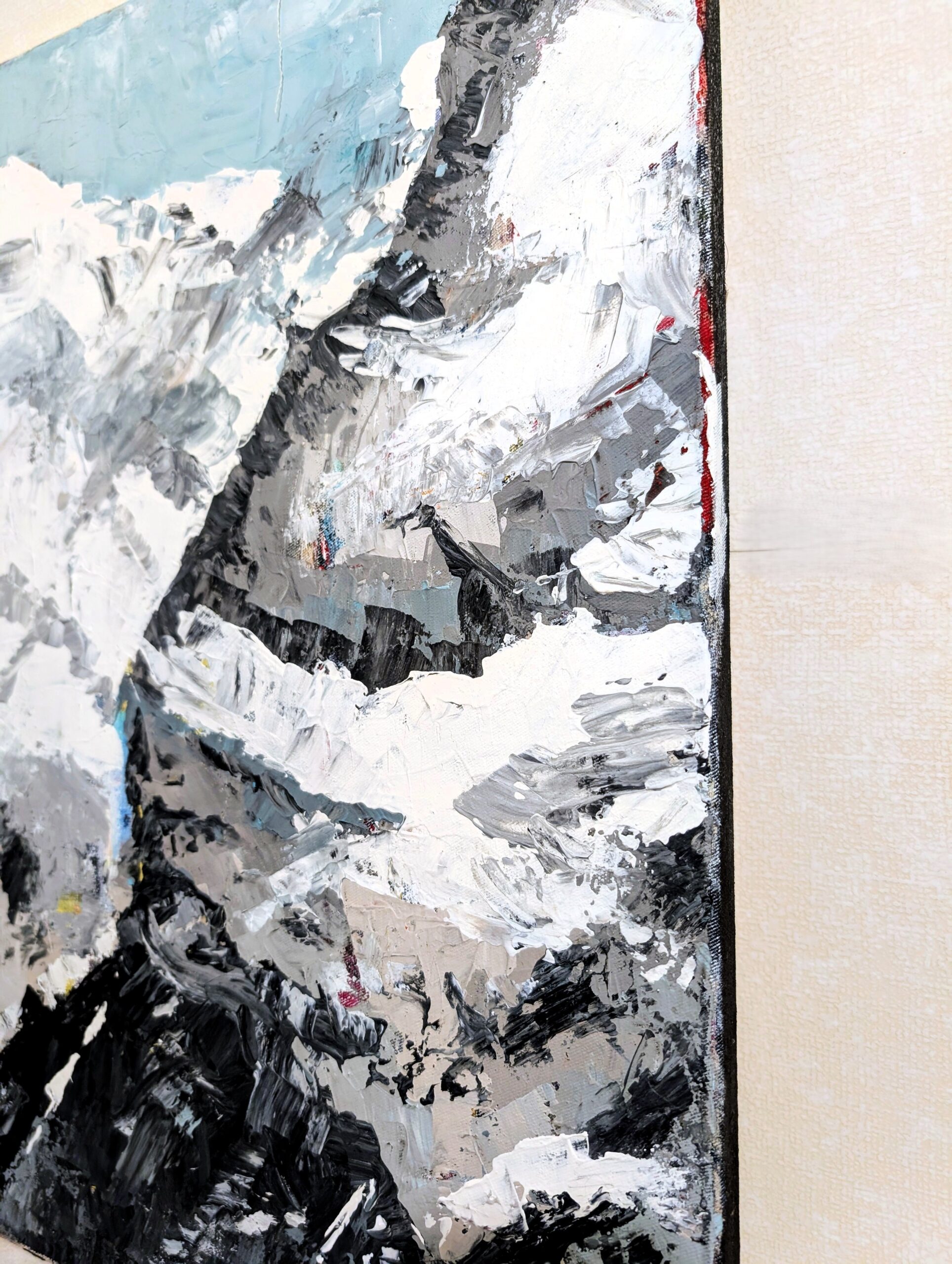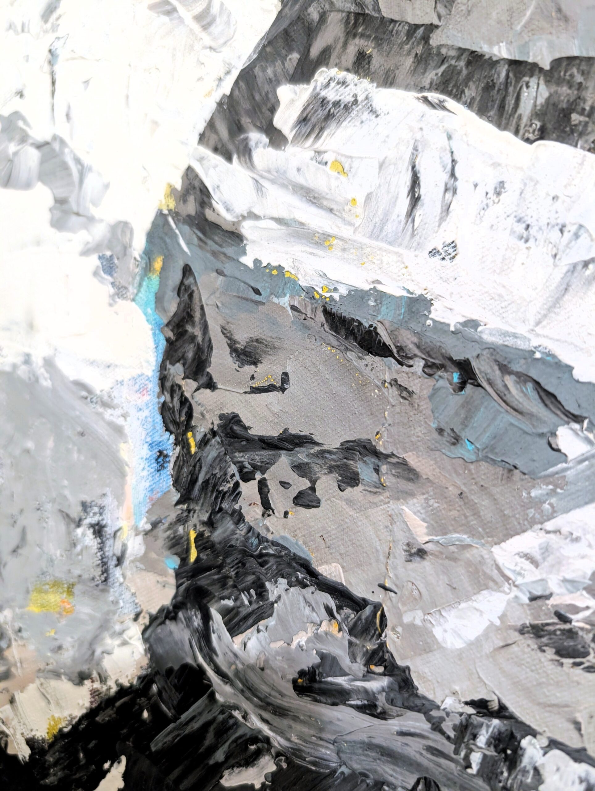 My abstract acrylic painting on stretched canvas using a palette knife. I played with shades of white, gray, blue and brown. The palette knife gives the painting volume without being overwhelming.