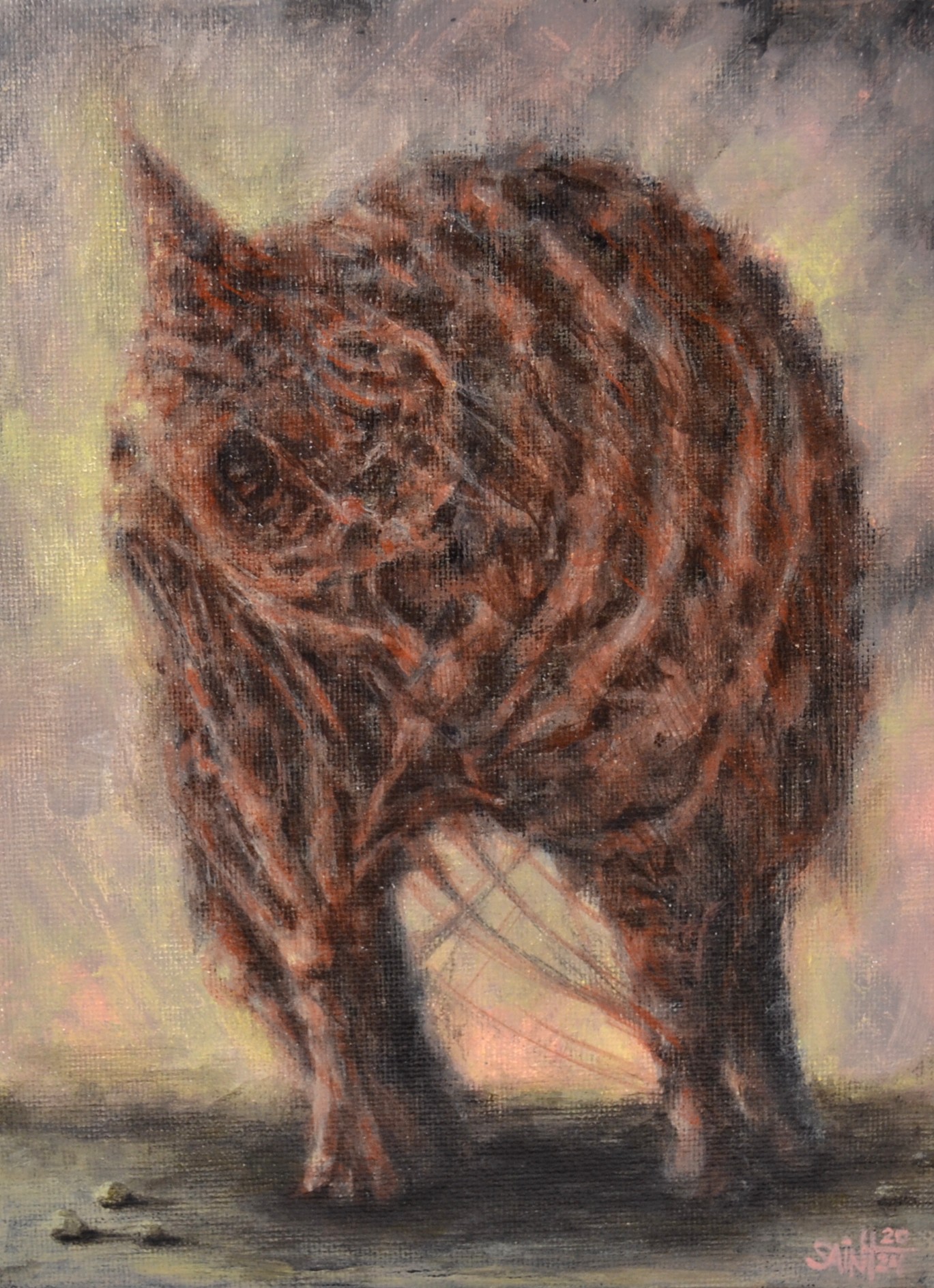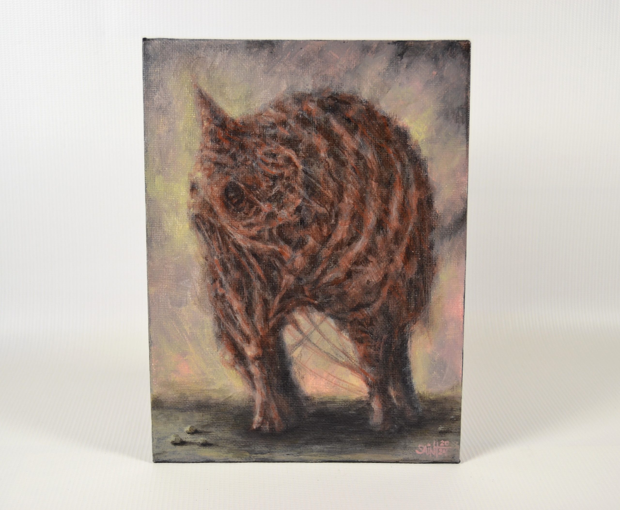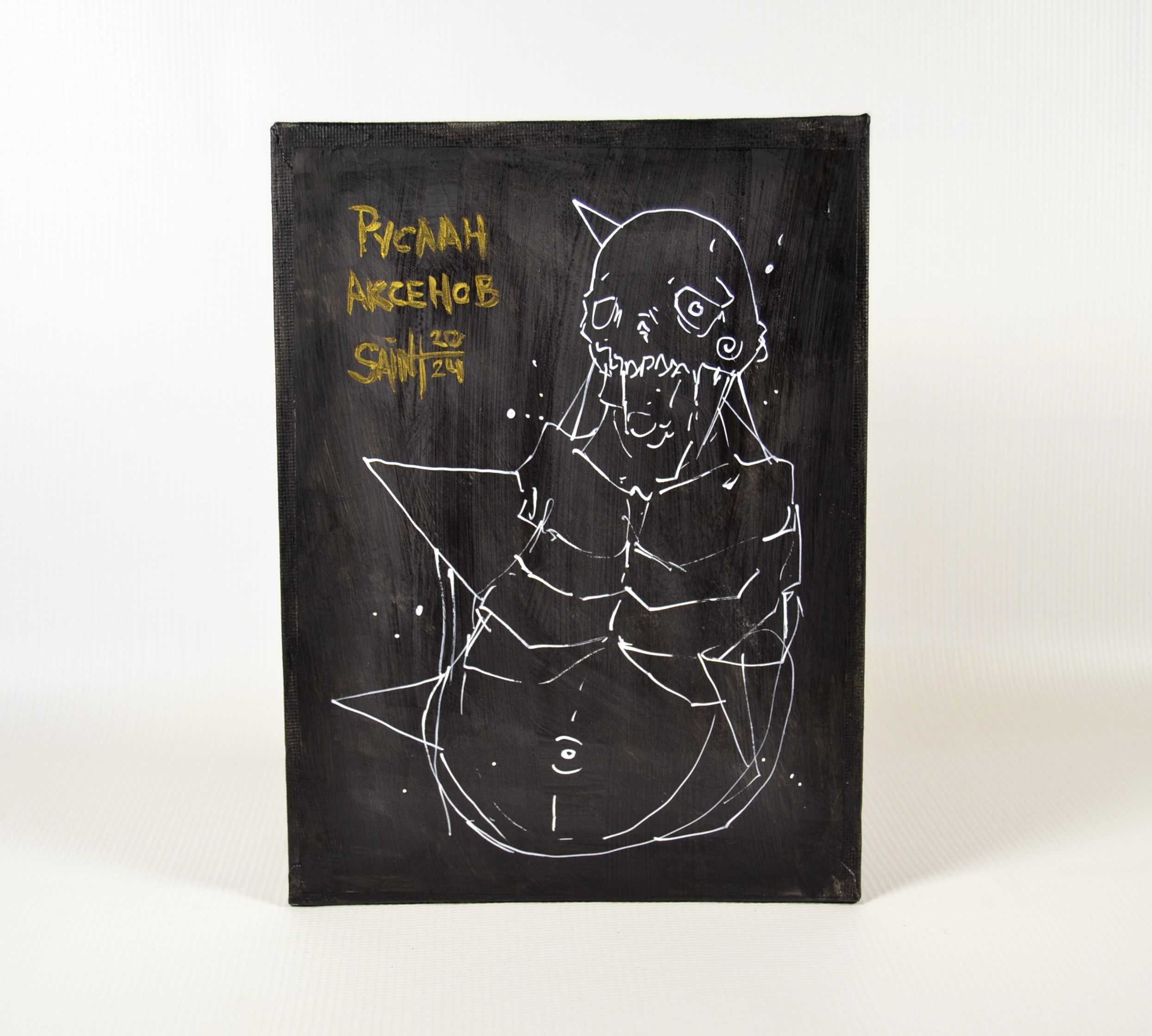 Painting with acrylic paints on canvas on cardboard. The back is covered with black primer, the front side is covered with acrylic varnish and alcohol-based finish varnish (does not stick, semi-matte effect), the acrylic ink graphics on the reverse side are handmade.