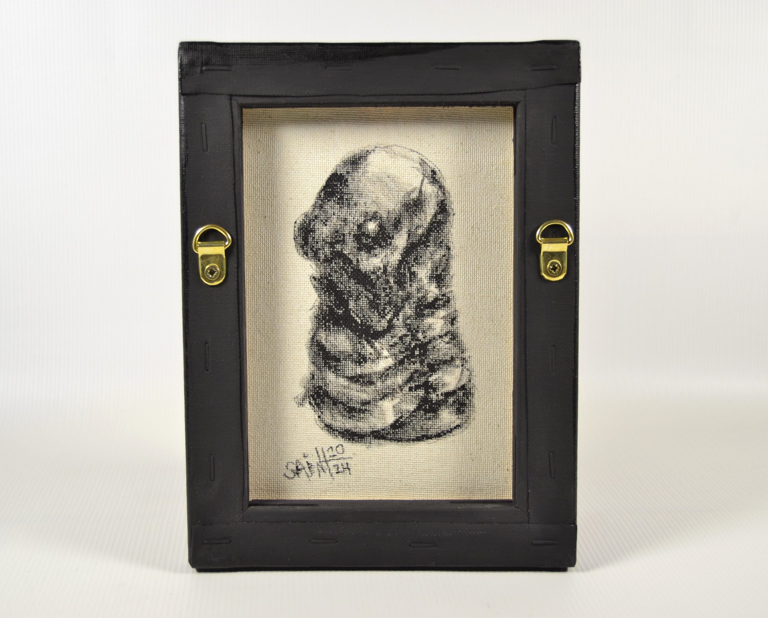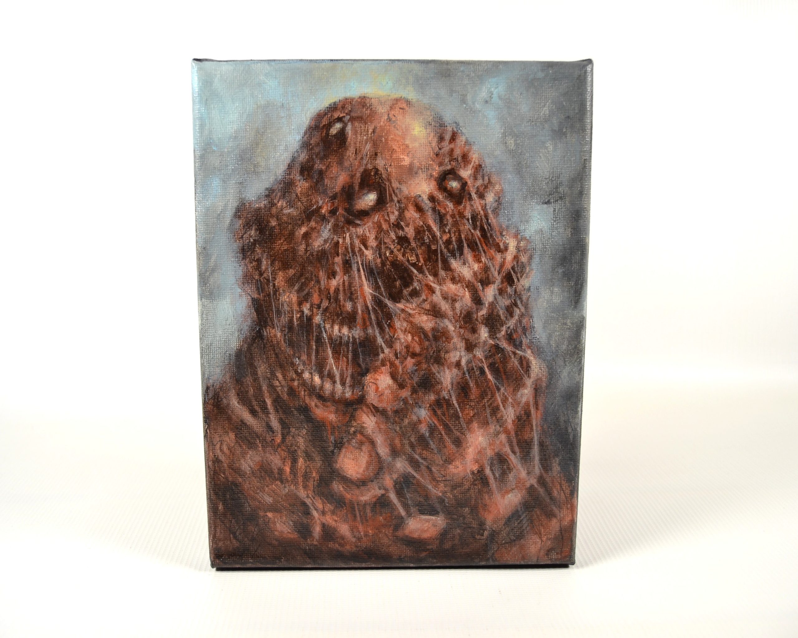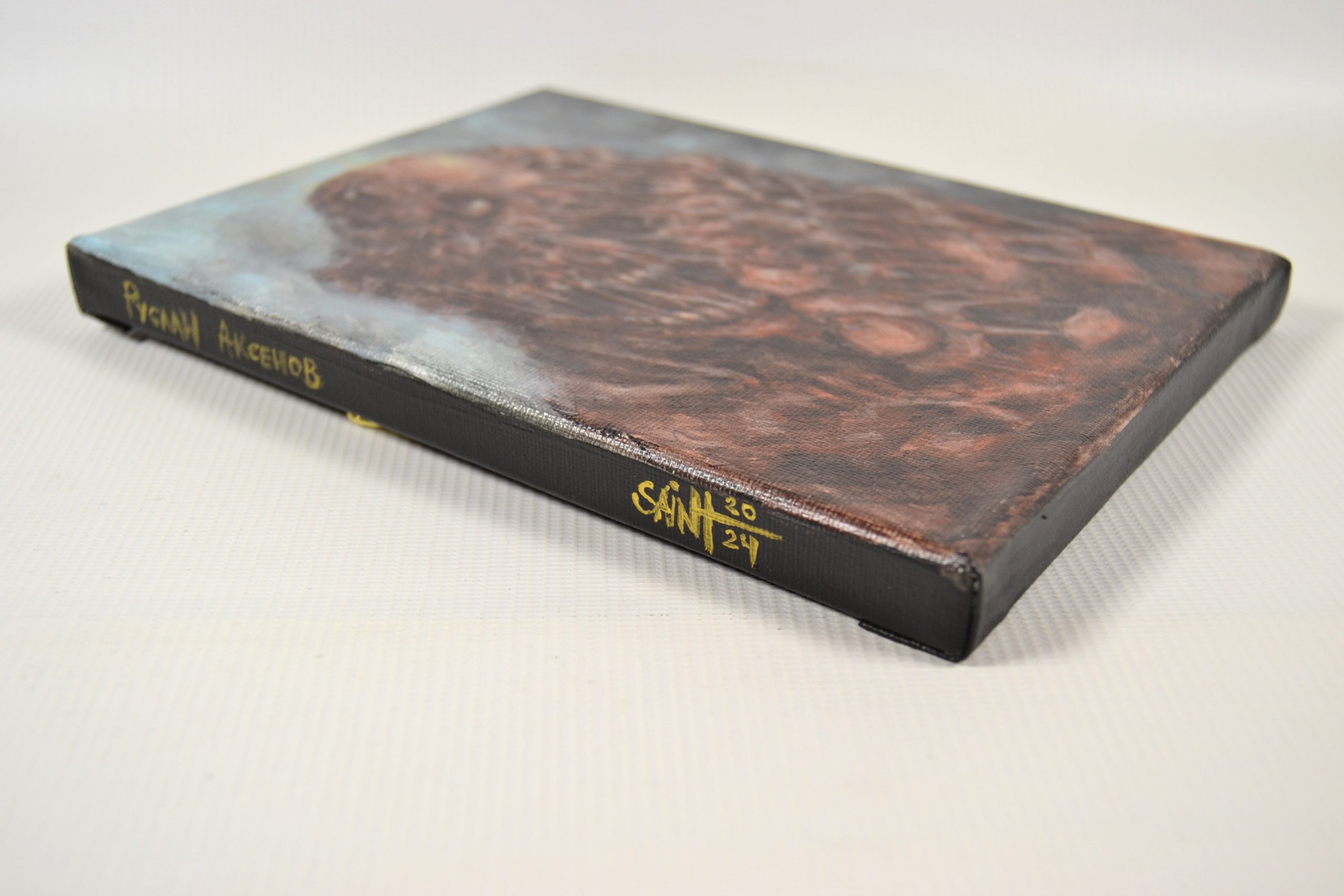 Painting with acrylic paints on canvas on a stretcher. The back is covered with black primer, suspensions are installed, the signature is on the end of the painting, the front side and ends are covered with acrylic varnish and alcohol-based finish varnish (does not stick, semi-matte effect), the acrylic ink graphics on the back of the canvas are executed with a brush.