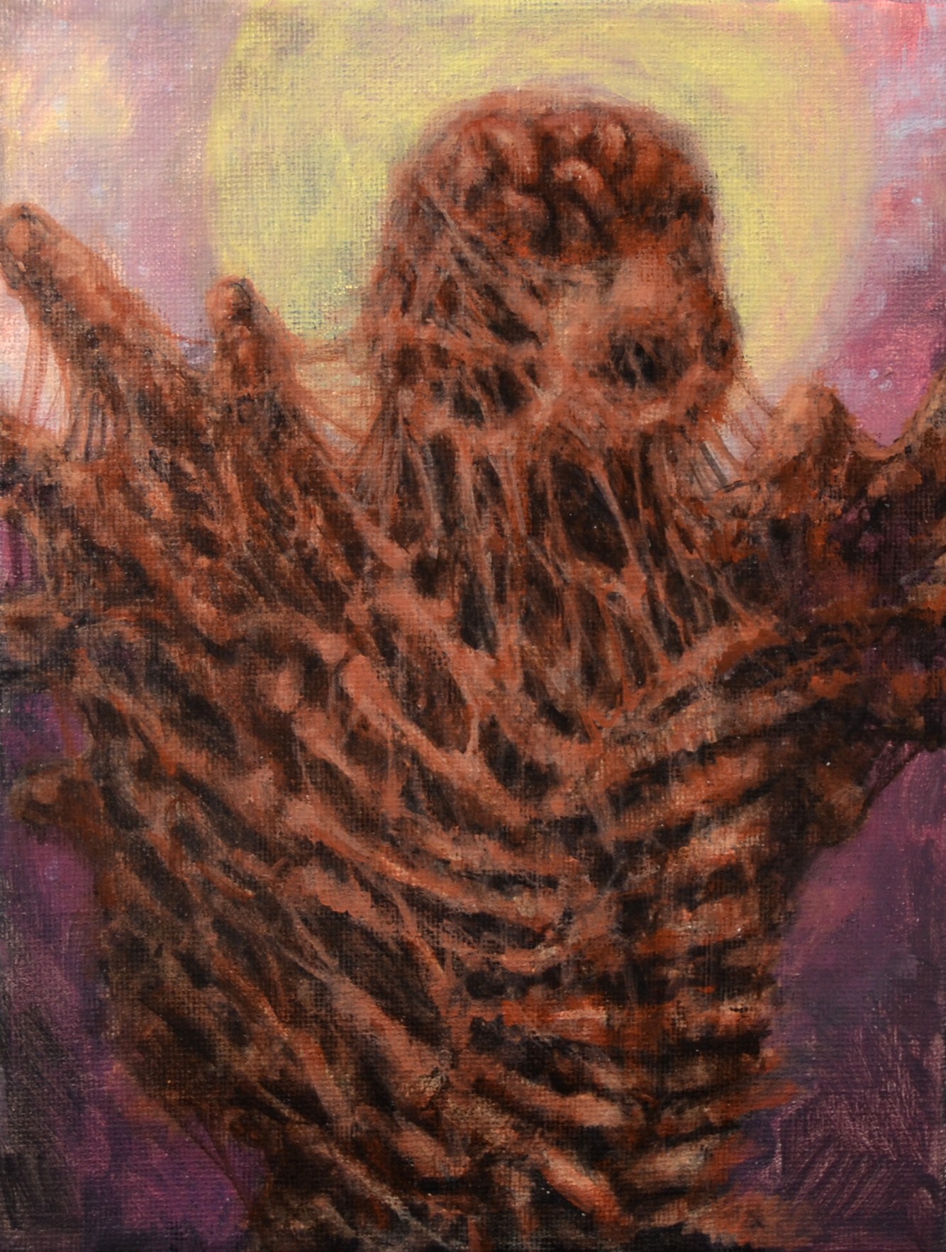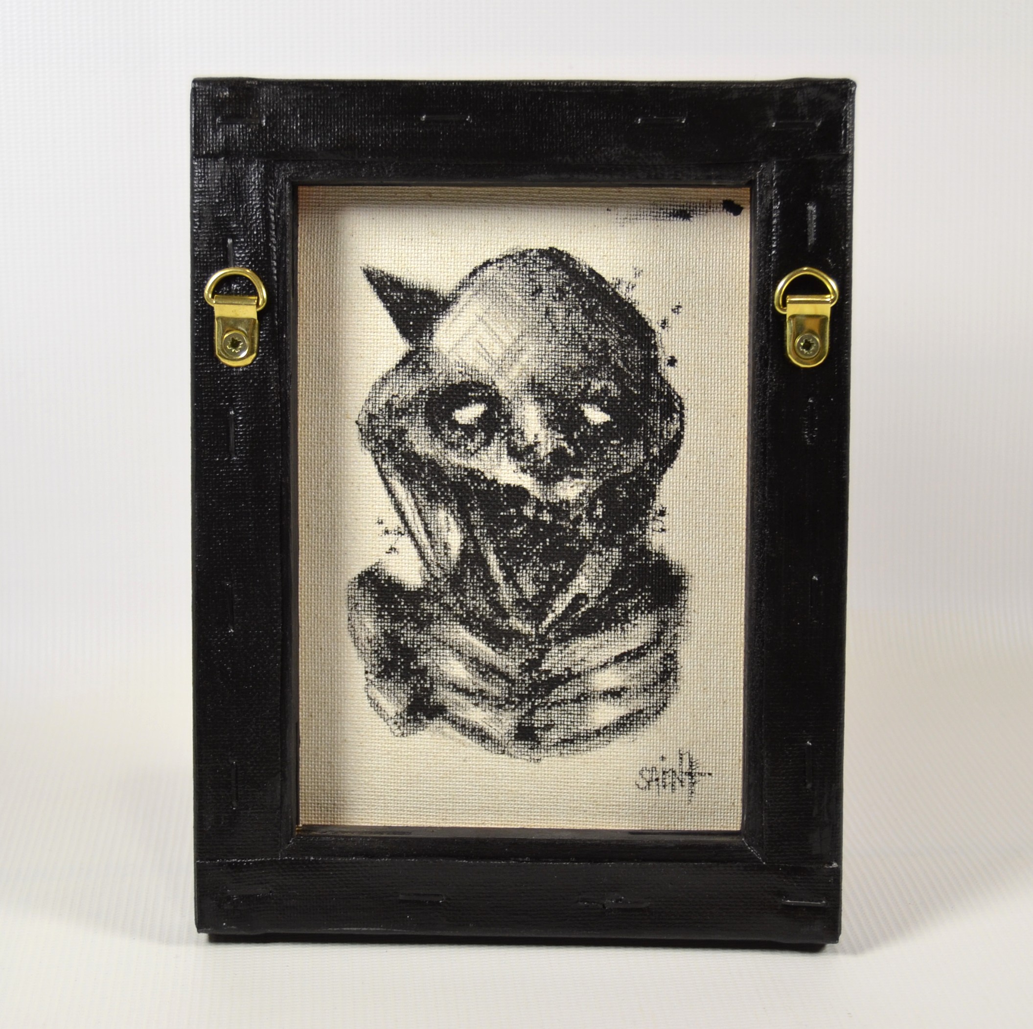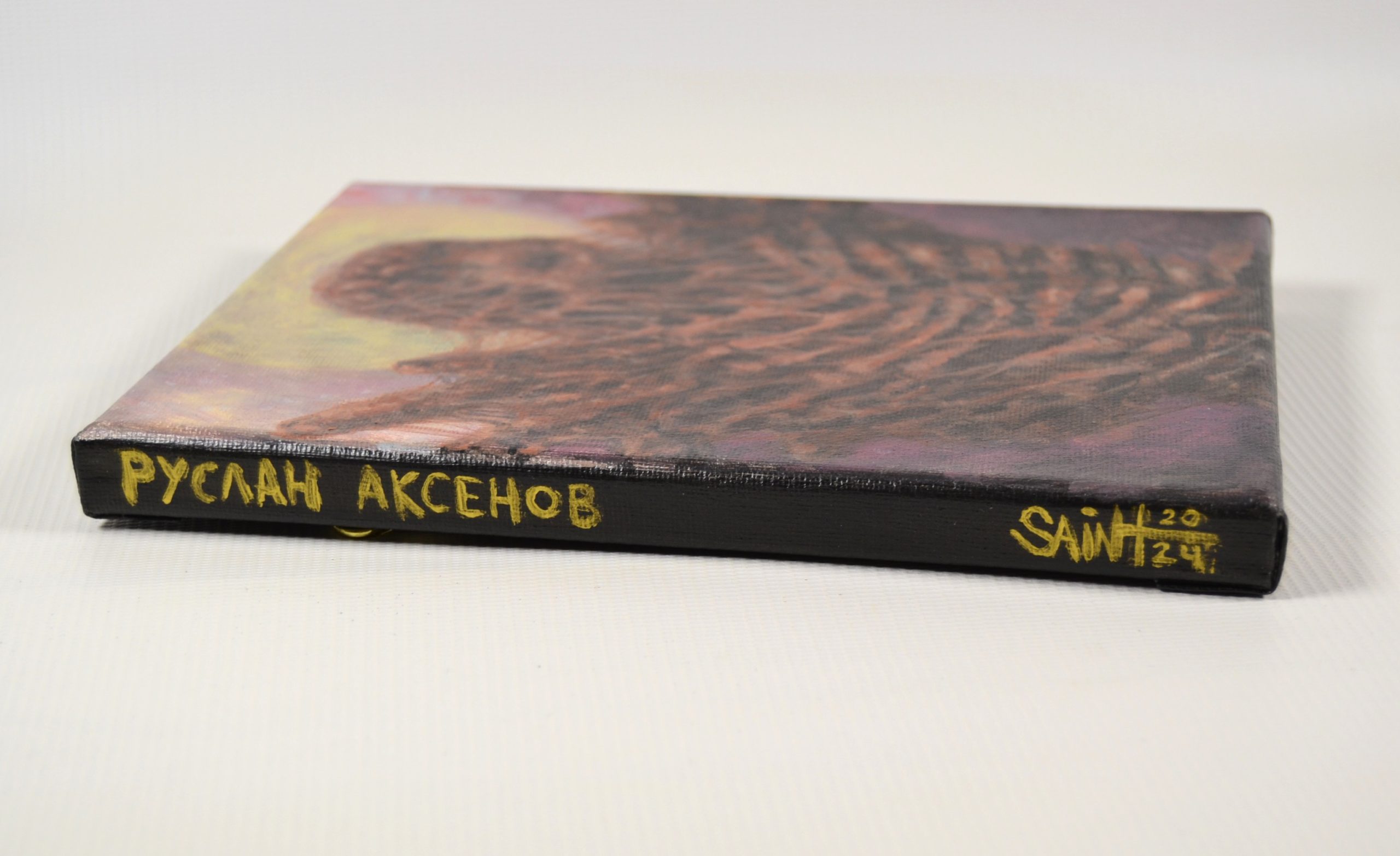 Painting with acrylic paints on canvas on a stretcher. The back is covered with black primer, suspensions are installed, the signature is on the end of the painting, the front side and ends are covered with acrylic varnish and alcohol-based finish varnish (does not stick, semi-matte effect), the acrylic ink graphics on the back of the canvas are executed with a brush.