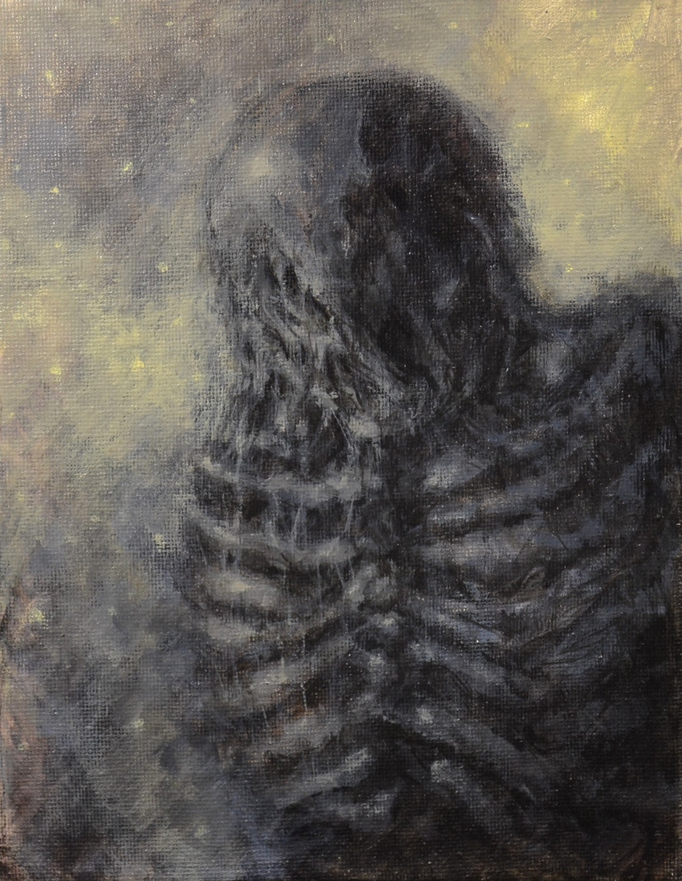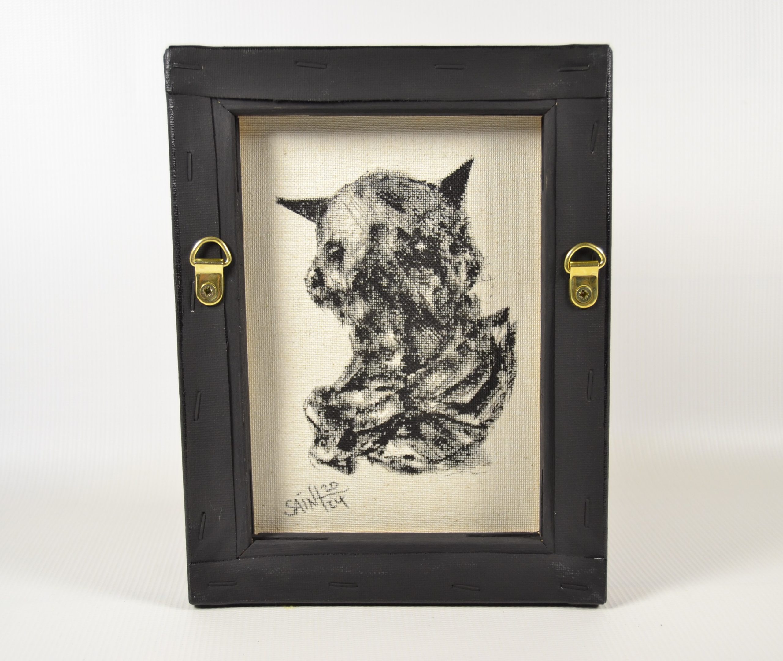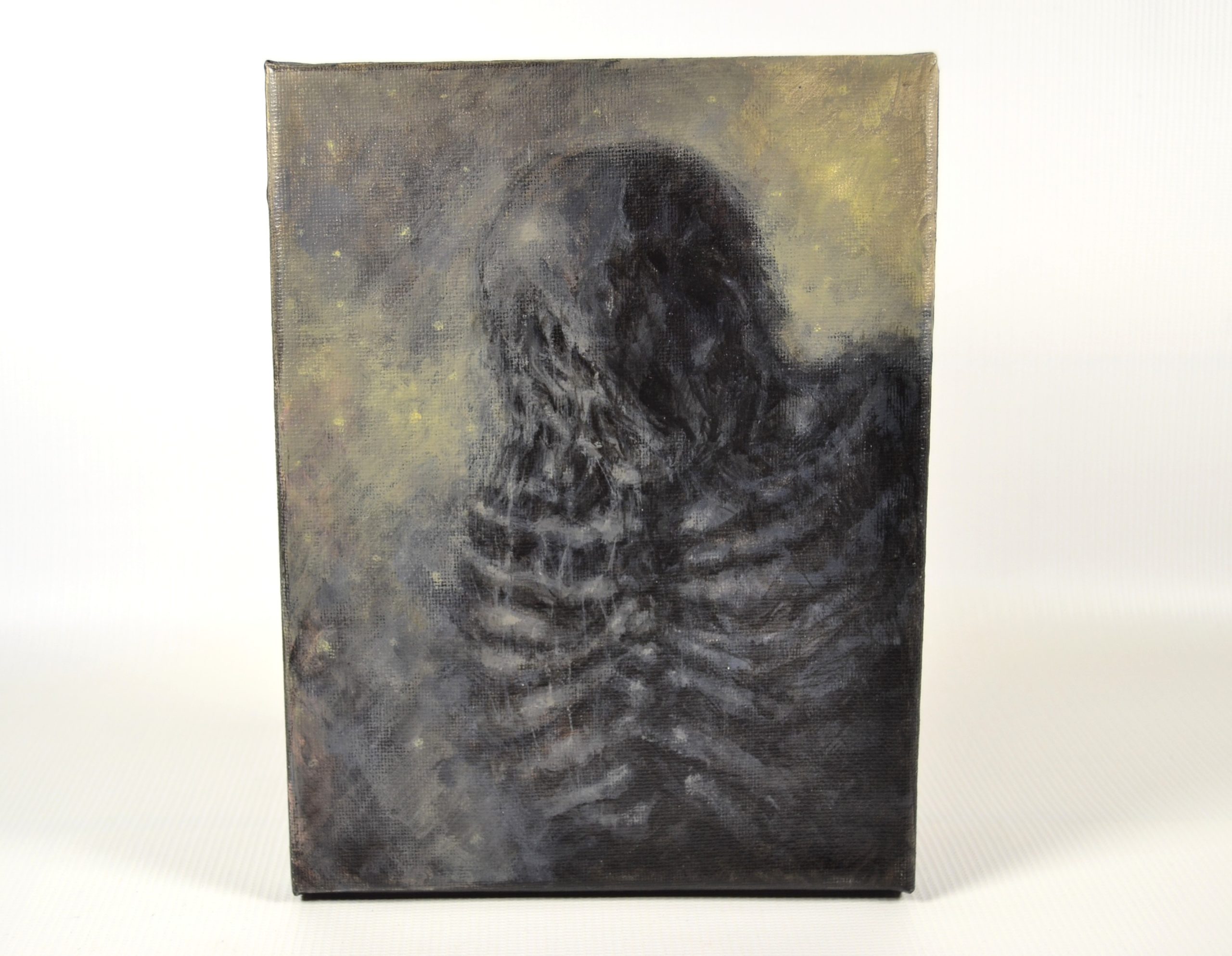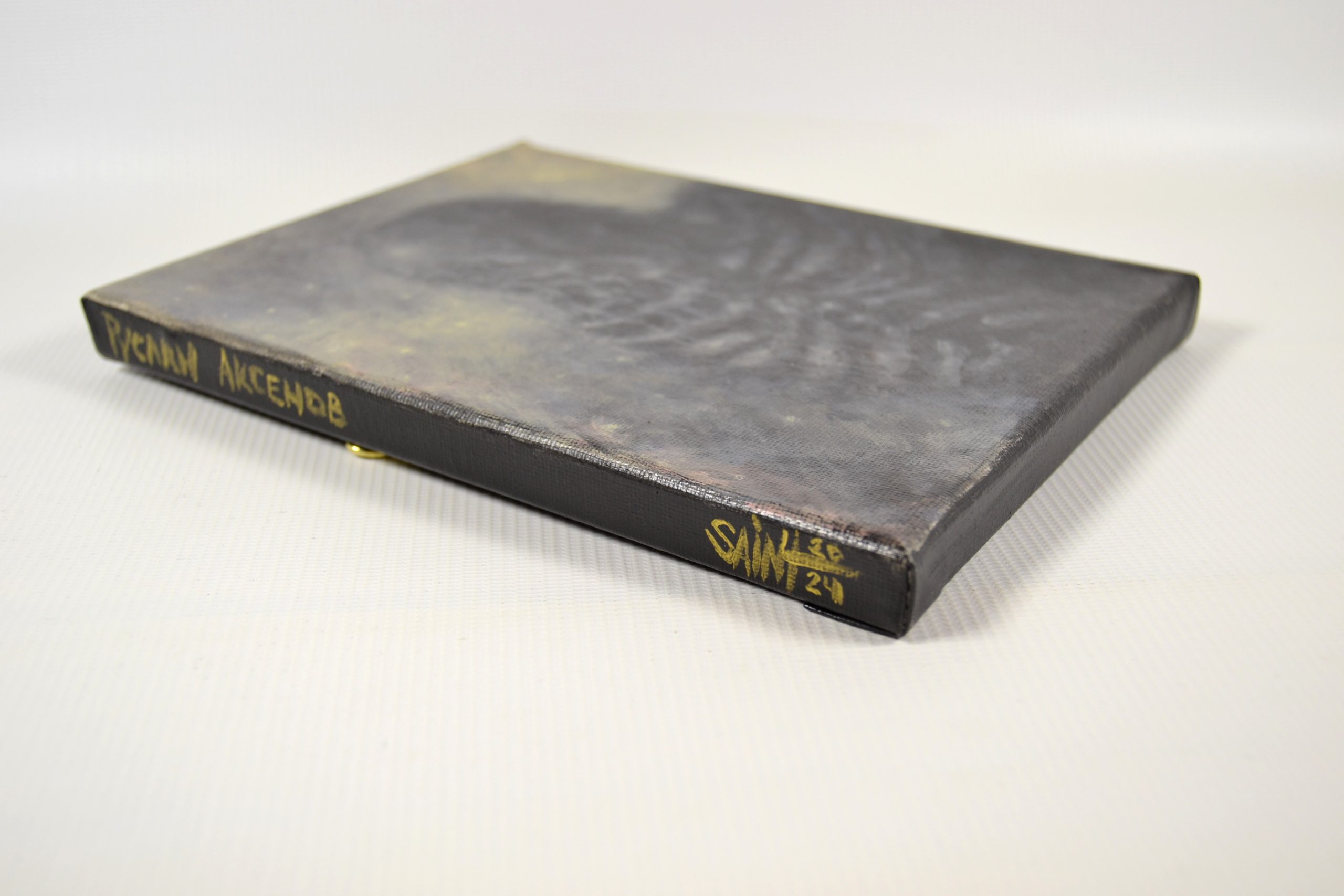 Painting with acrylic paints on canvas on a stretcher. The back is covered with black primer, suspensions are installed, the signature is on the end of the painting, the front side and ends are covered with acrylic varnish and alcohol-based finish varnish (does not stick, semi-matte effect), the acrylic ink graphics on the back of the canvas are executed with a brush.