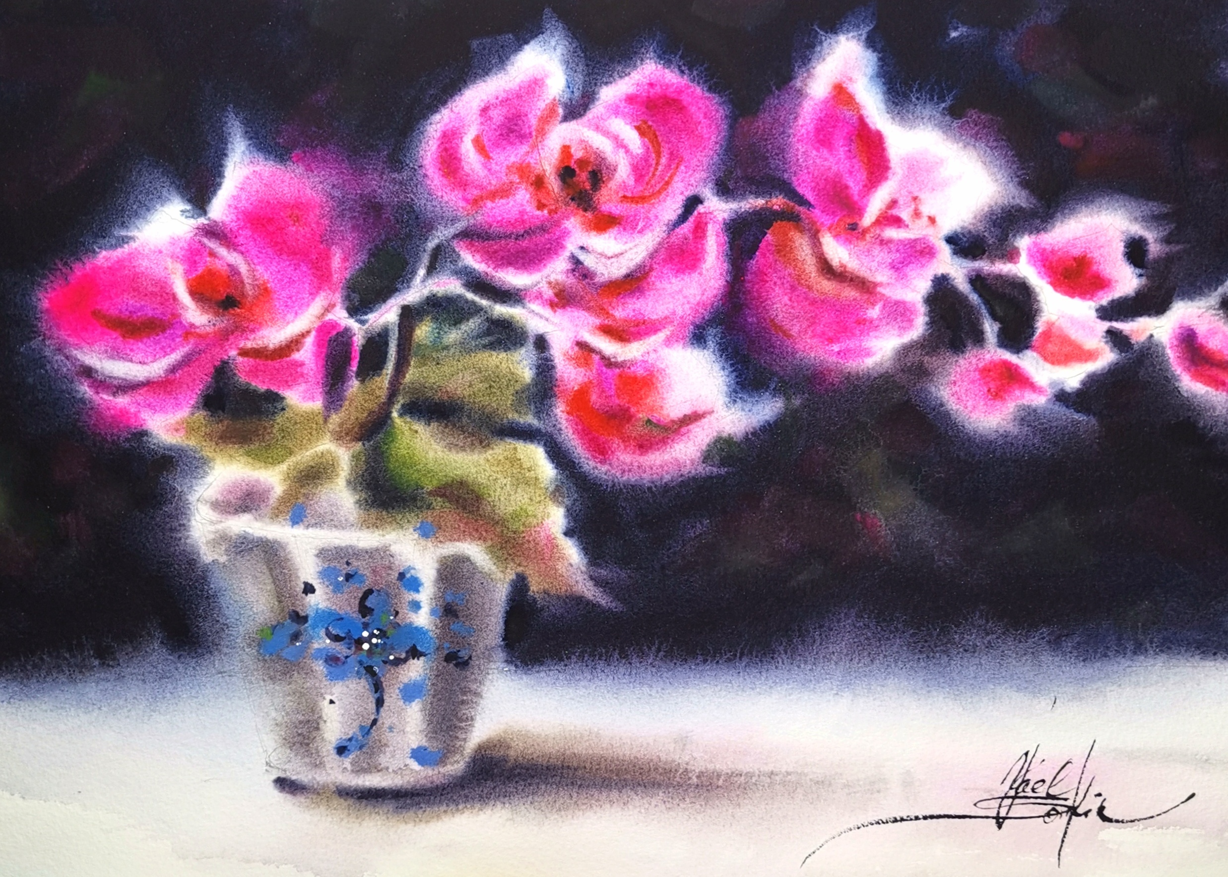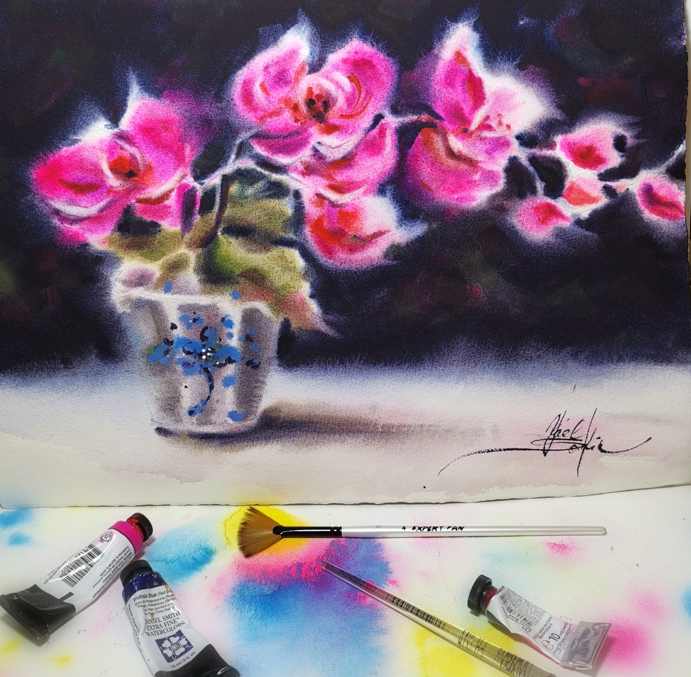 🖌️ Created in the wet-in-wet technique, the artwork highlights the delicate contrast of bright orchid petals against a deep, complex background of indigo, olive, and carmine hues.