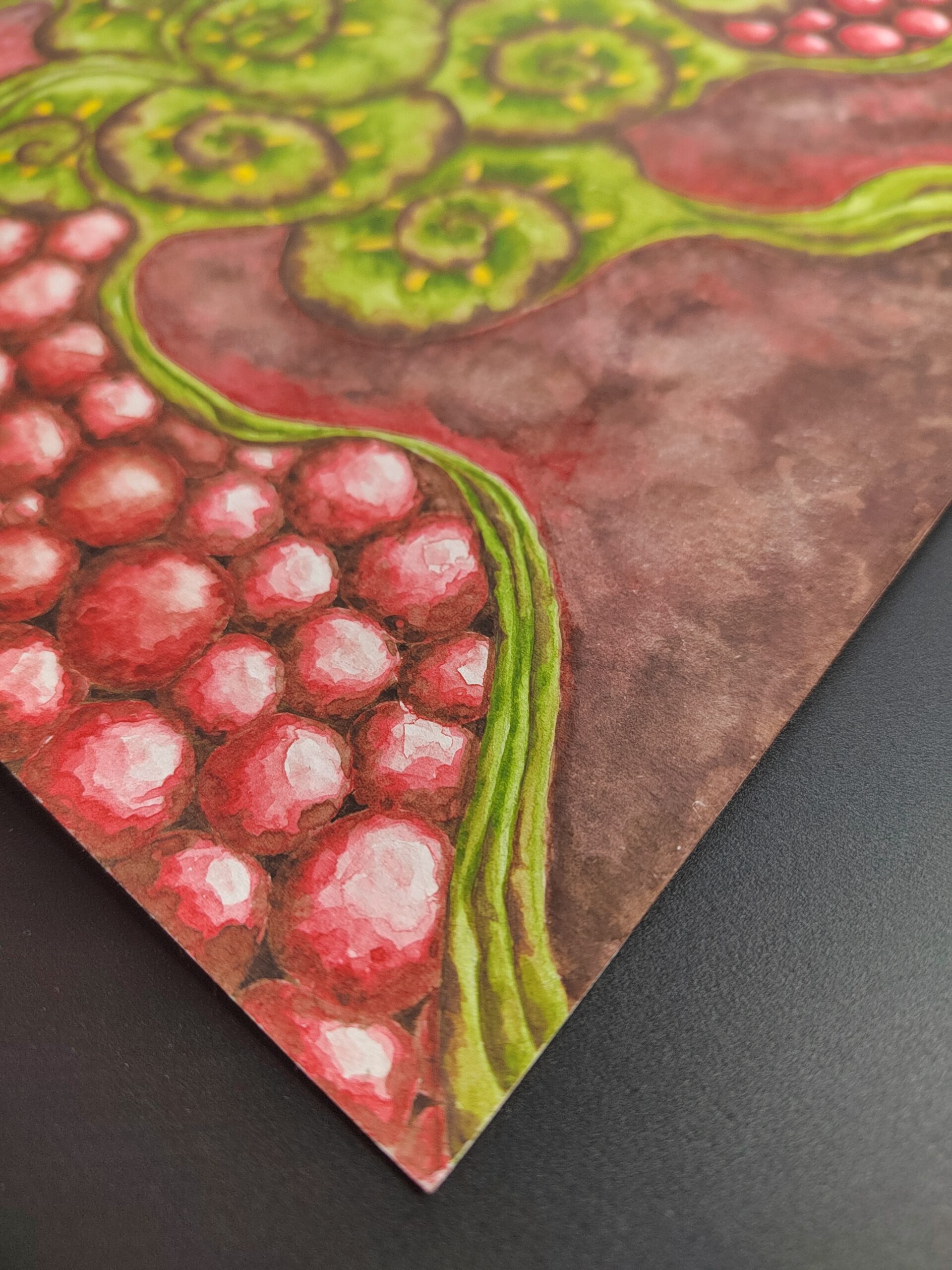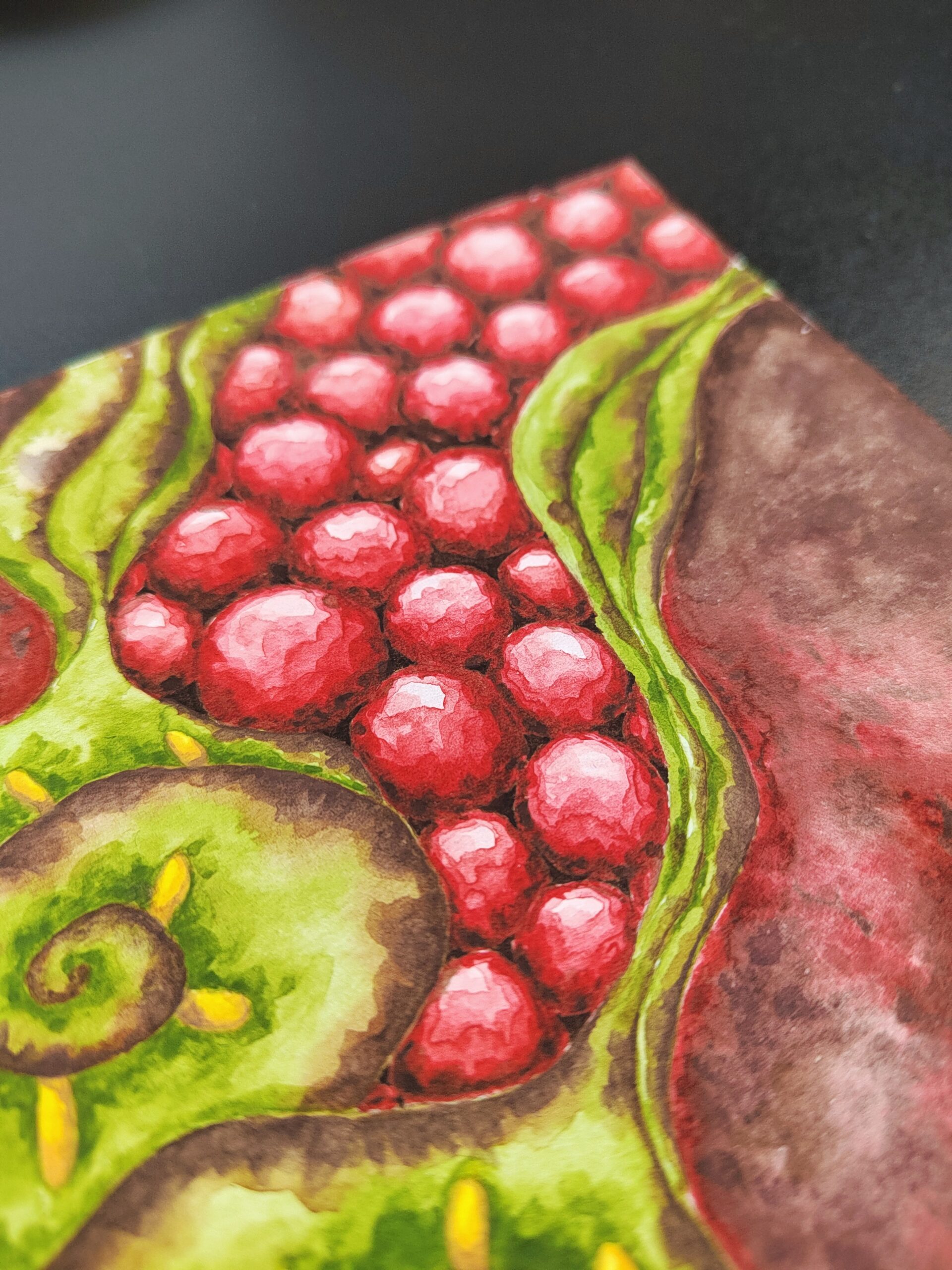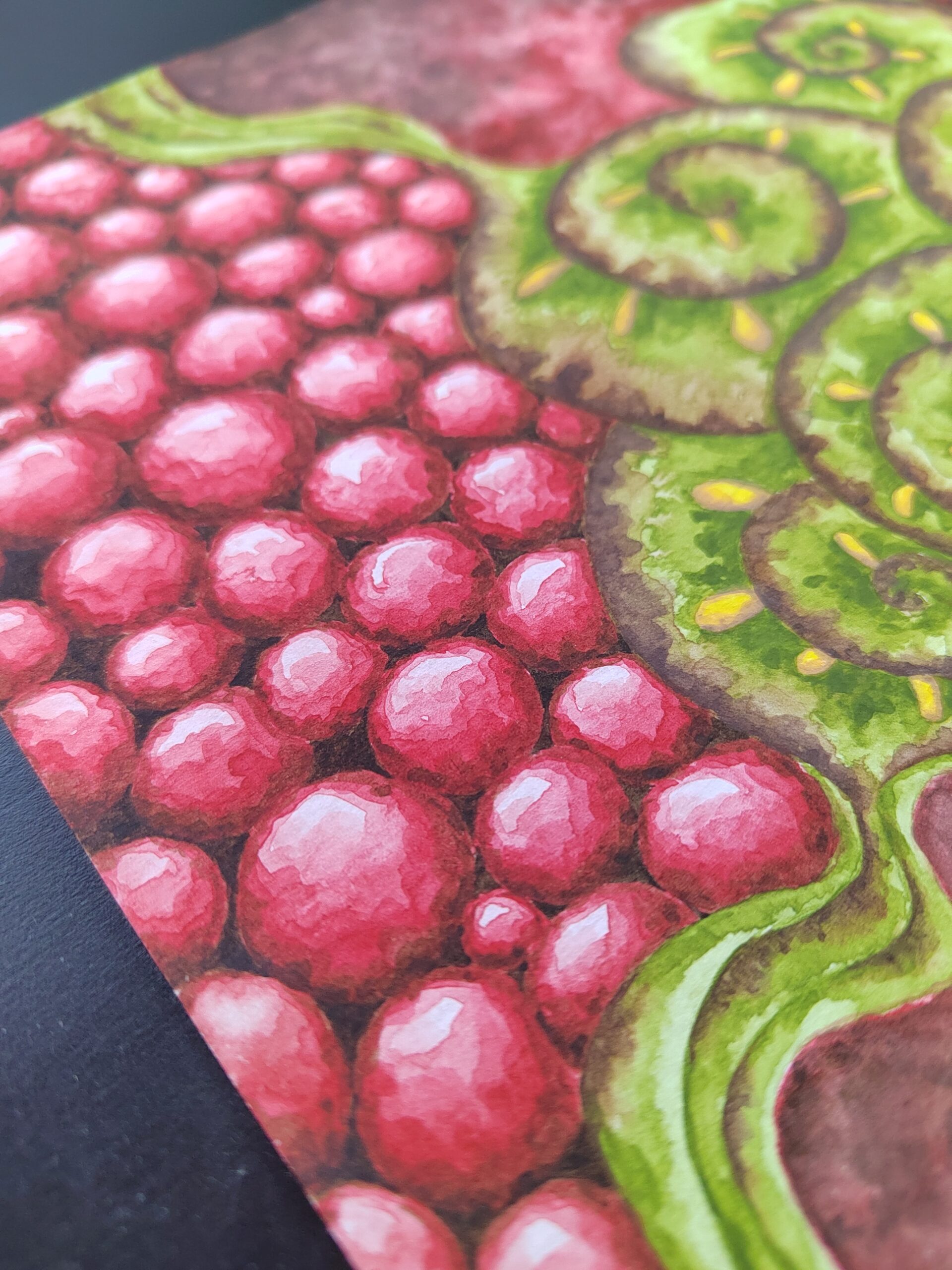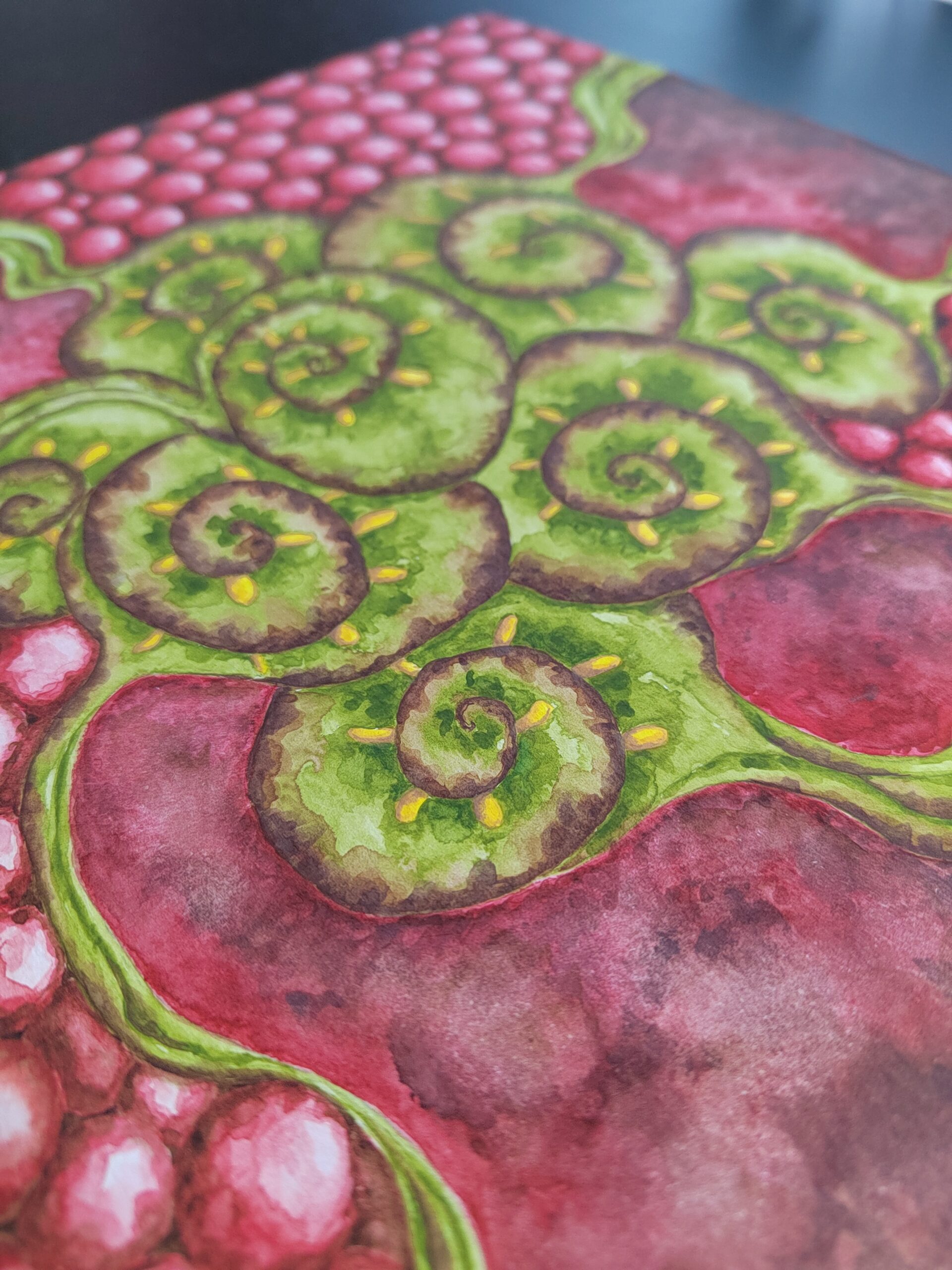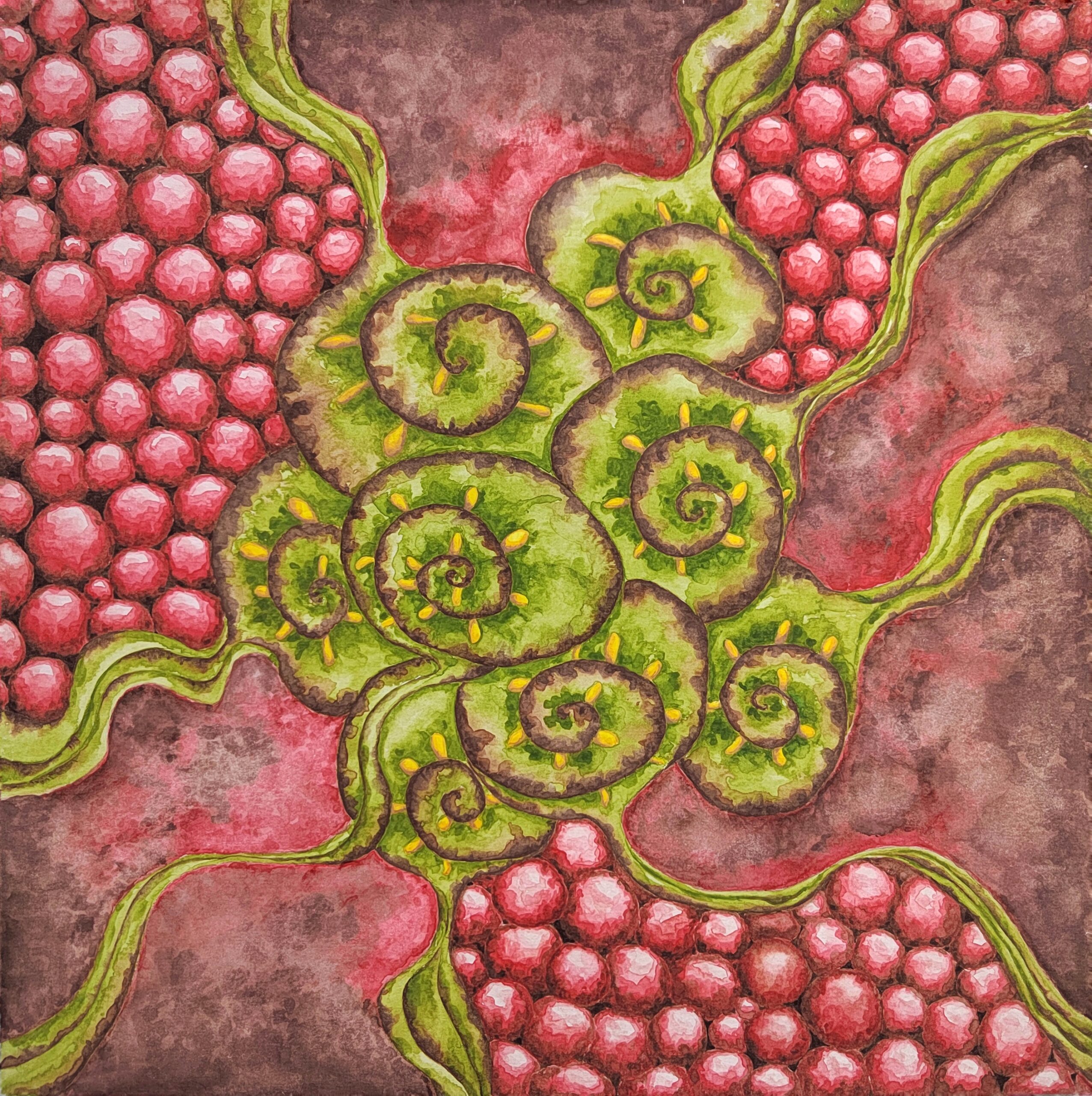 “New Life” is an enchanting watercolor painting that embodies the essence of growth, renewal, and transformation. At its heart, vivid green spirals unfurl like young fern fronds, brimming with vitality. Surrounding them, clusters of glistening pink spheres evoke the richness of seeds or fruit, symbolizing abundance and the potential for new beginnings. The deep red and earthy brown background enhances the contrast, creating a sense of organic movement and depth. This artwork is a celebration of nature’s resilience, blending abstract forms with botanical inspiration to ignite the imagination.