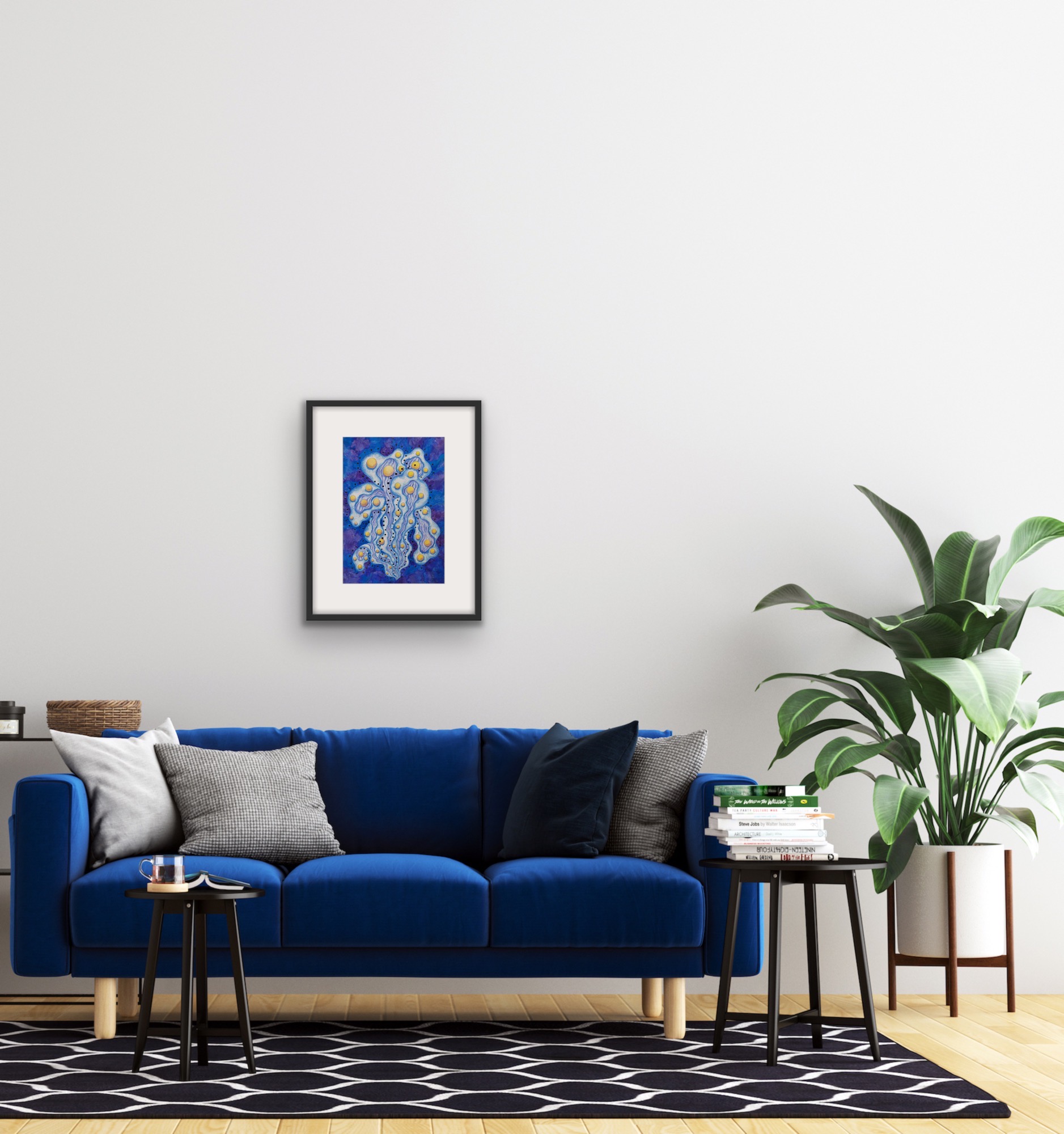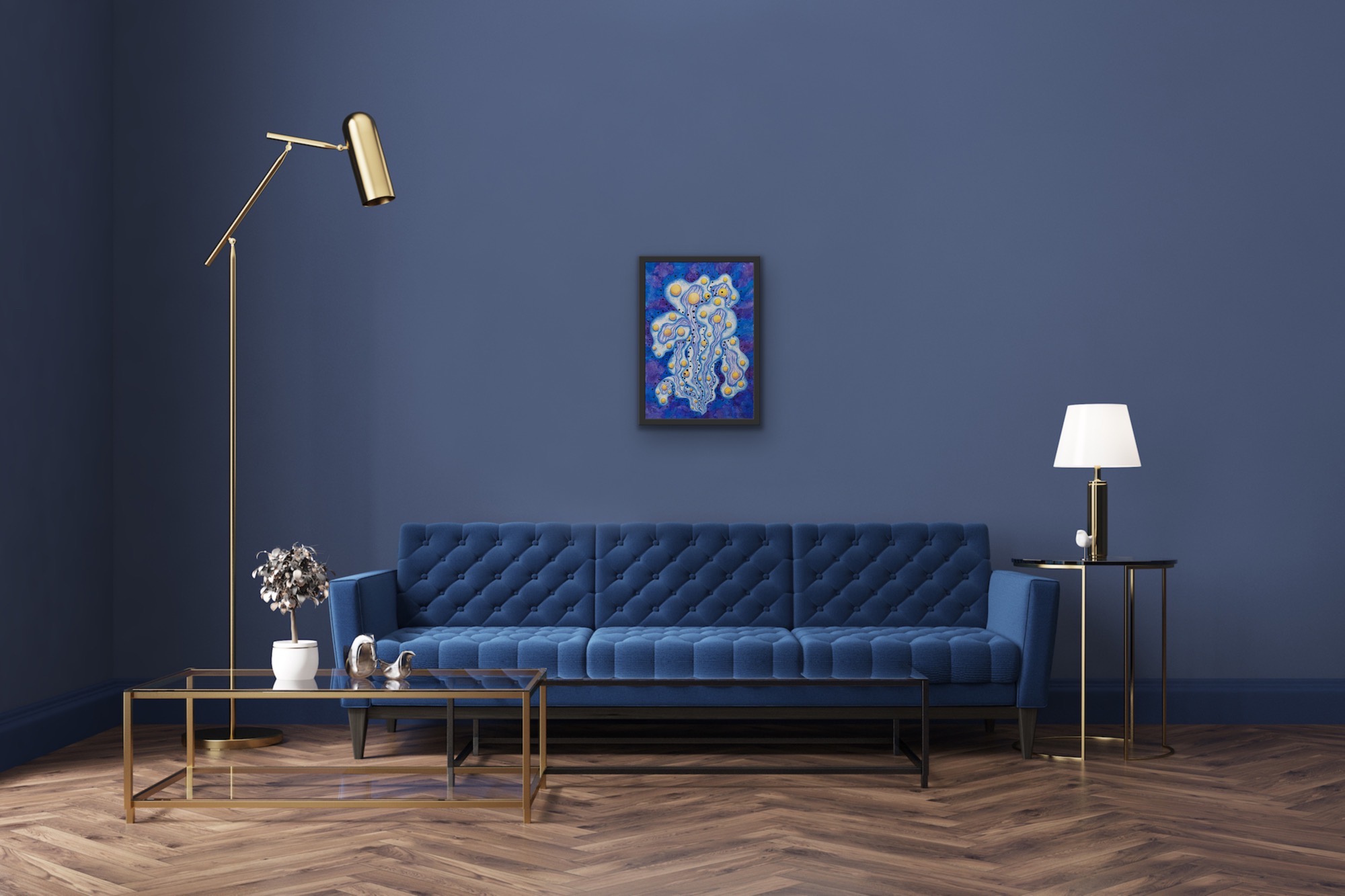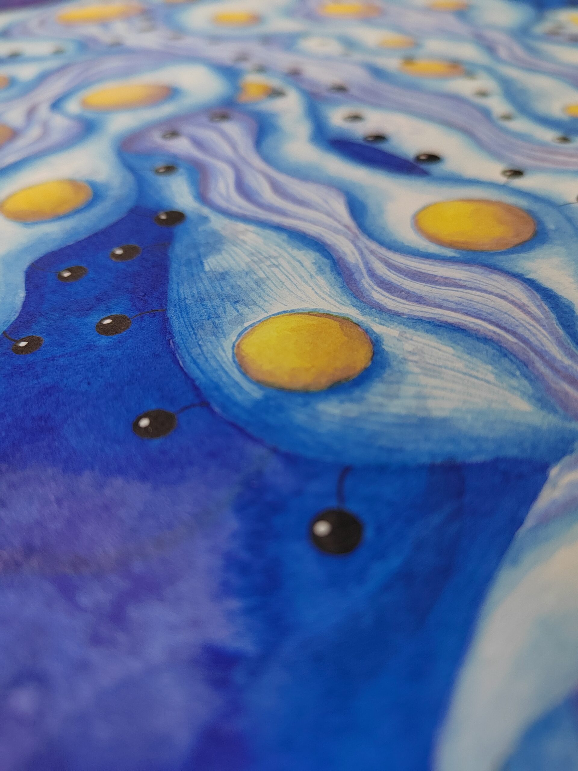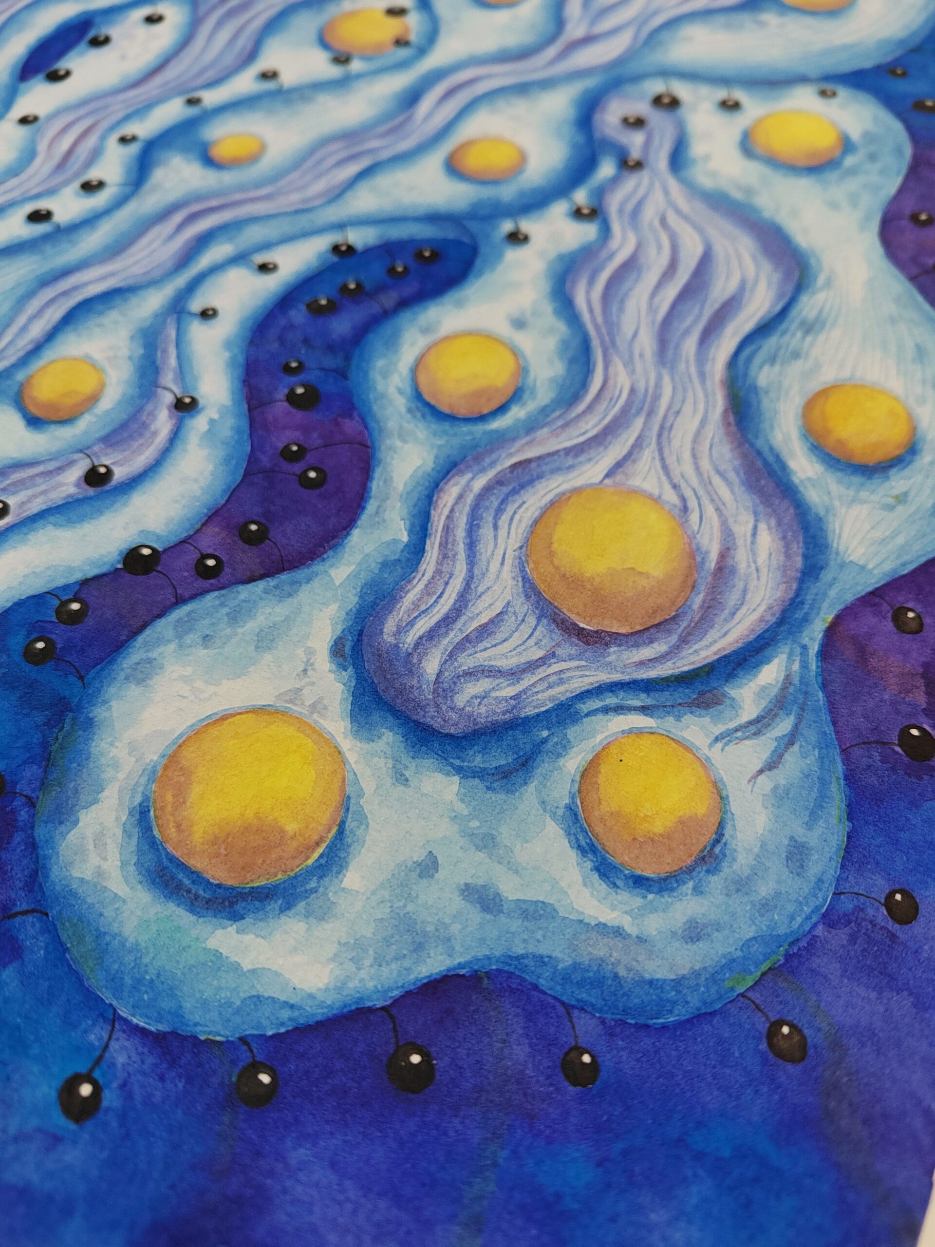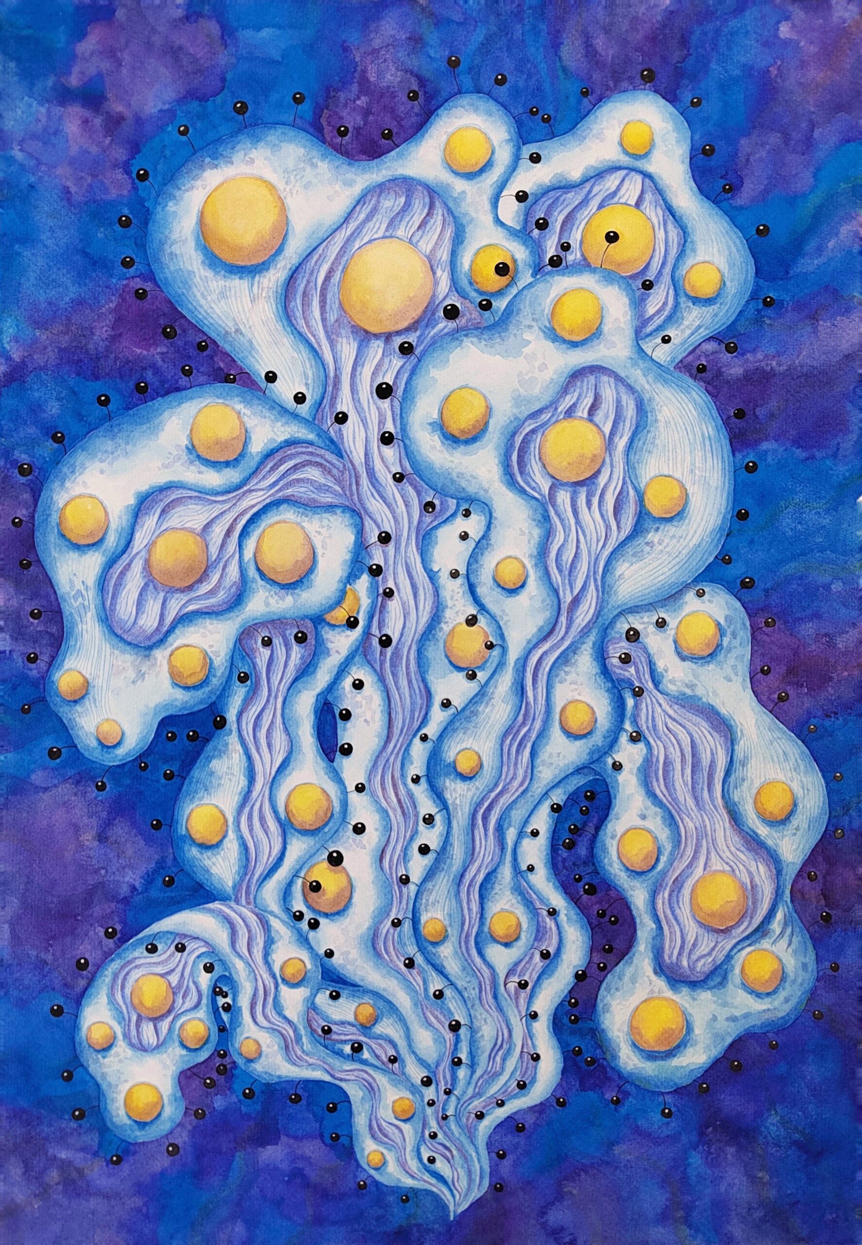 “Night Star” portrays an otherworldly plant blooming in the depths of a cosmic dreamscape. Golden orbs emerge like luminous seeds, suspended among flowing tendrils of blue and violet. Delicate textures and rhythmic lines evoke a sense of gentle motion, as if the plant drifts in an infinite ocean of starlight. This work blends elements of fantasy botany and abstract art, inviting the viewer to explore an ethereal world where nature and the cosmos intertwine.