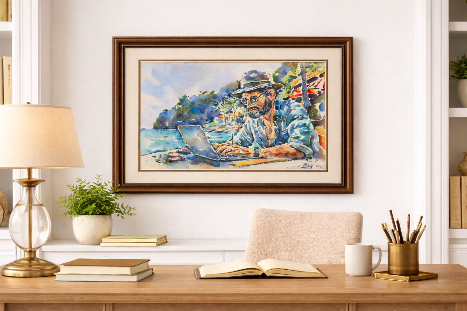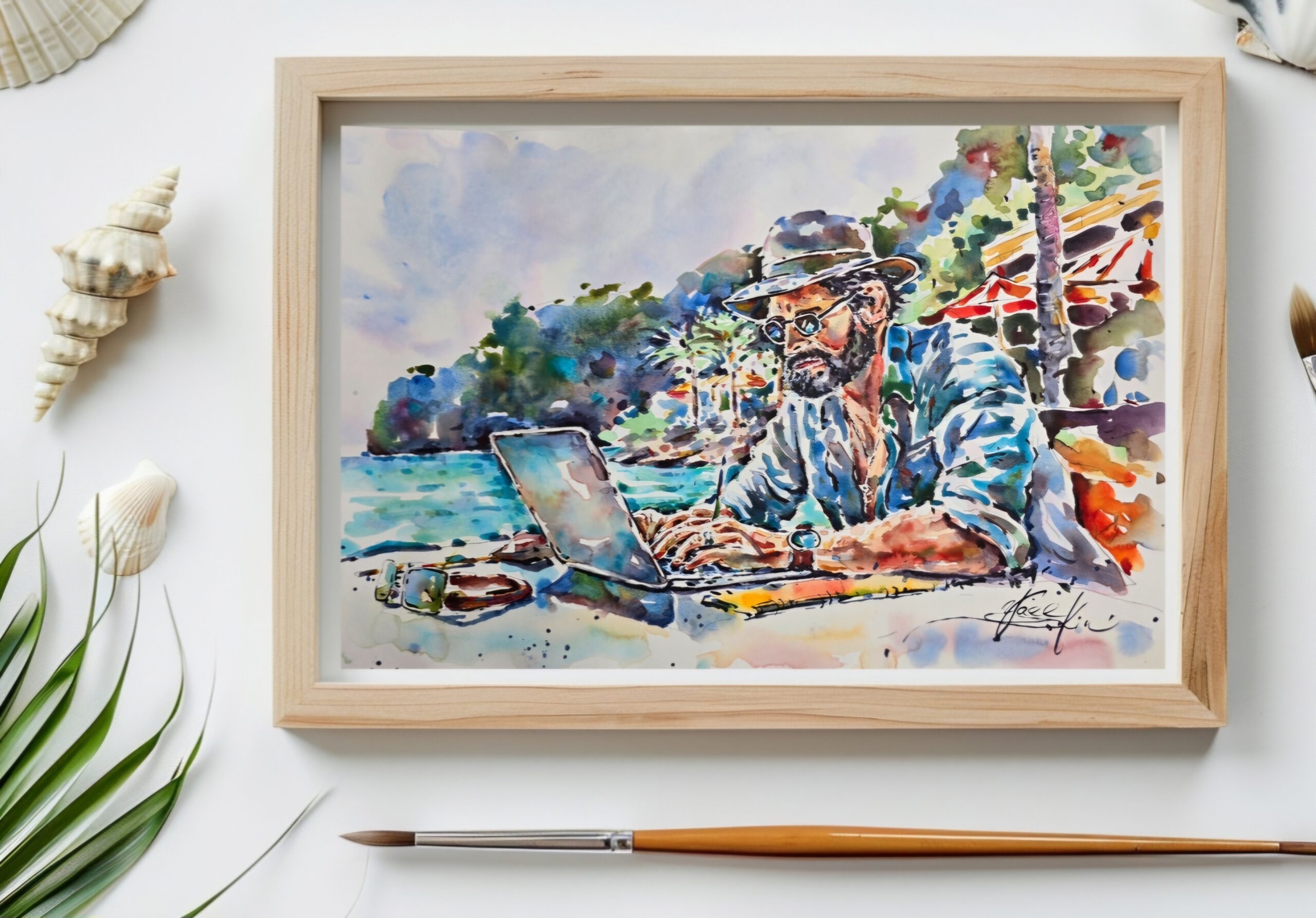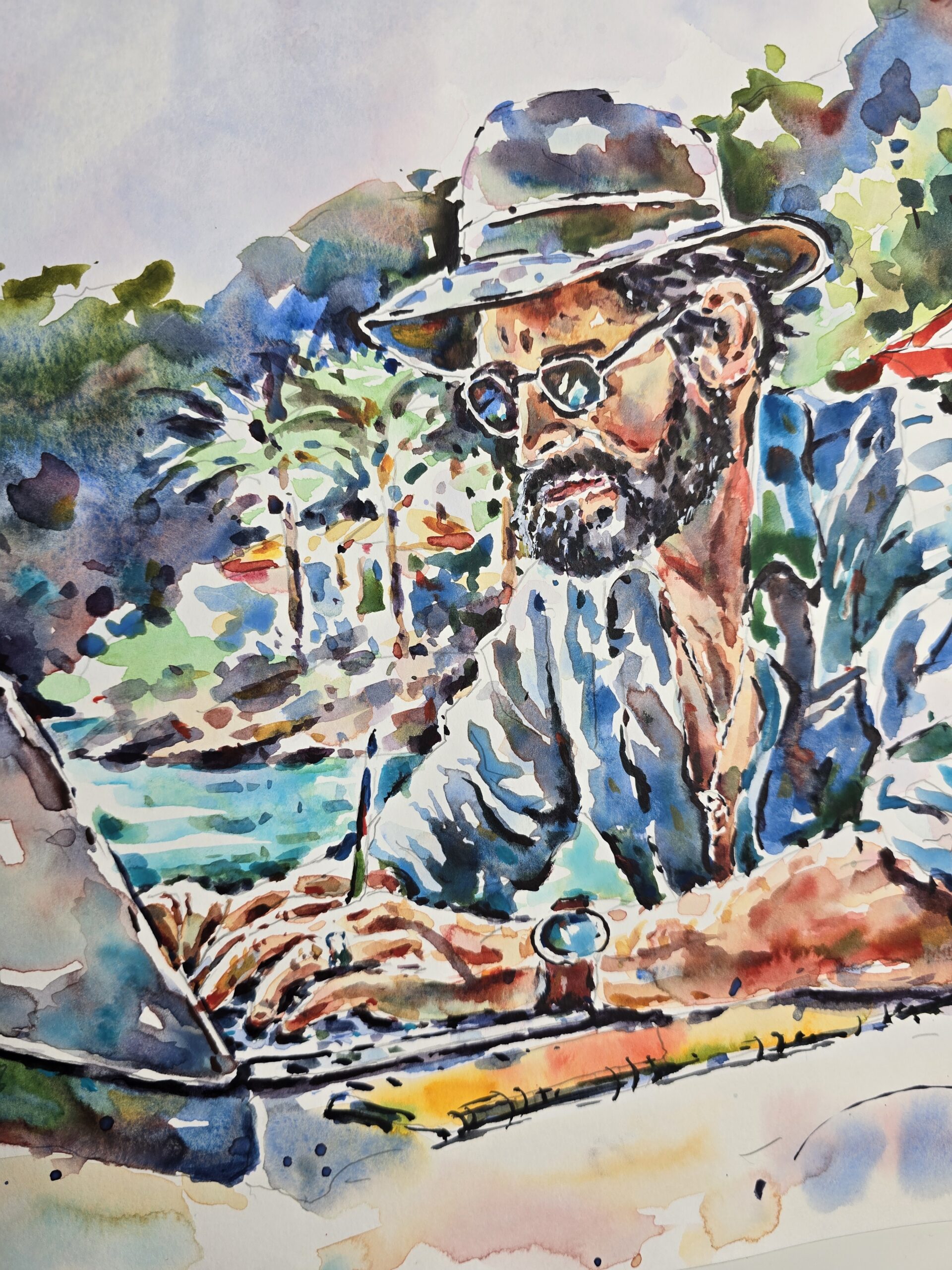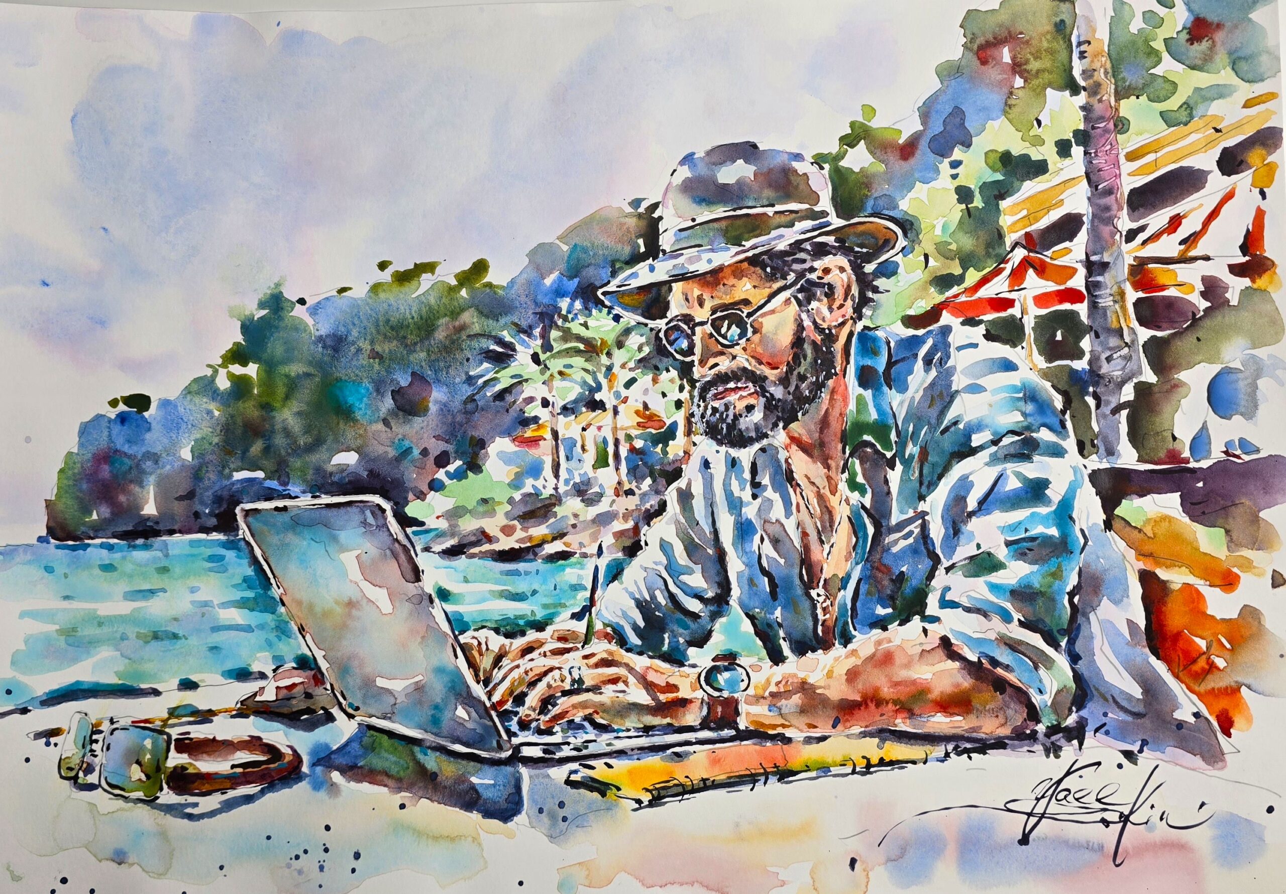 🎨“Nomad Spirit” is an original watercolor seascape painting that captures the essence of freedom, creativity, and the digital nomad lifestyle. The artwork portrays a man in a hat and sunglasses working on his laptop with the sea and vibrant nature in the background, filled with light and color.