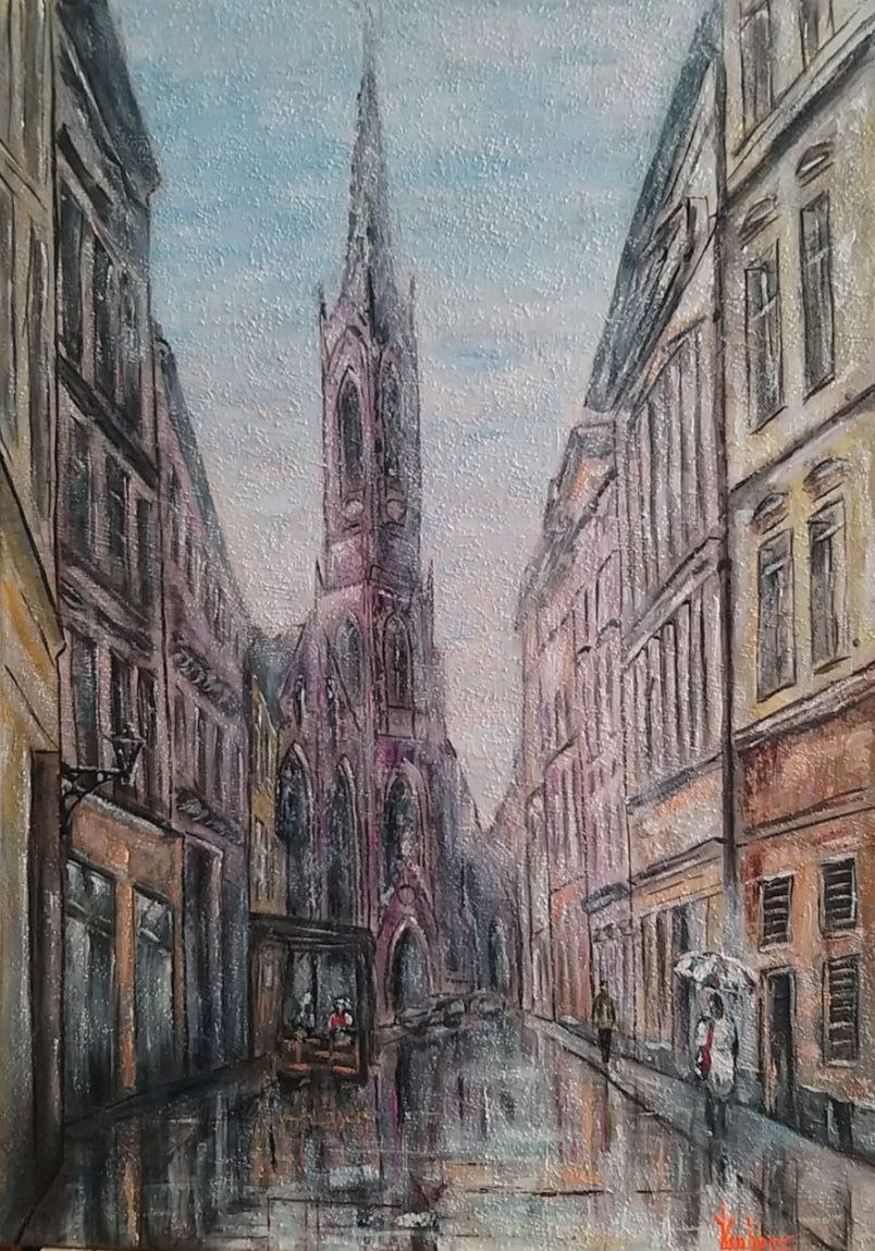 The canvas depicts an old Polish town, shrouded in the soft afterglow of rain. The wet paving stones reflect the sky, from which the rain has almost gone – only a light haze still hangs in the air, giving the scene a light watercolor effect.