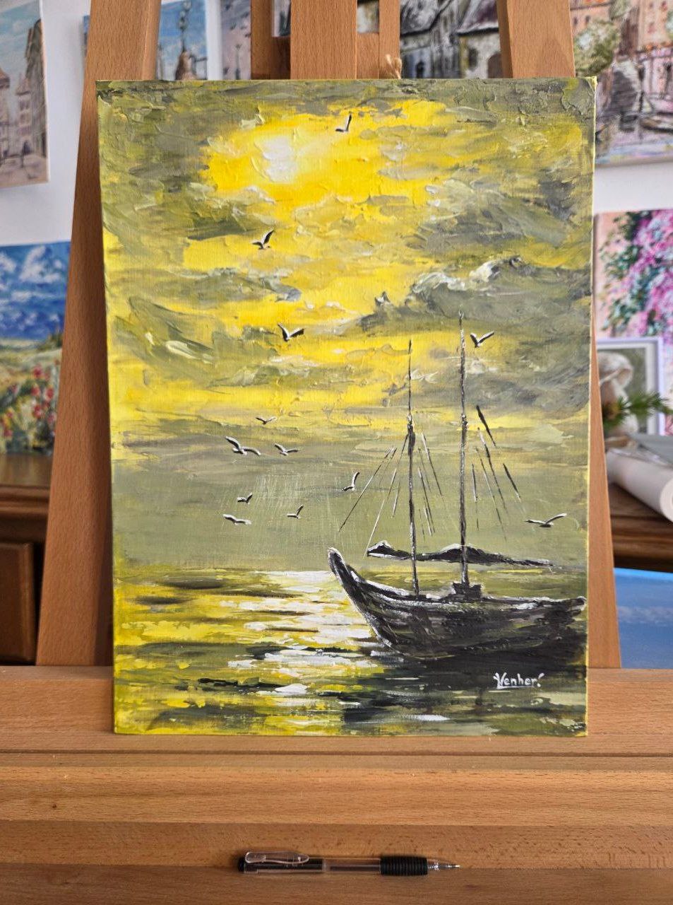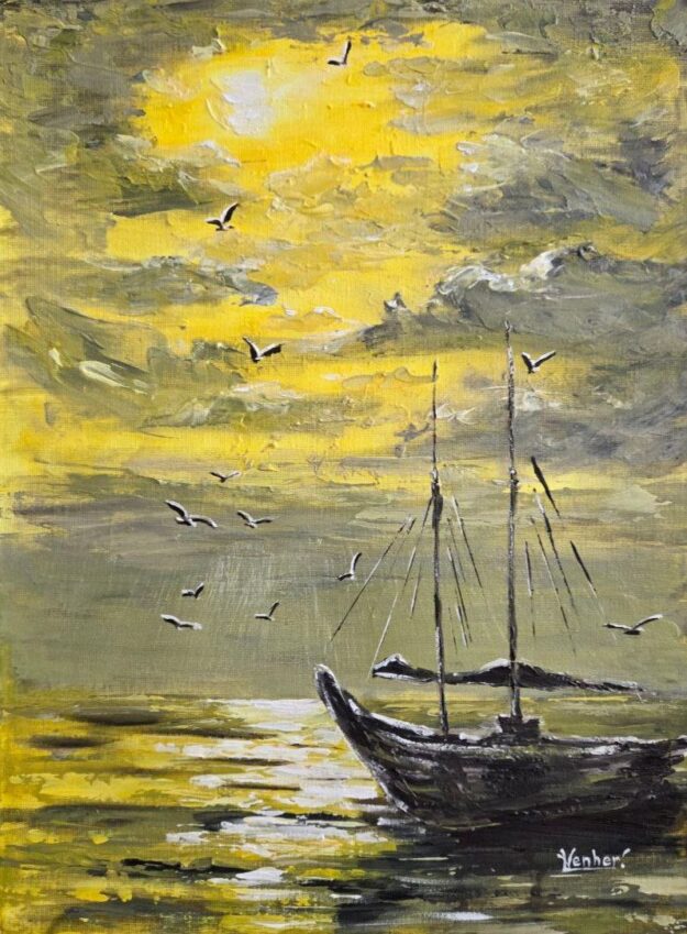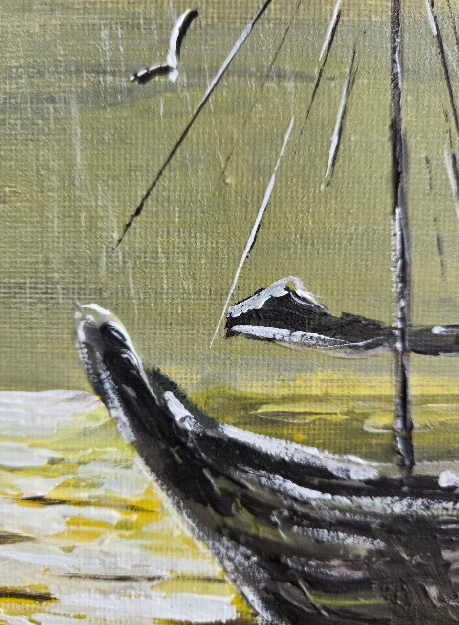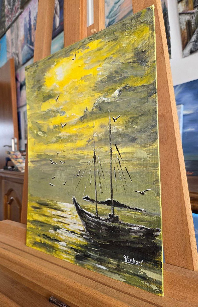 The overall yellow color scheme gives the painting a feeling of warmth and silence. Everything around seems to be dissolved in the honeyed light of the setting sun: the sky, the sea, the boat – everything is permeated with one calm, contemplative emotion. The painting seems to invite you to stop, breathe in this golden evening and feel the peace that comes after a day filled with work and sea breeze.