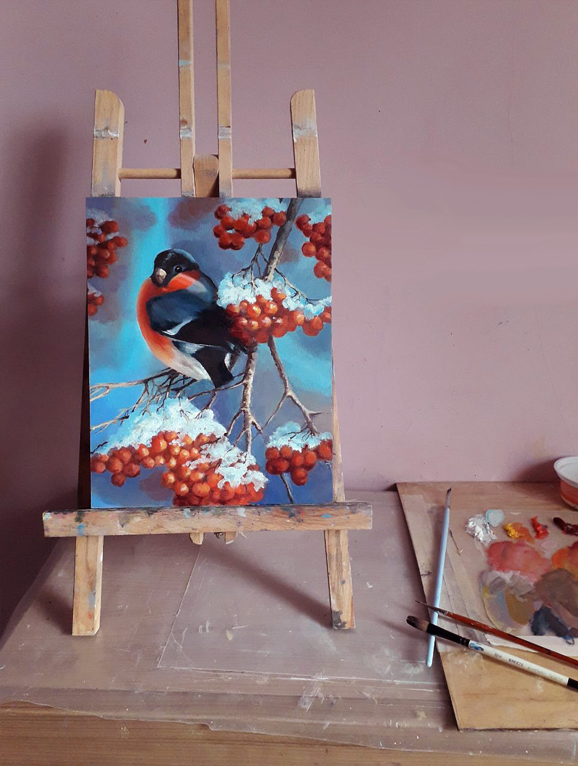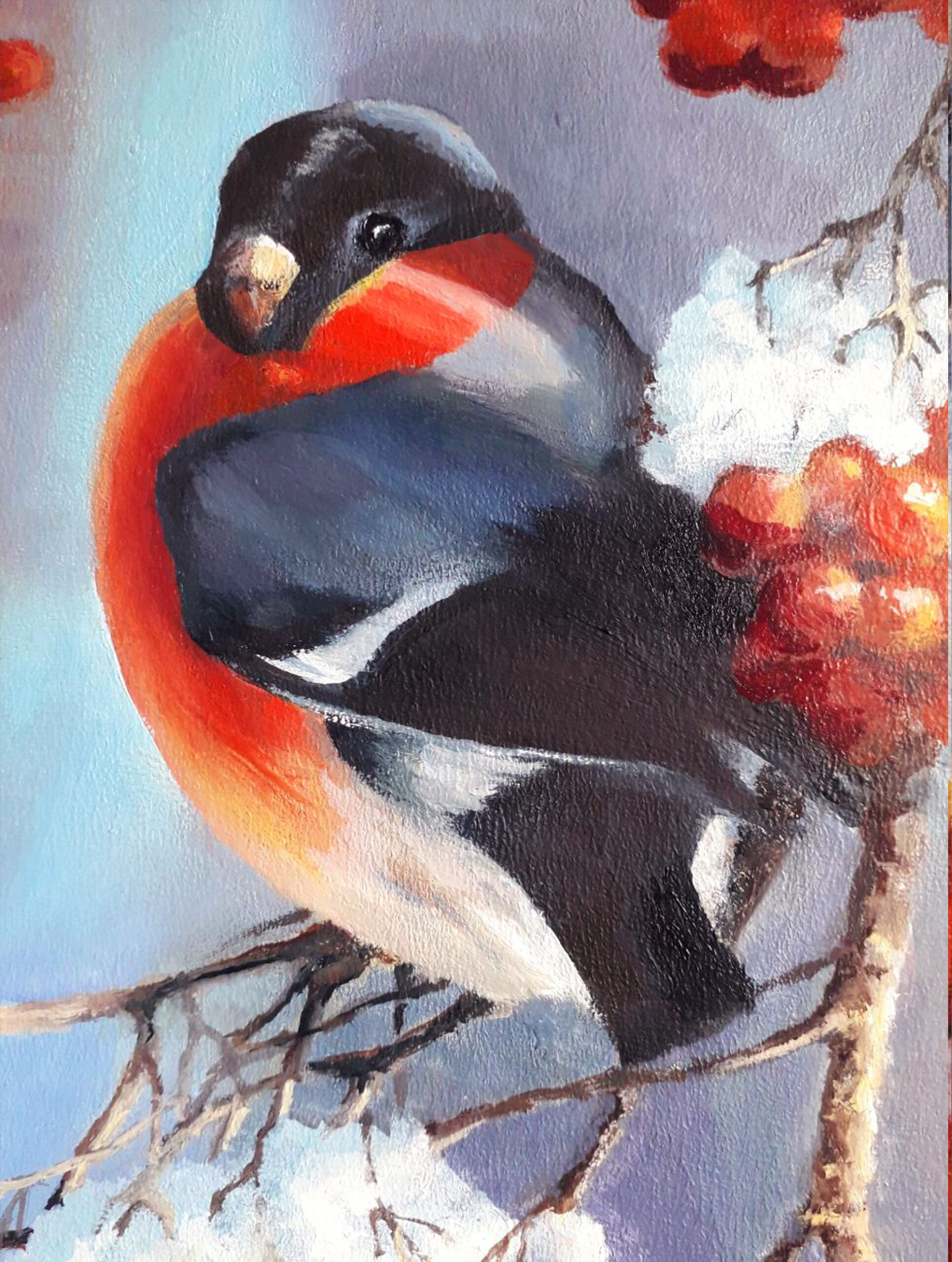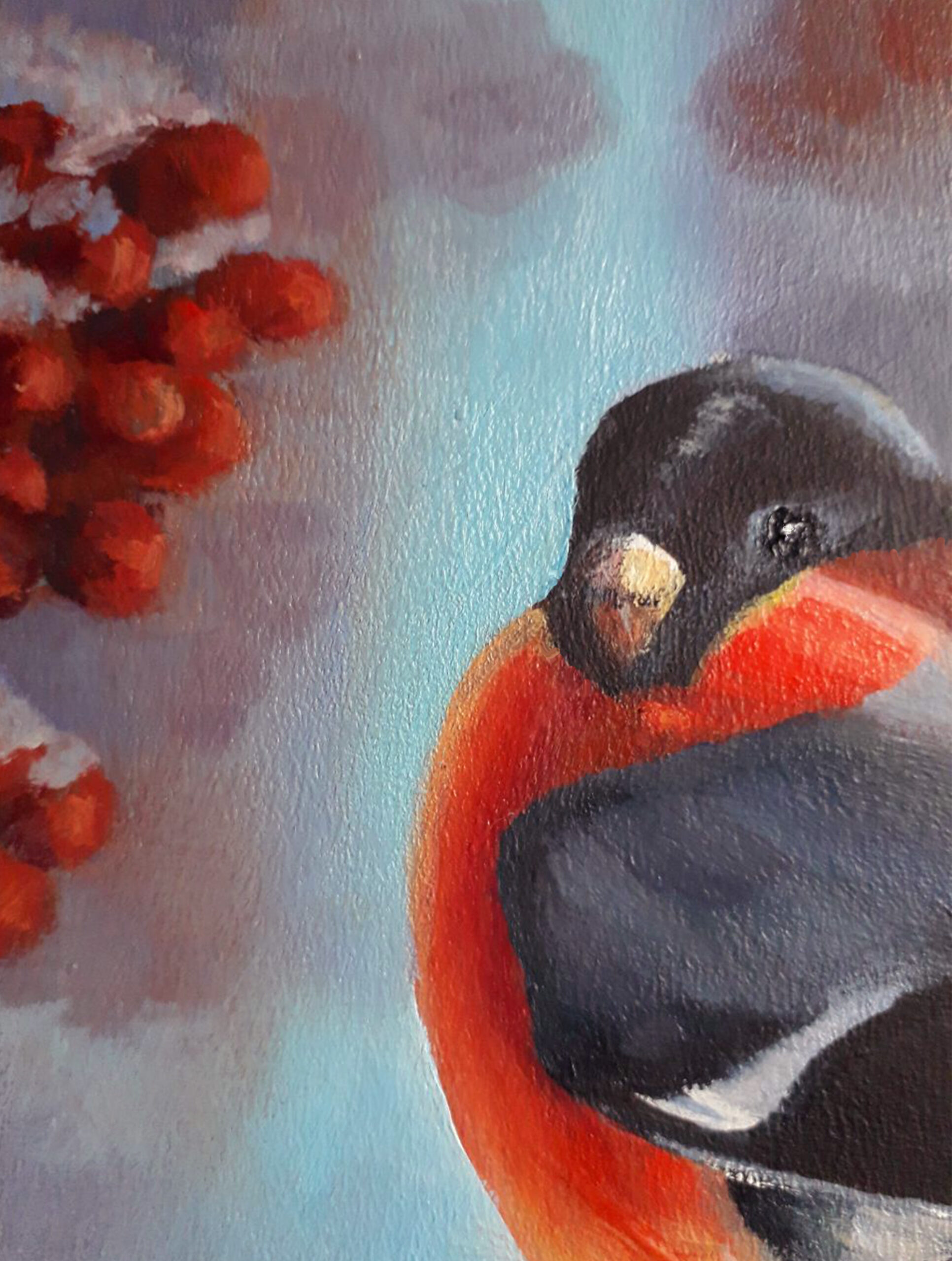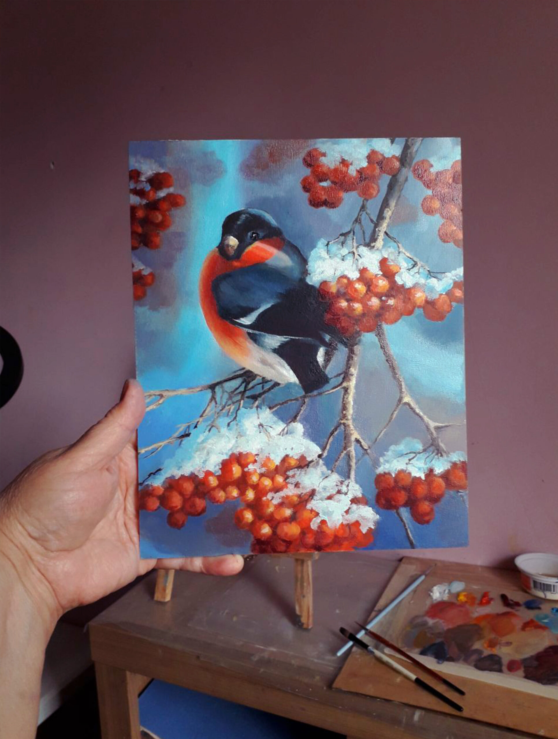 Original oil painting. Bird. Bullfinch. 20×25 cm / 7.6×9.6 in