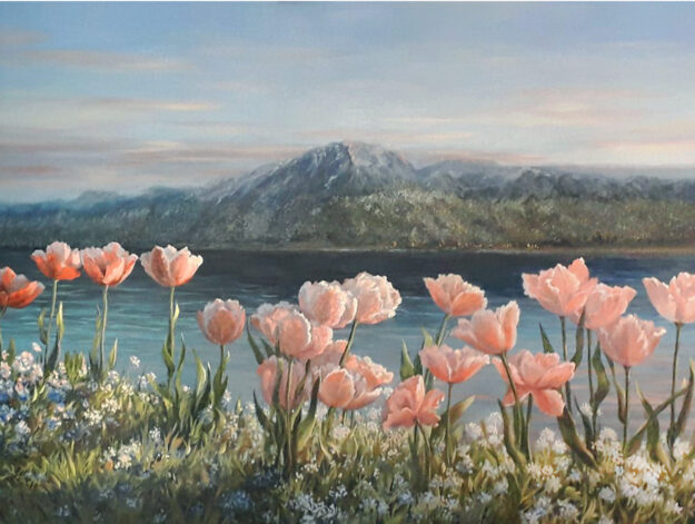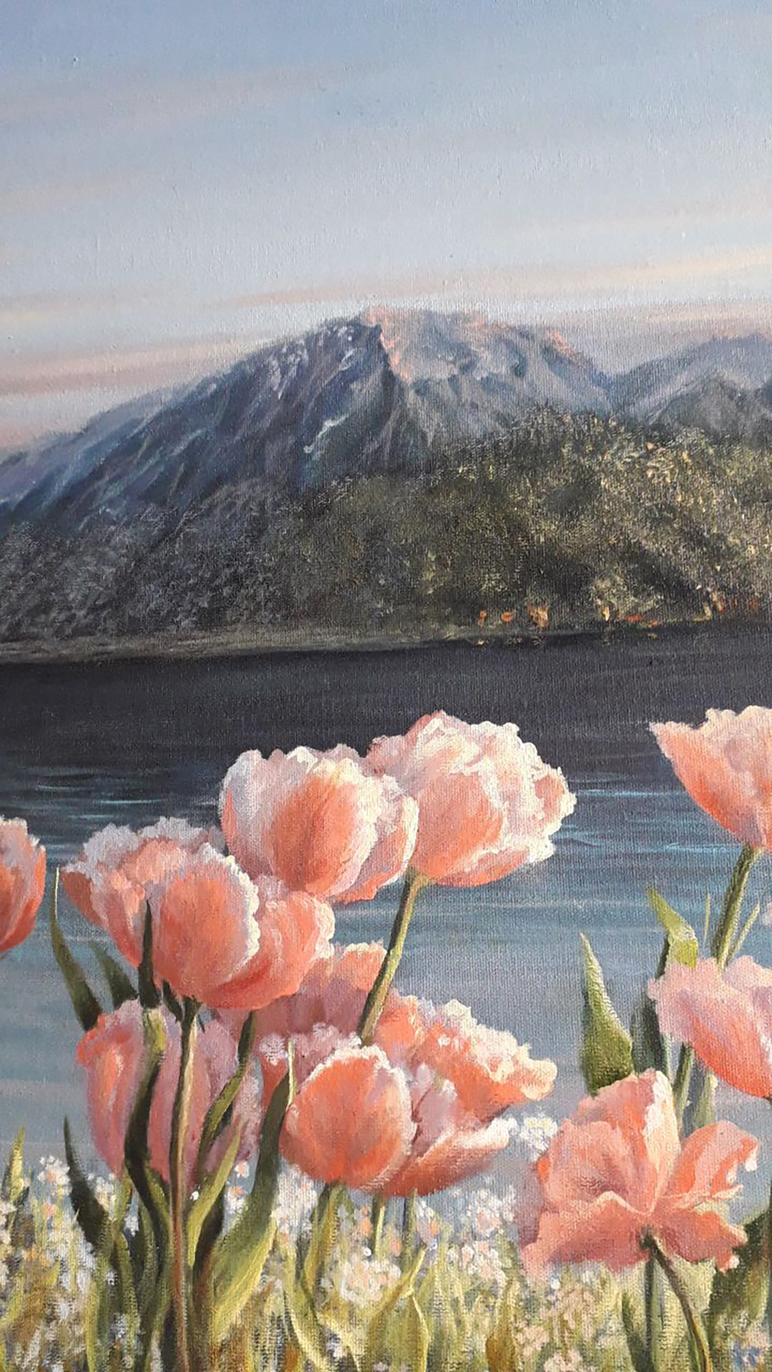 Delicate tulips, waking up, shed the remnants of the starry night, greeting everything around them with a good morning. The dawn fog recedes from the playful transparent rays, revealing the mighty shoulders of the mountains. All the grandeur and depth of their beauty is reflected in the calm water.