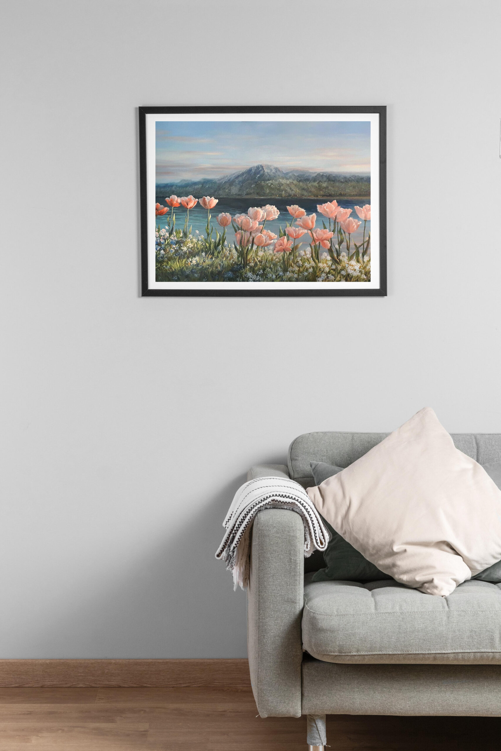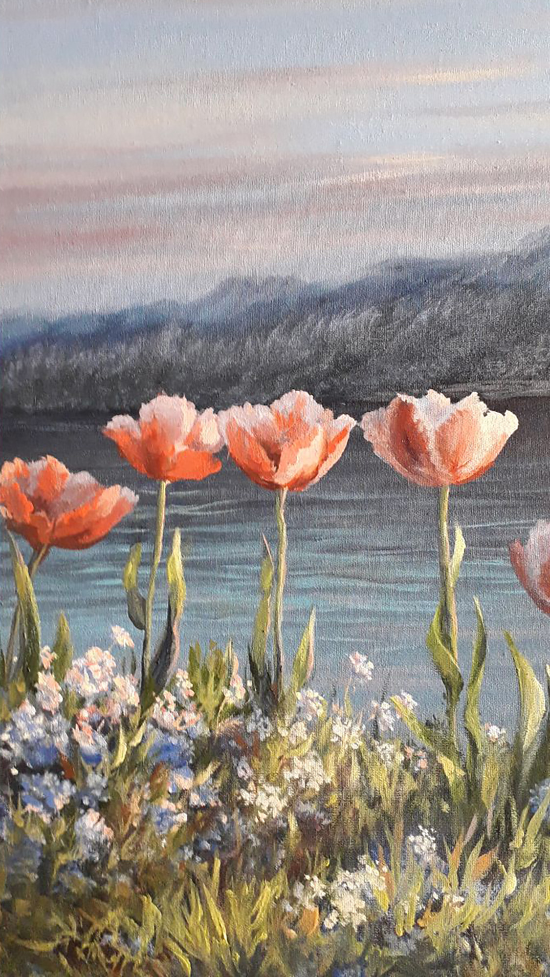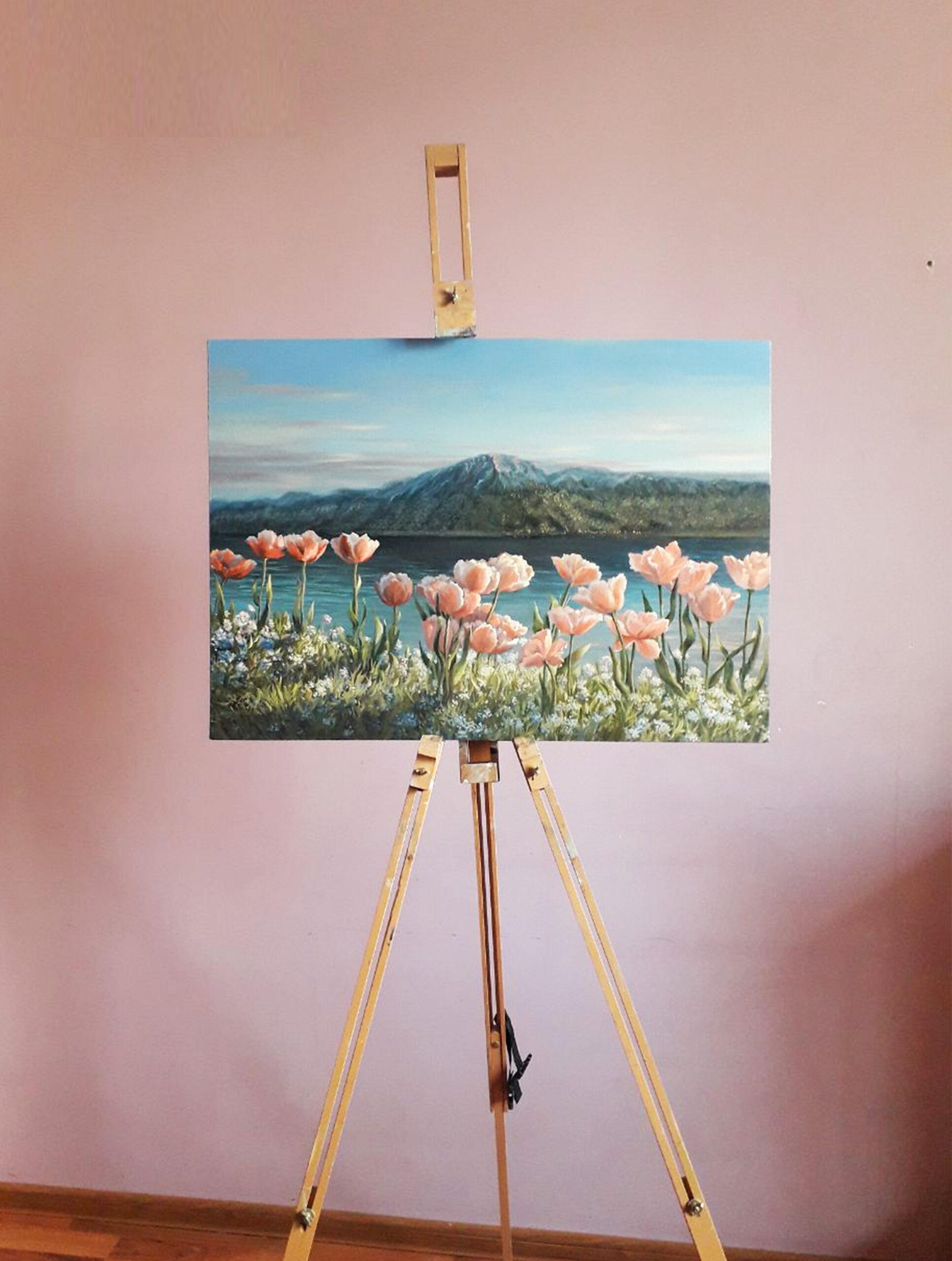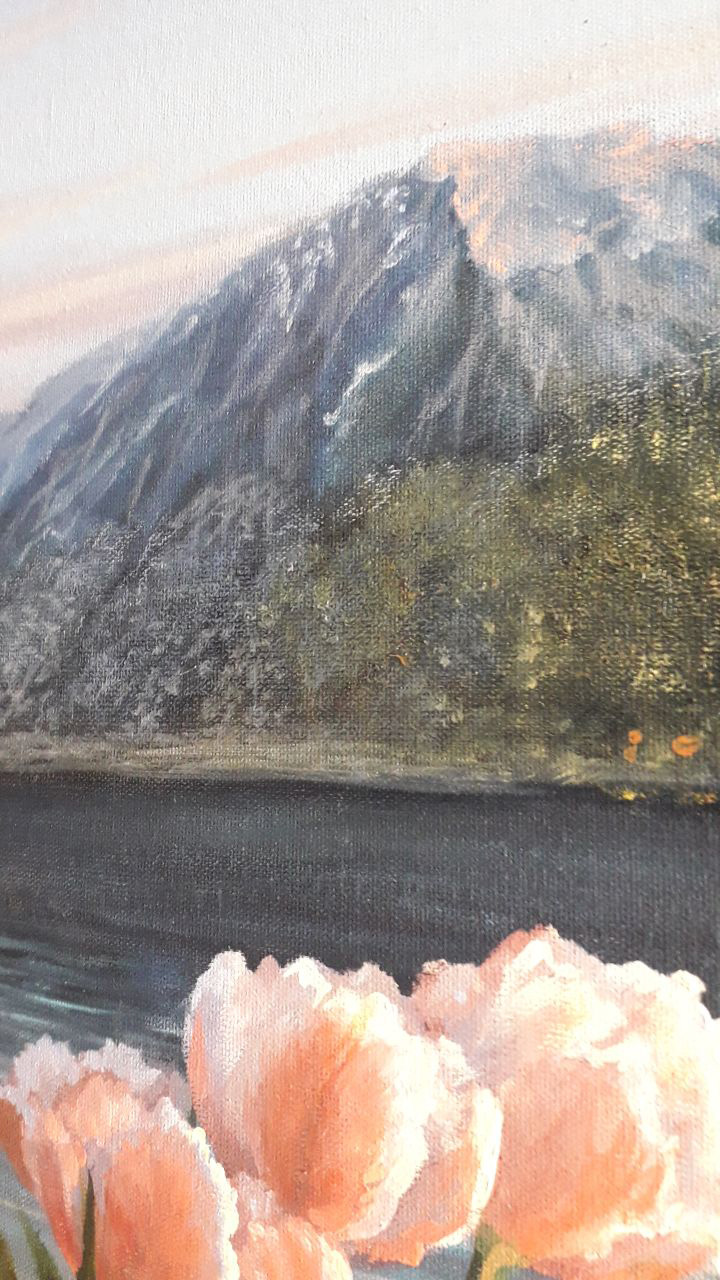 Original oil painting. Landscape. Gentle morning. Mountains. Sea. Flowers tulips. Canvas on fiberboard 50X70 cm