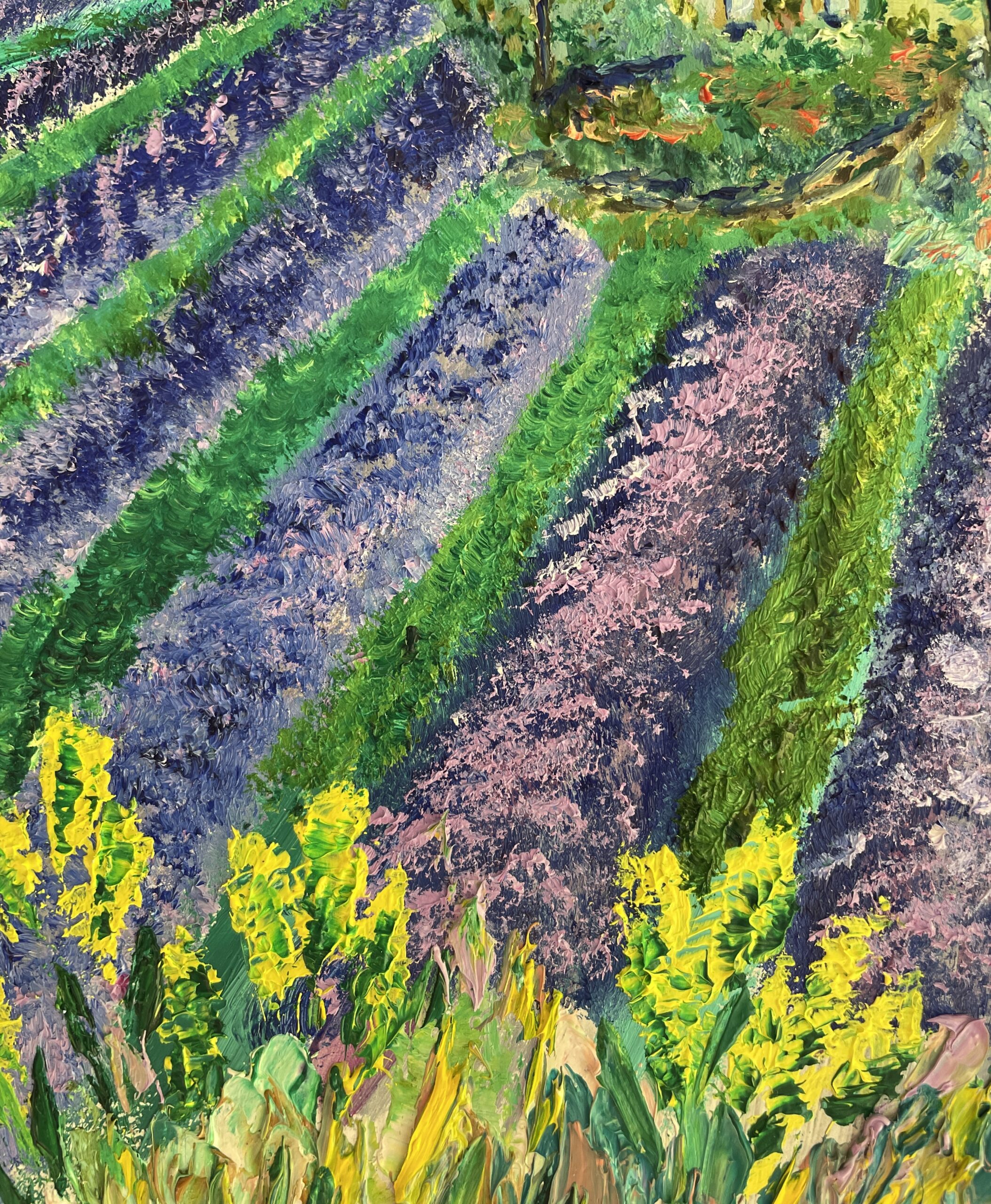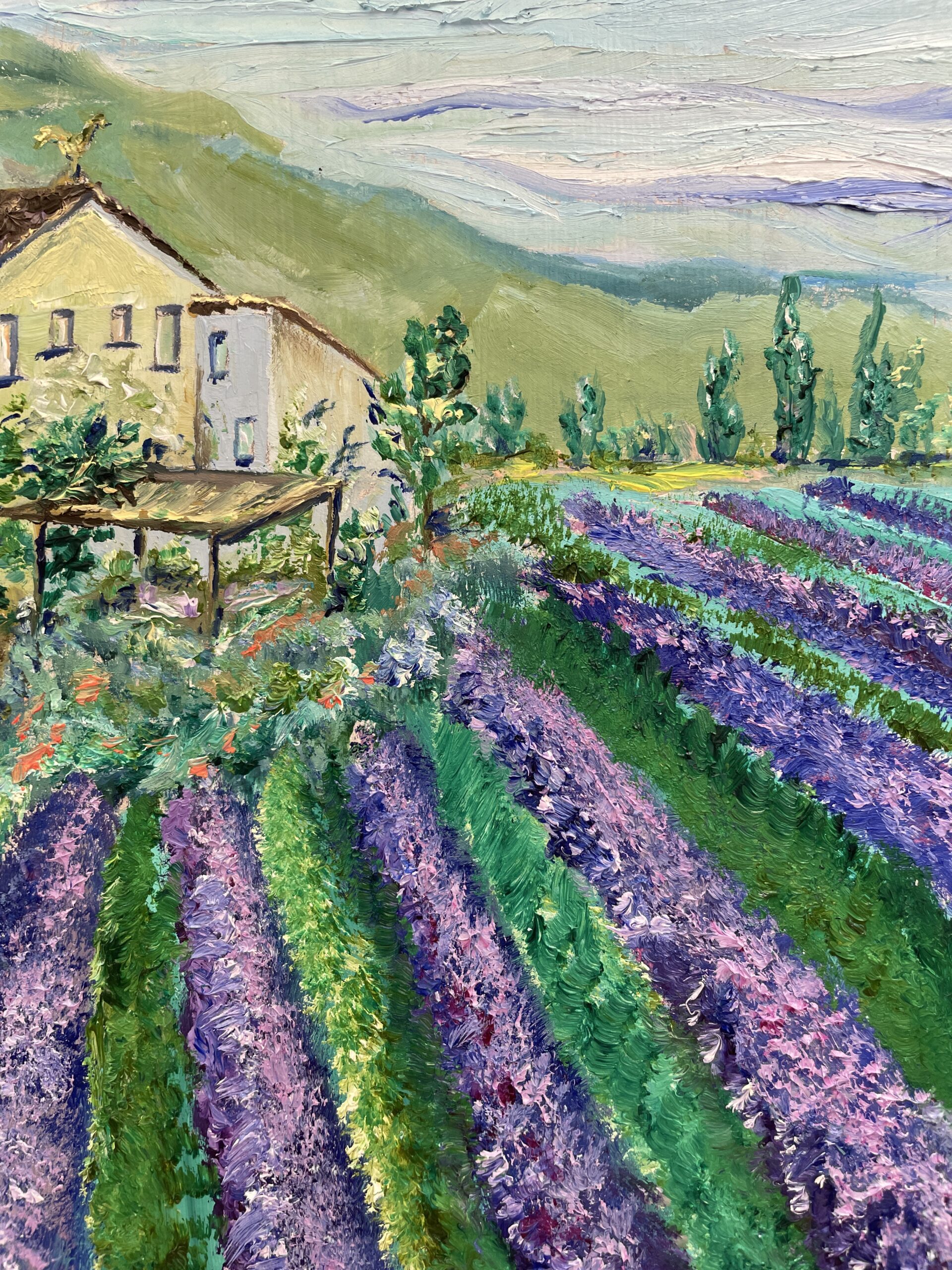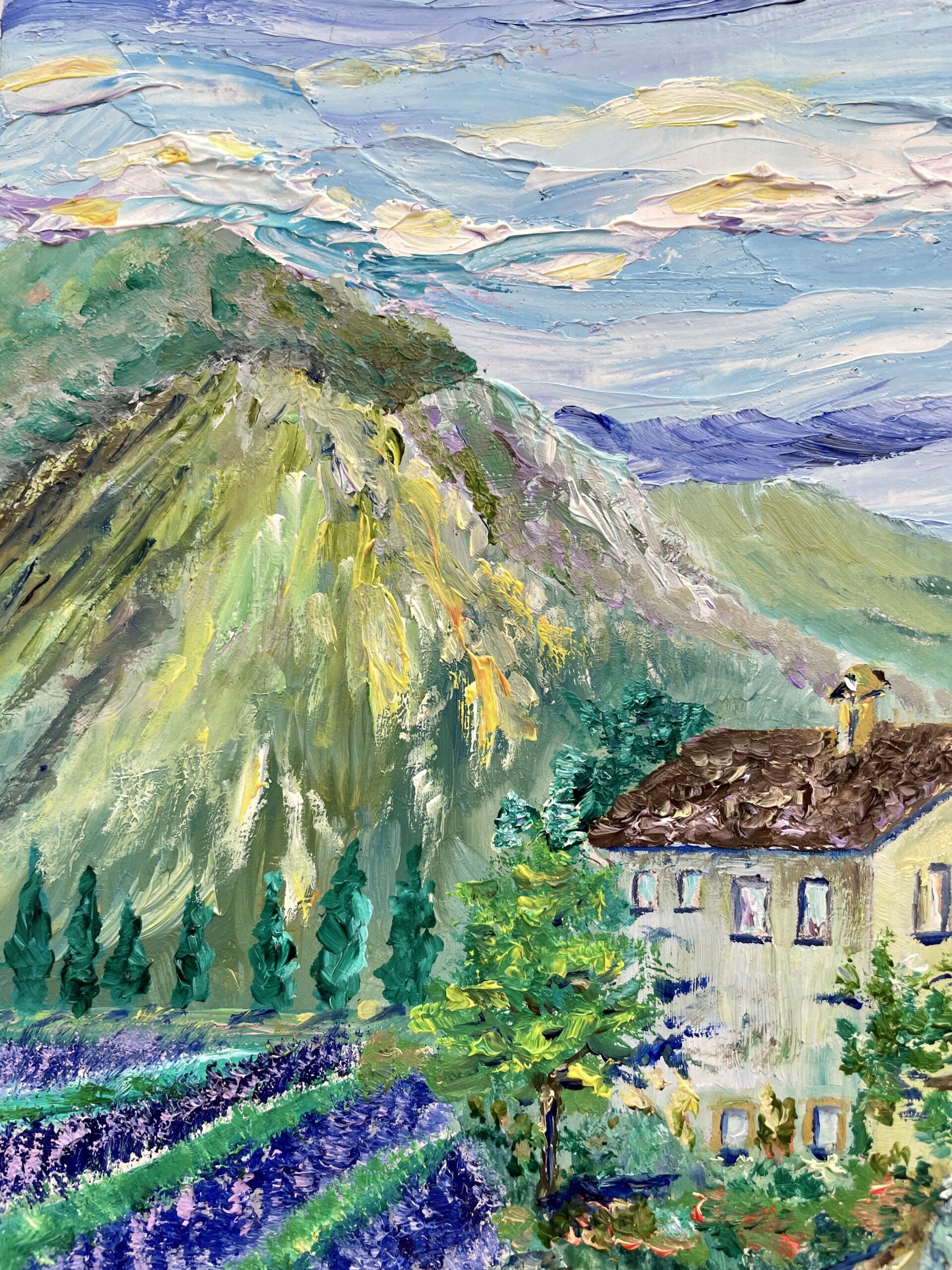 In one Italian film I saw an interesting house in the countryside among fields and long lines of trees. There was a very old villa made of stones but with some renovations. I decided to paint it, but to place in an imaginary surrounding – beautiful and peaceful, with mountains and a lot of flowers. Idyllic landscape filled with serenity and tranquility, showing that simple life can be very charming and pleasant.