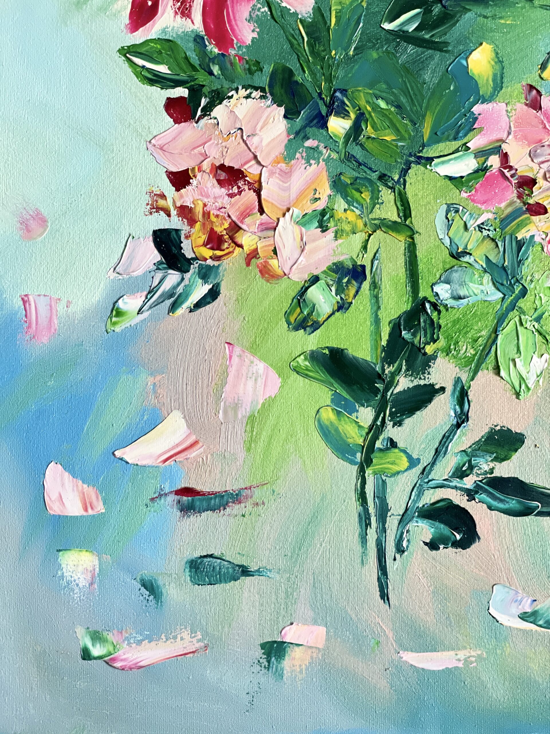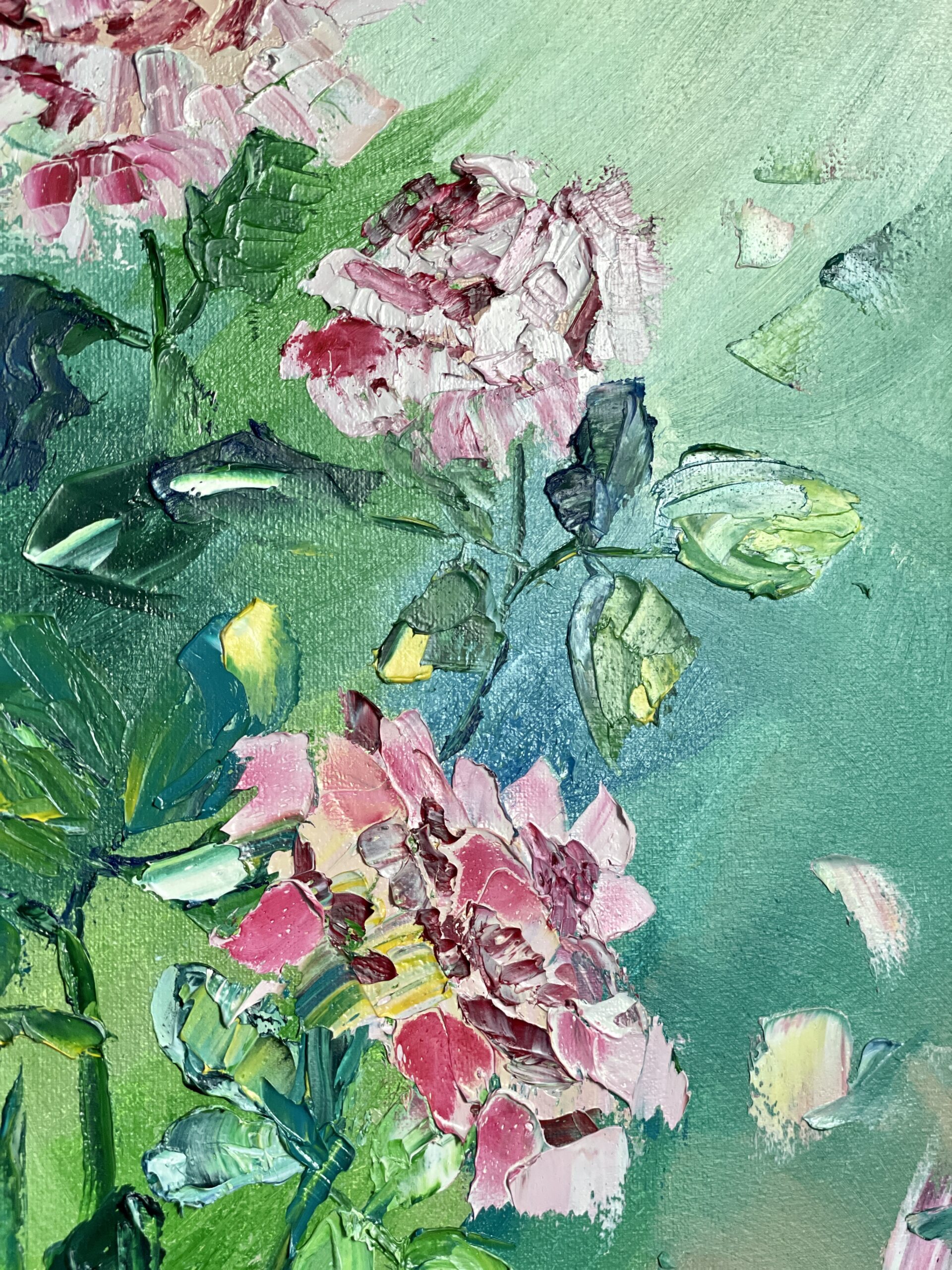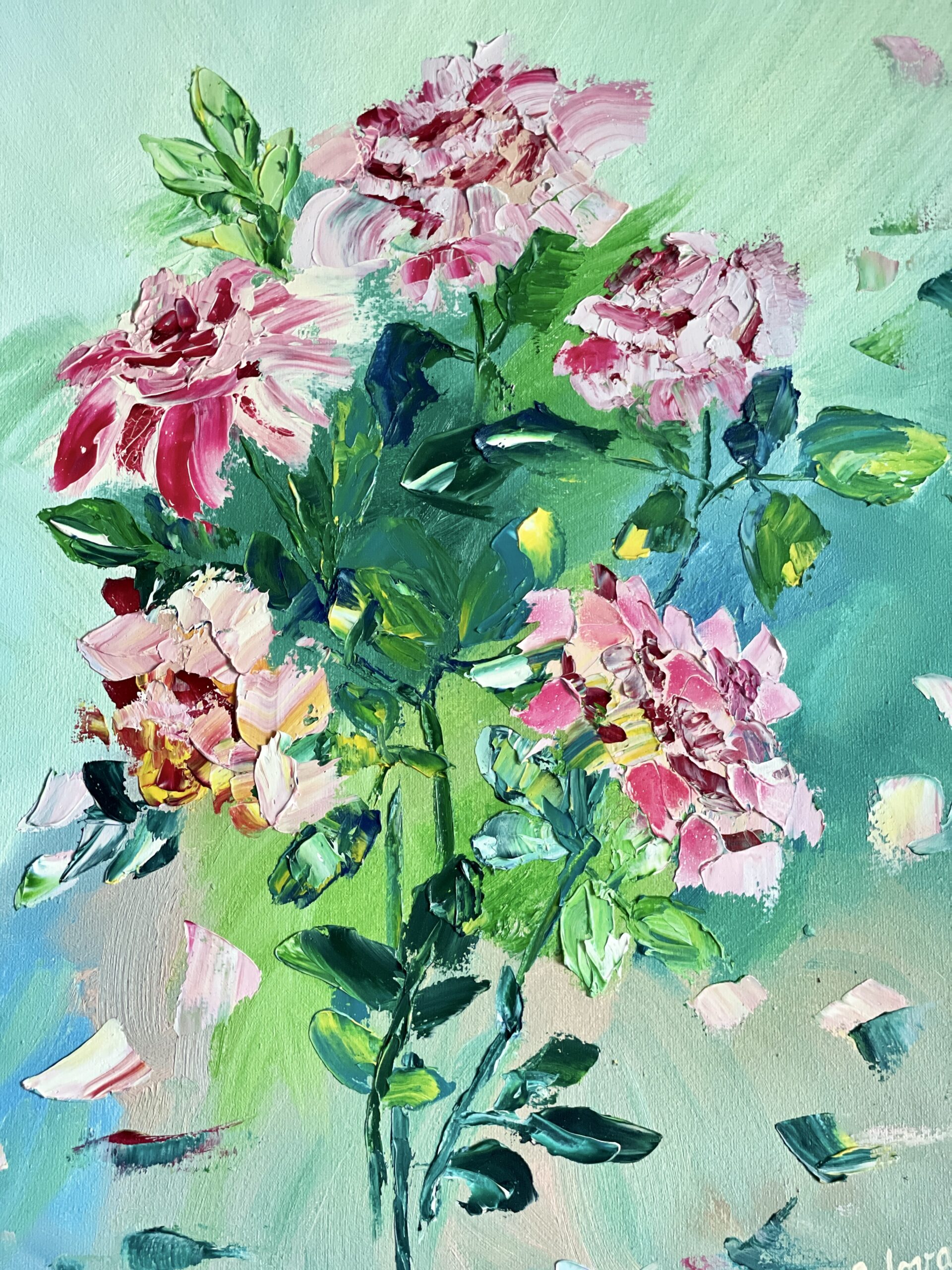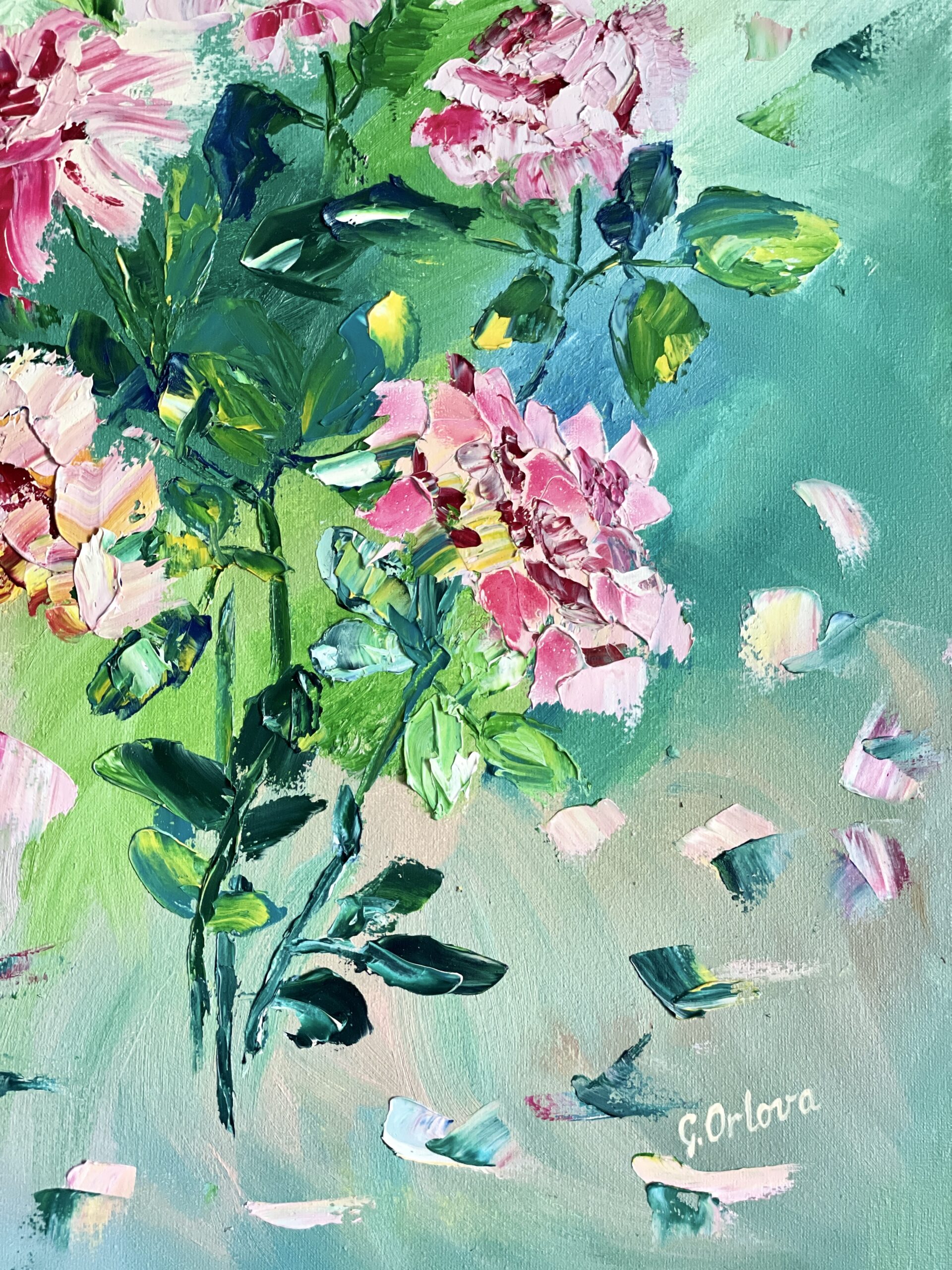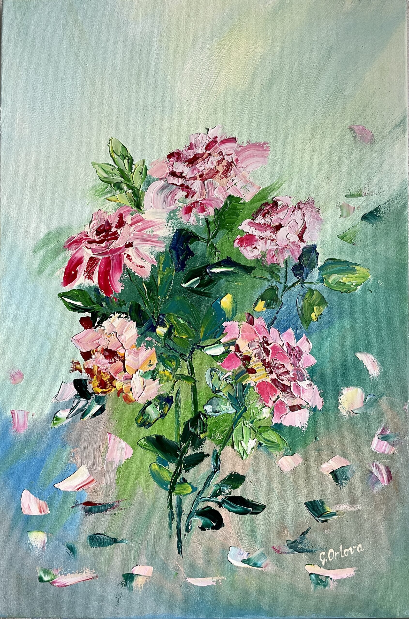 Dancing Roses – is a nice mood painting, the rosy and pink petals are flying in a playful mood. The roses are made in a non-traditional way, stylized slightly to add some original look, approach.