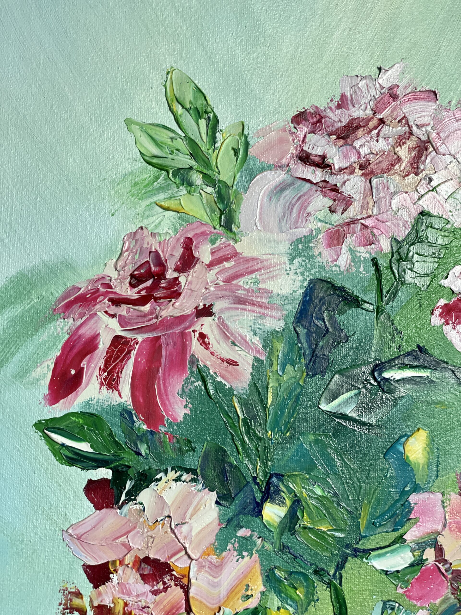 The background is painted with a brush, and the flowers – with a wide pallet-knife. Light-rosy and deep purple colors create the contrast between light and shadow to attract attention of the viewer.