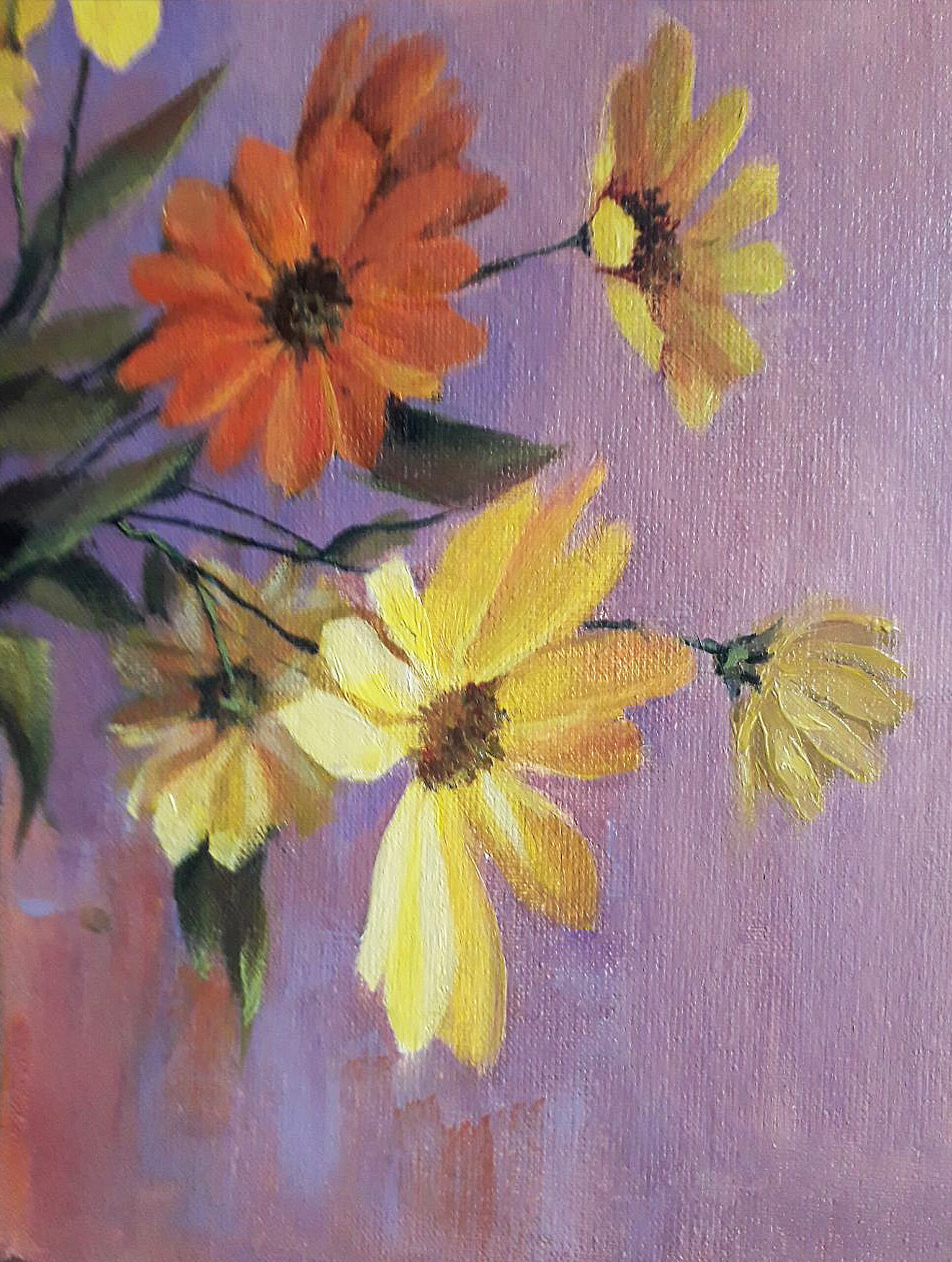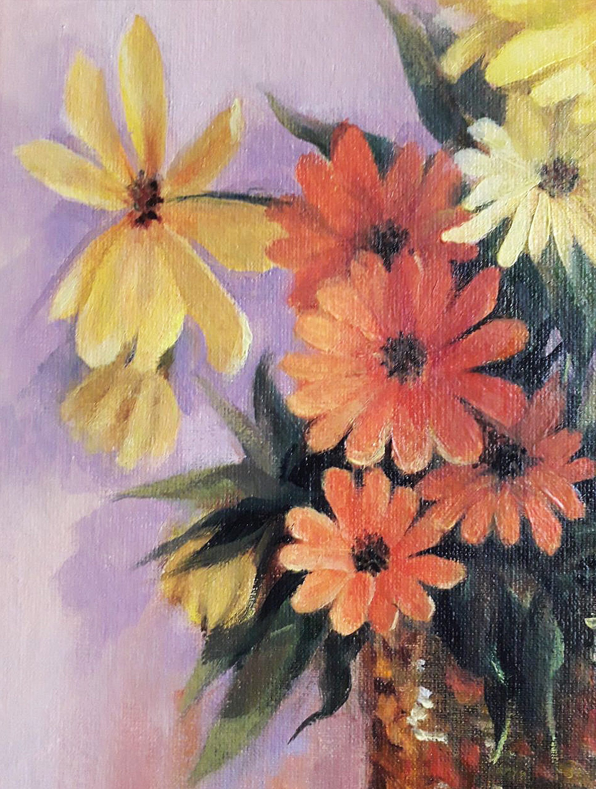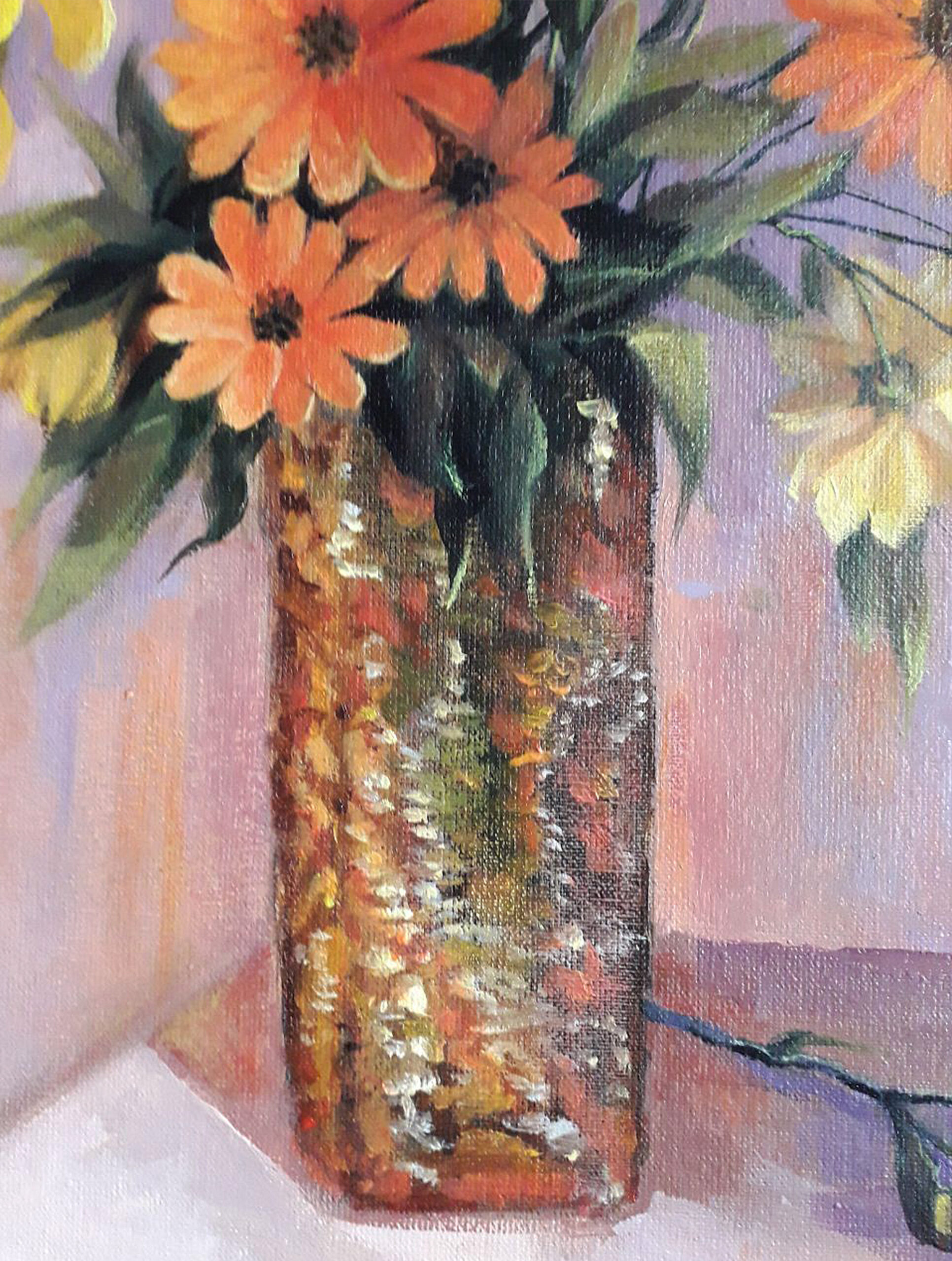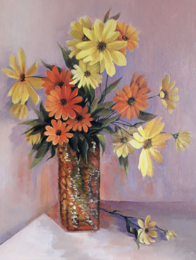Original oil painting. Yellow and orange flowers in a vase. 11.8 x 15.7 in