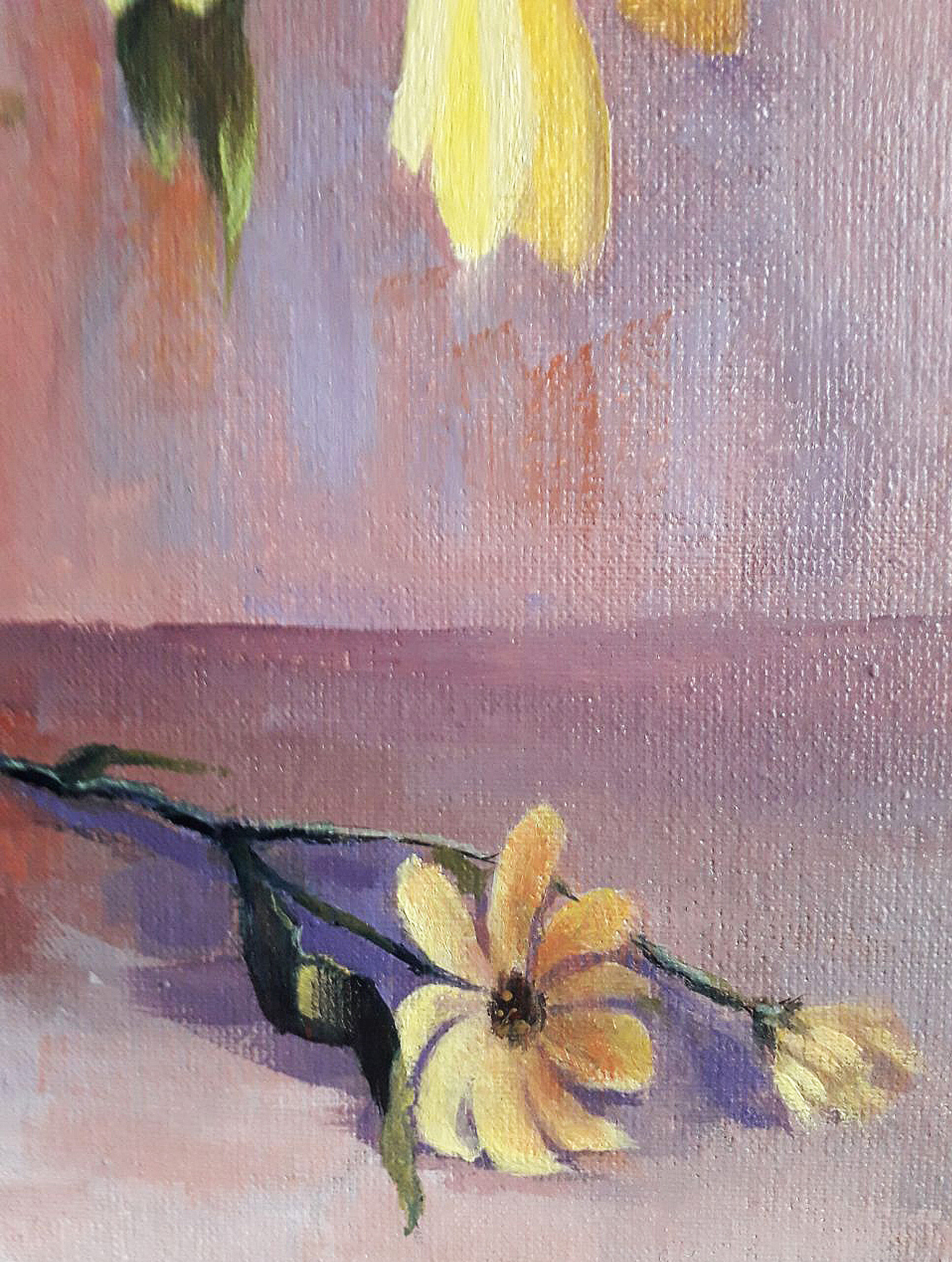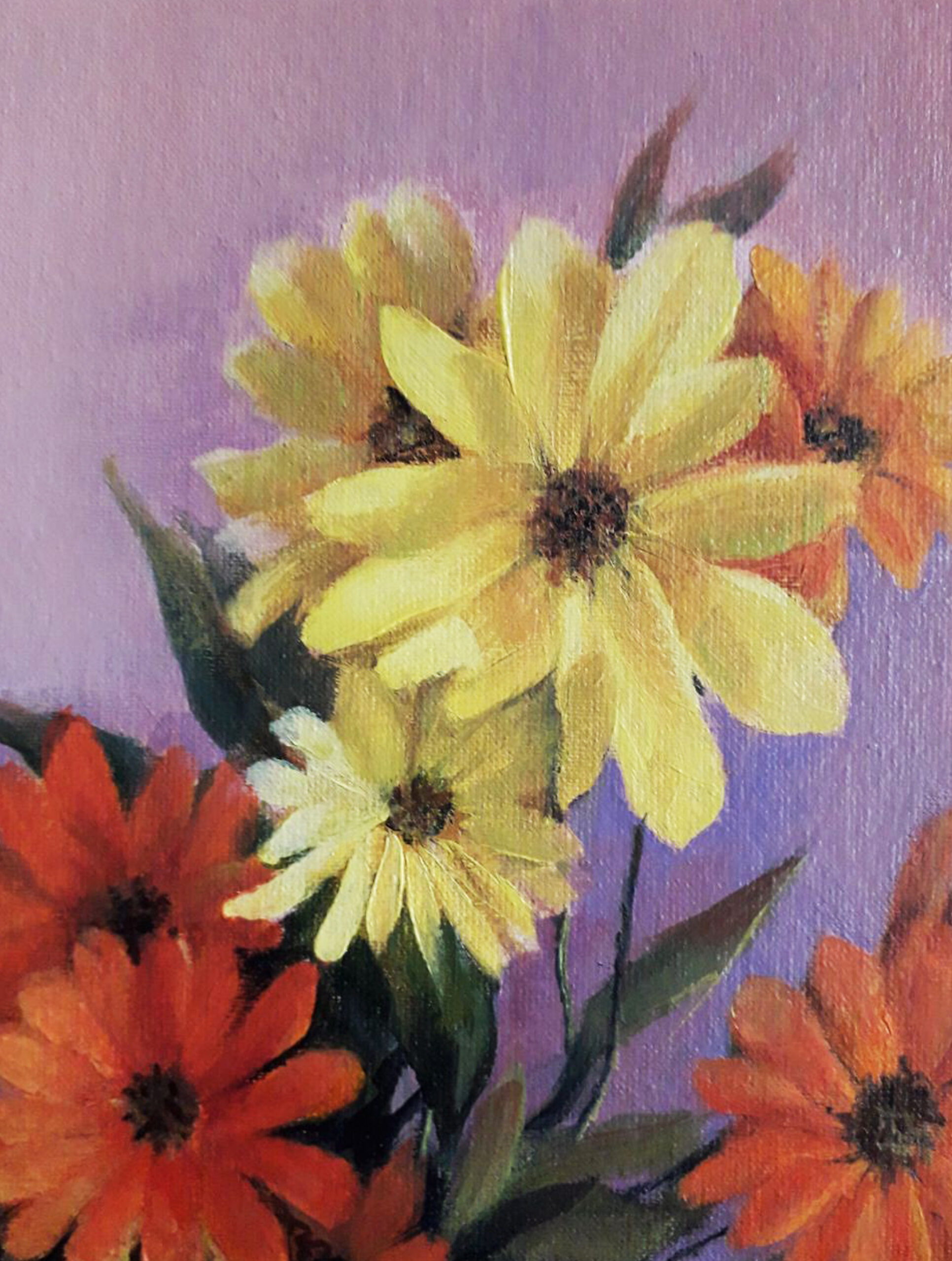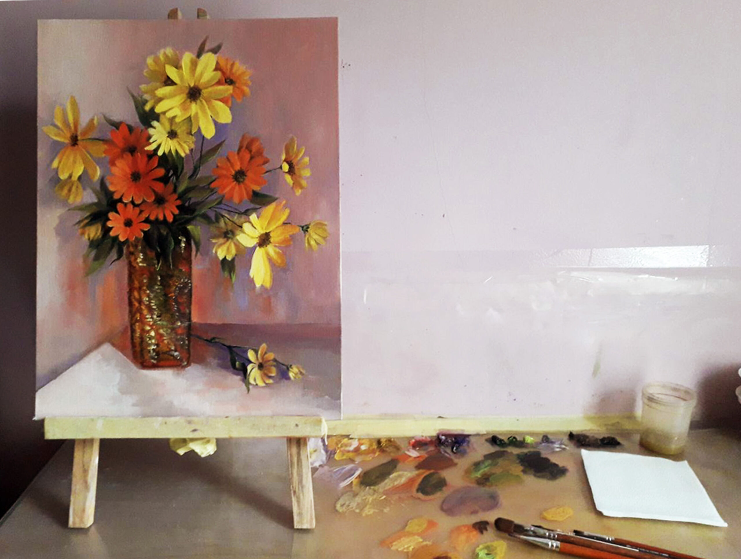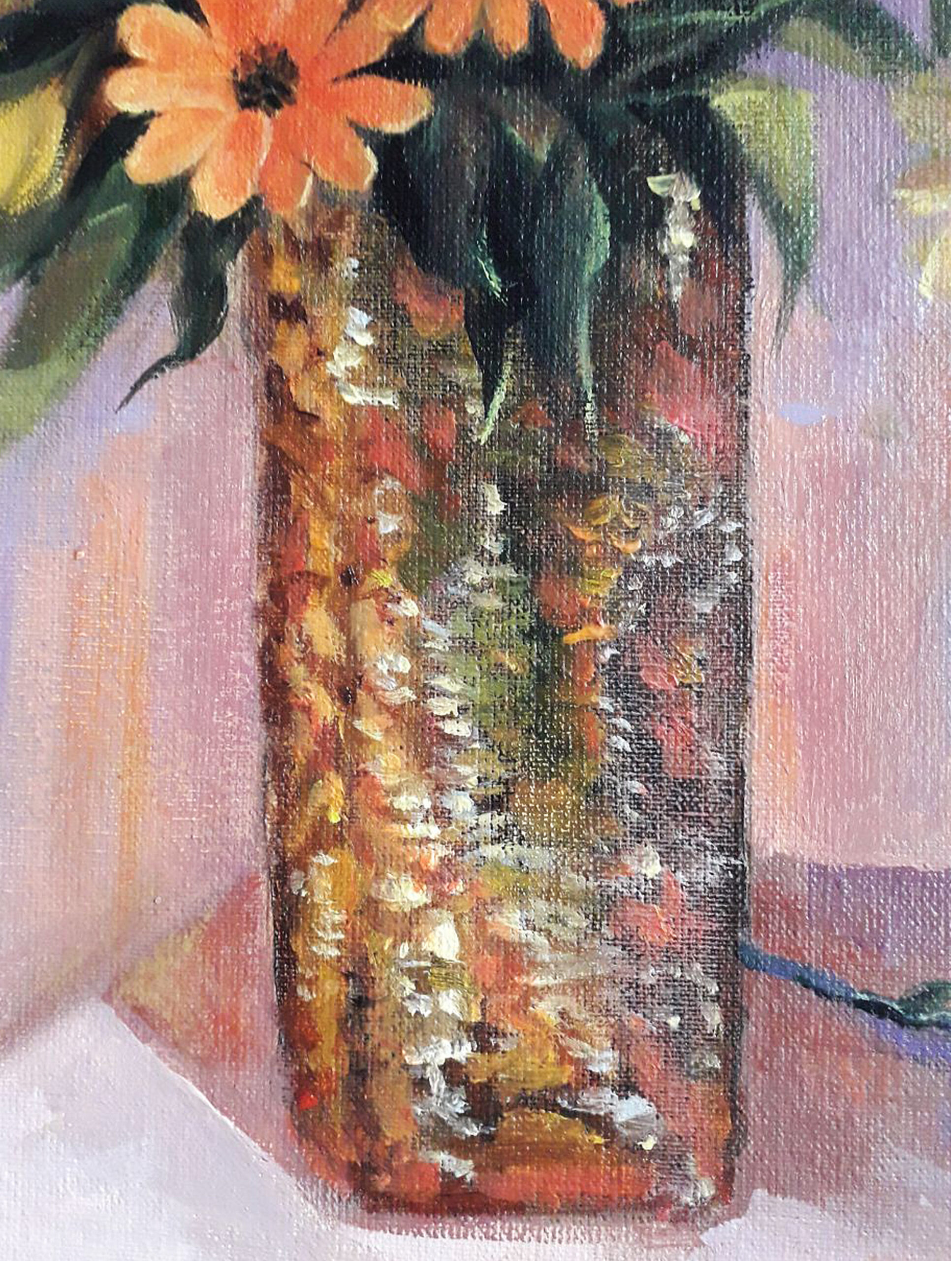 Original oil painting. Yellow and orange flowers in a vase. 11.8 x 15.7 in