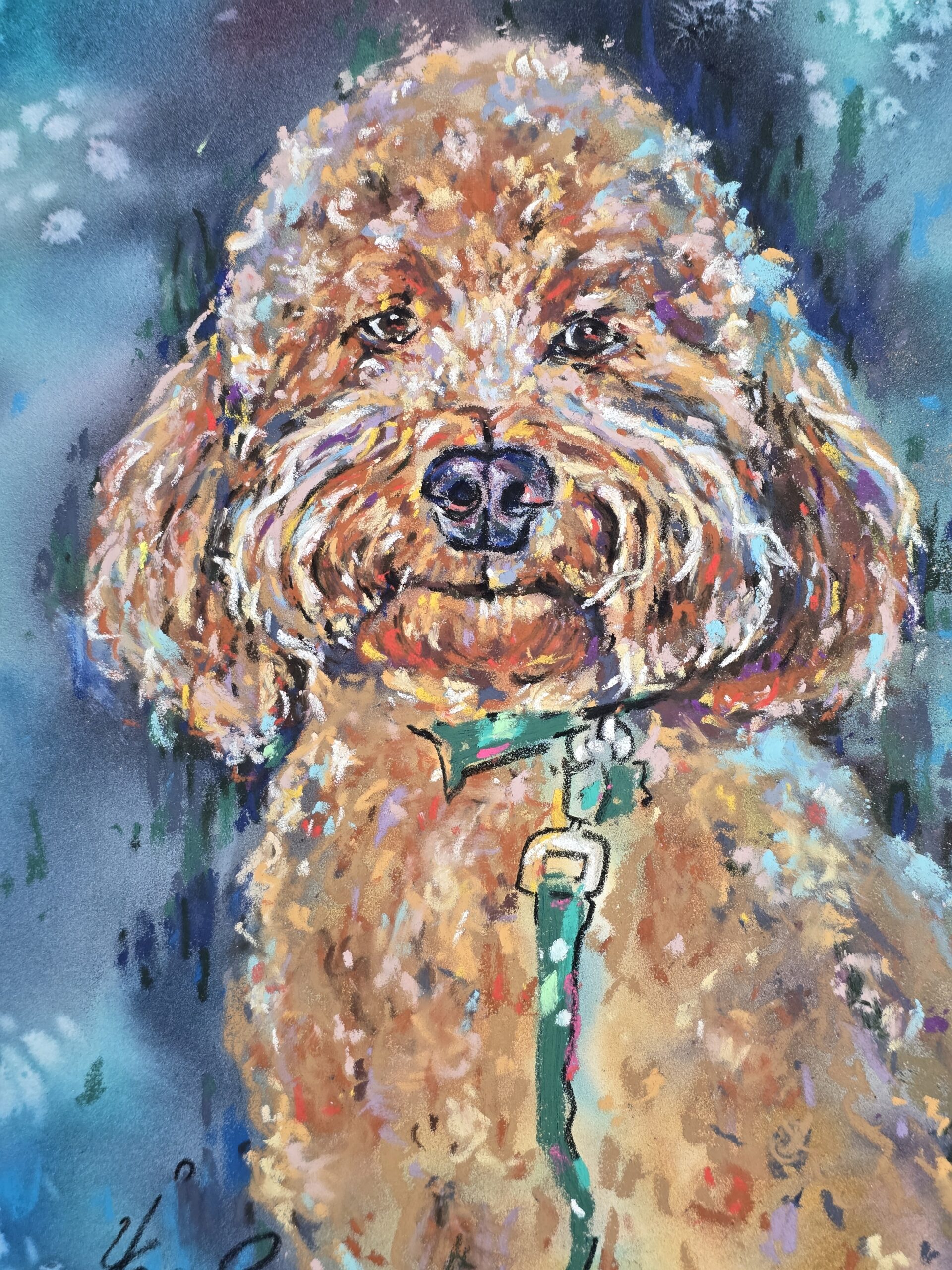 🎨This original Peach Poodle dog portrait is painted with a combination of watercolor and soft pastel, giving the artwork a soft yet vibrant texture. The warm peach-colored coat, soulful eyes, and lively background bring this poodle to life on paper, making it a charming piece of dog wall art.