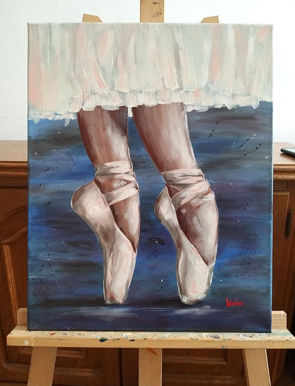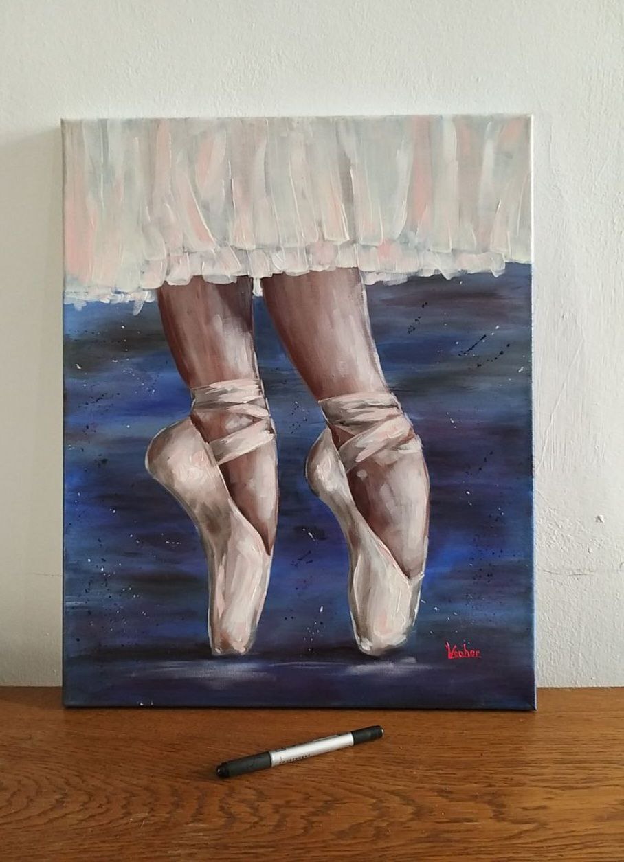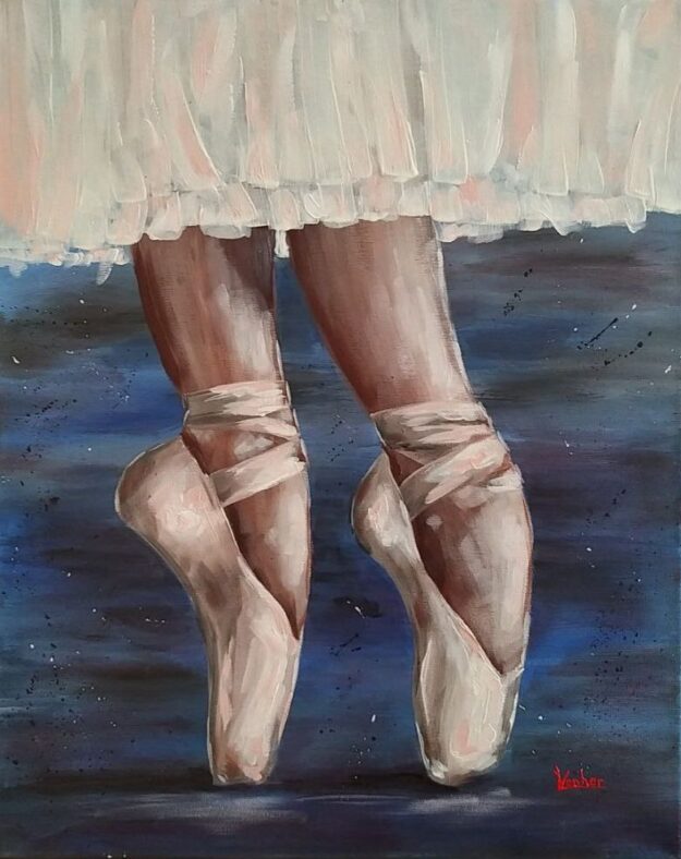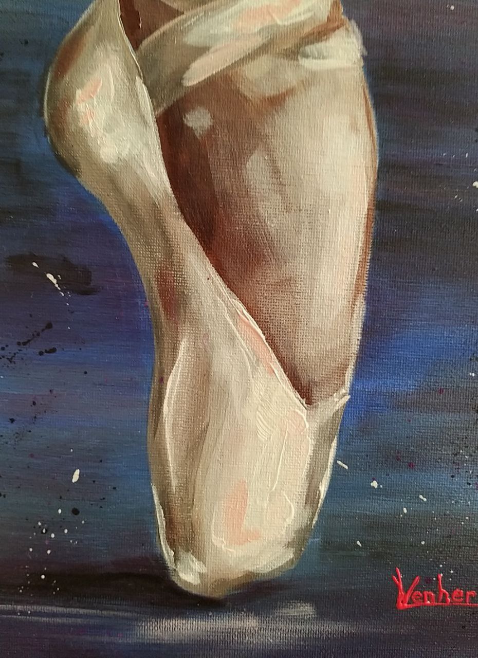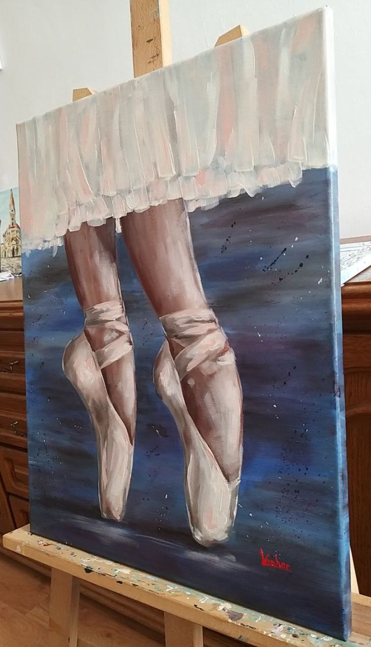The painting “Pointe Shoes” depicts a graceful and slightly mysterious moment of dance. The ballerina’s light, airy movements stand out against a dark, almost velvety background. The focus is on her feet, encased in white pointe shoes, tense and graceful, as if just before a leap or after a smooth turn. Light falls softly from above, highlighting the curves of her ankles, the slenderness of her shin, and the sheen of her satin ribbons.