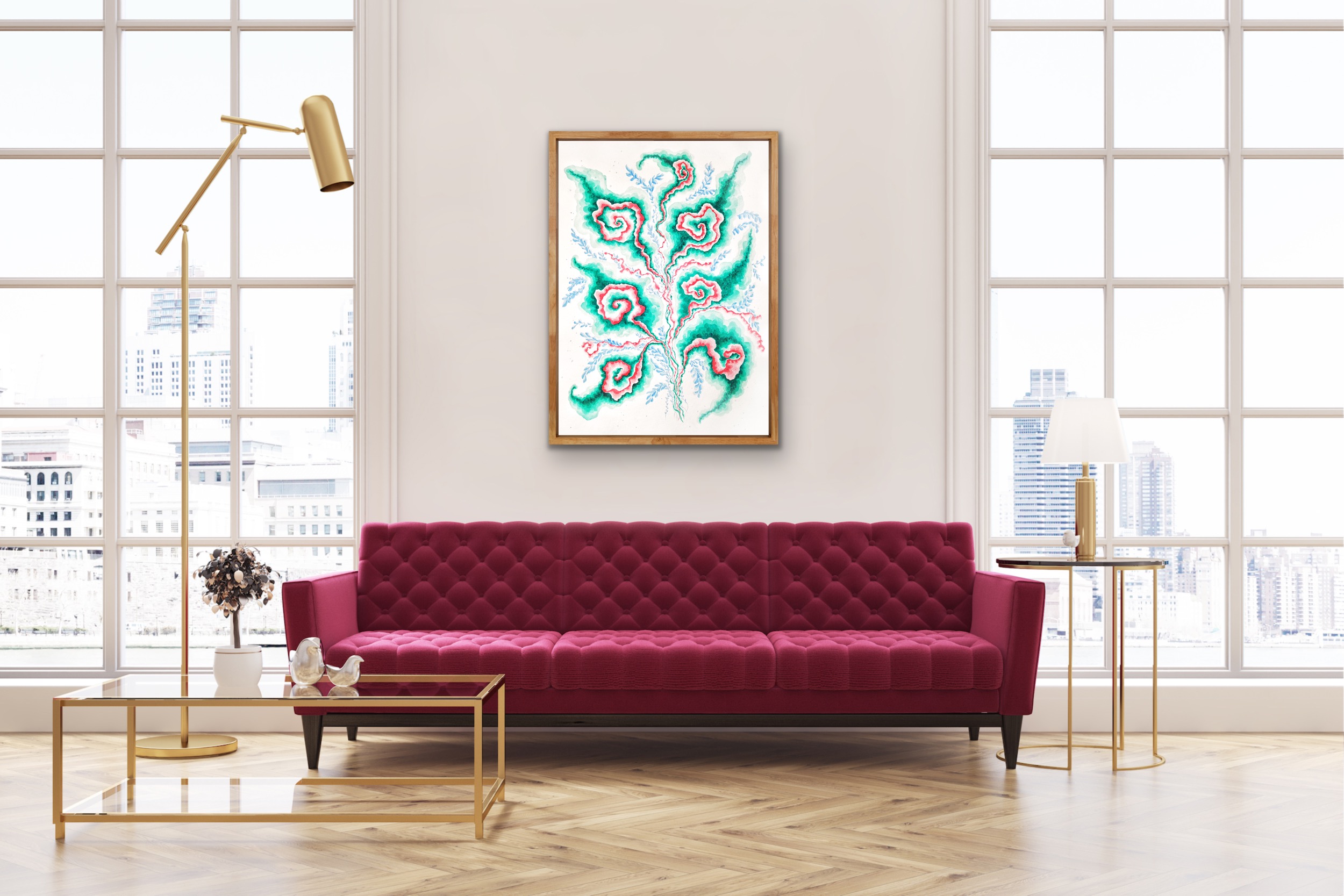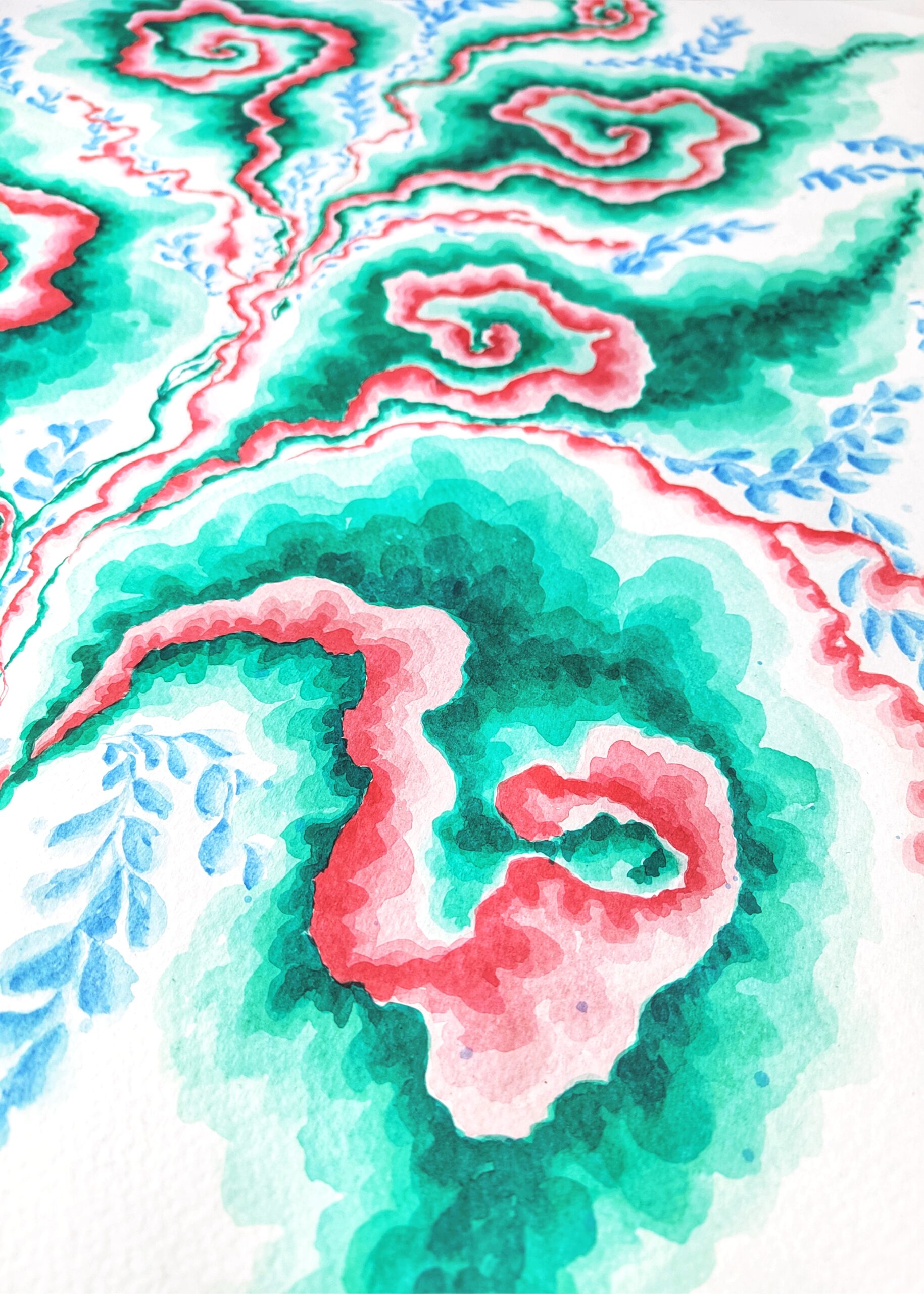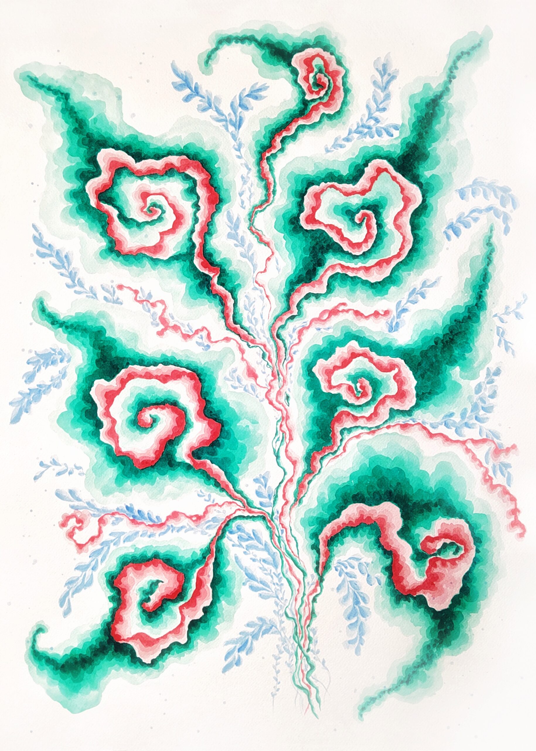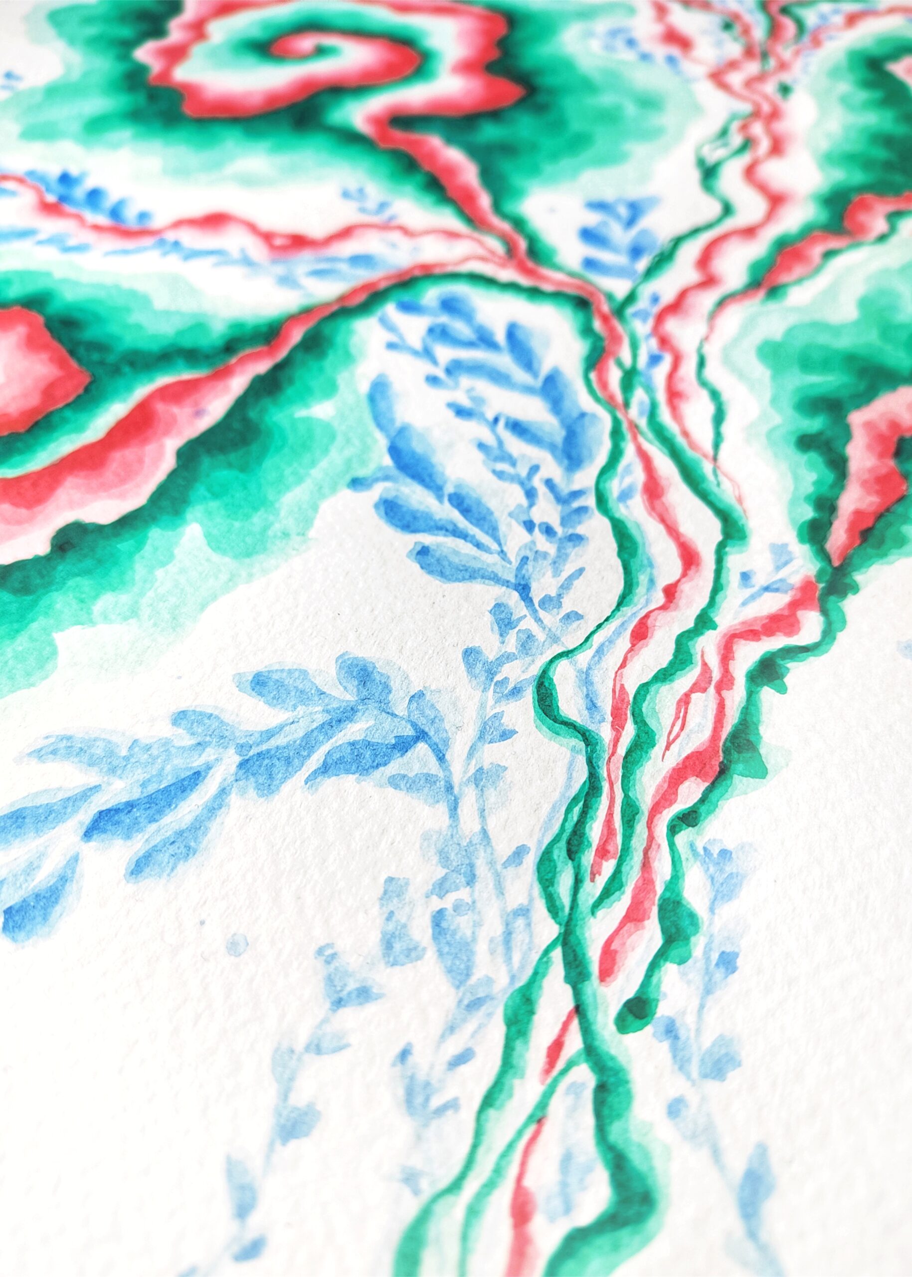 A mesmerizing watercolor composition that blurs the line between beauty and danger. This artwork features intricate swirling tendrils in deep green and crimson hues, resembling an otherworldly bouquet of toxic blossoms. Delicate blue leaves weave through the composition, adding a touch of eerie elegance. The fluid transitions between colors create a pulsating, almost hypnotic effect, as if the plant itself is alive and breathing. This piece invites the viewer to explore the allure of the unknown, where nature’s elegance conceals a hidden menace.