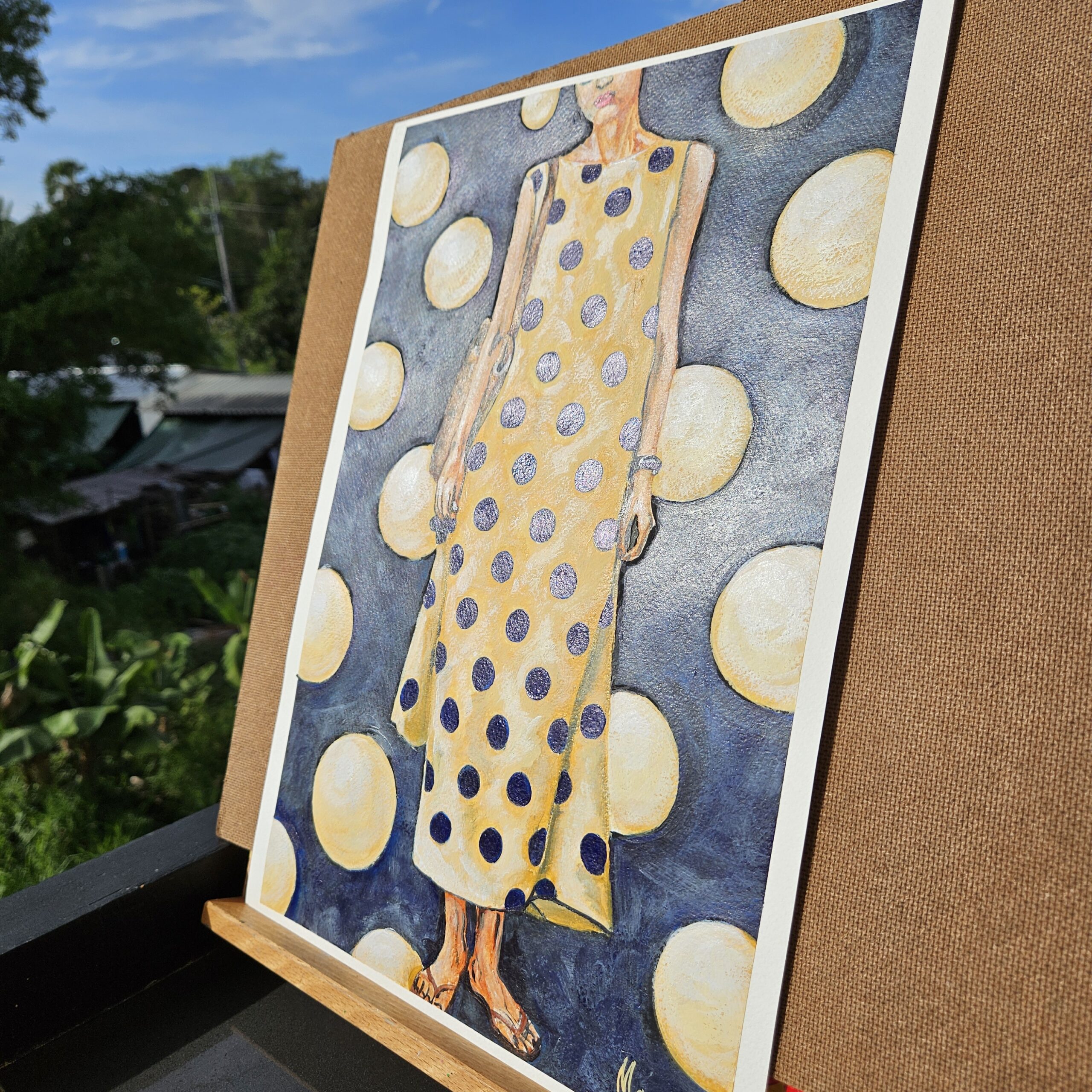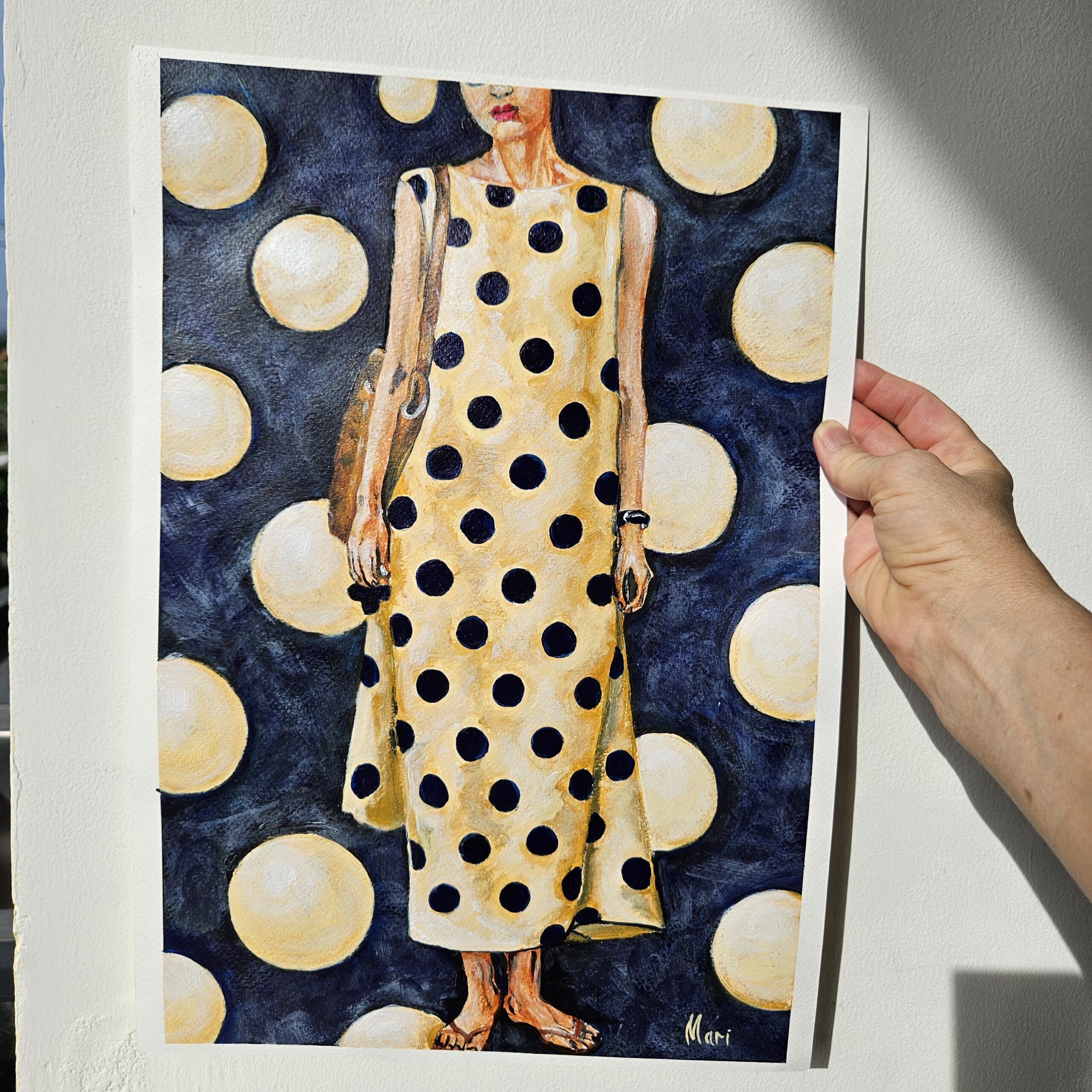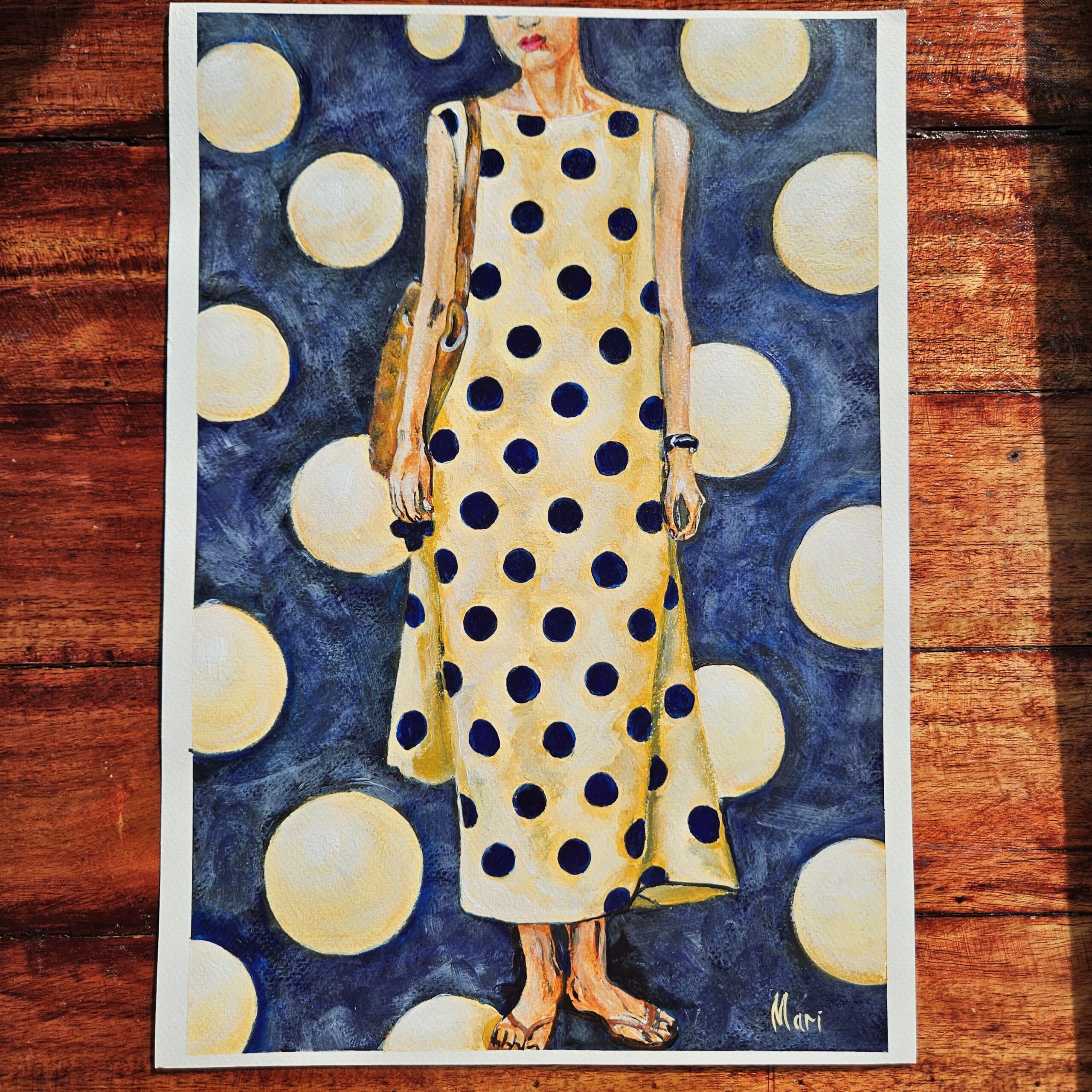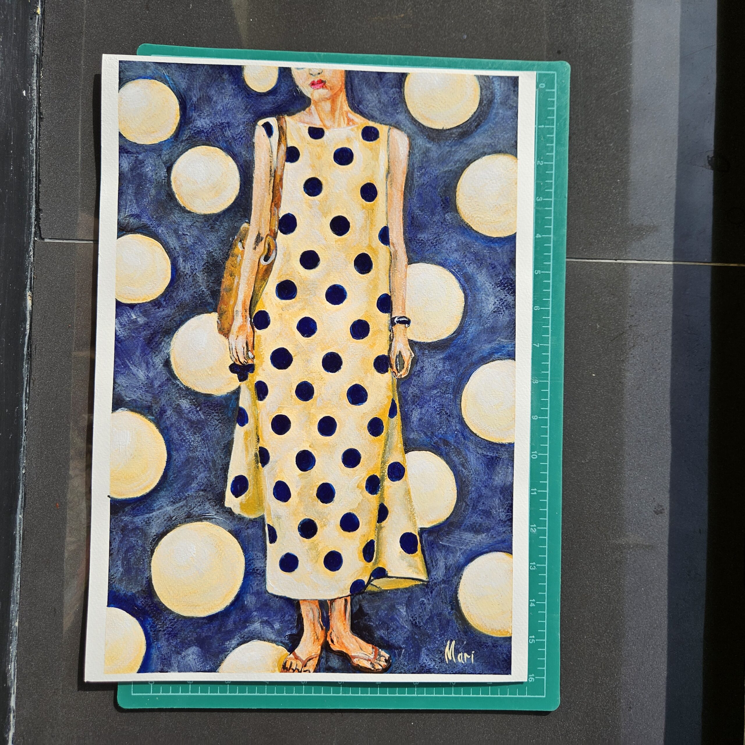 Polka Dot Dress Female Silhouette Fashion Figurative is a vibrant original painting that explores the elegance of fashion and contemporary figurative art. The composition presents a female silhouette dressed in a light dress with bold polka dots, standing against a deep blue background filled with luminous circular forms. The contrast between the soft cream tones of the dress and the rhythmic pattern of dark dots creates a strong visual identity and playful modern aesthetic.