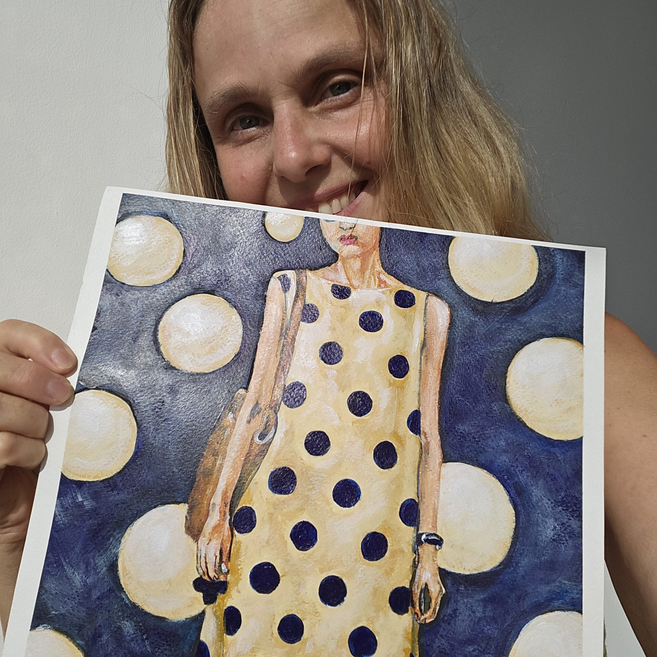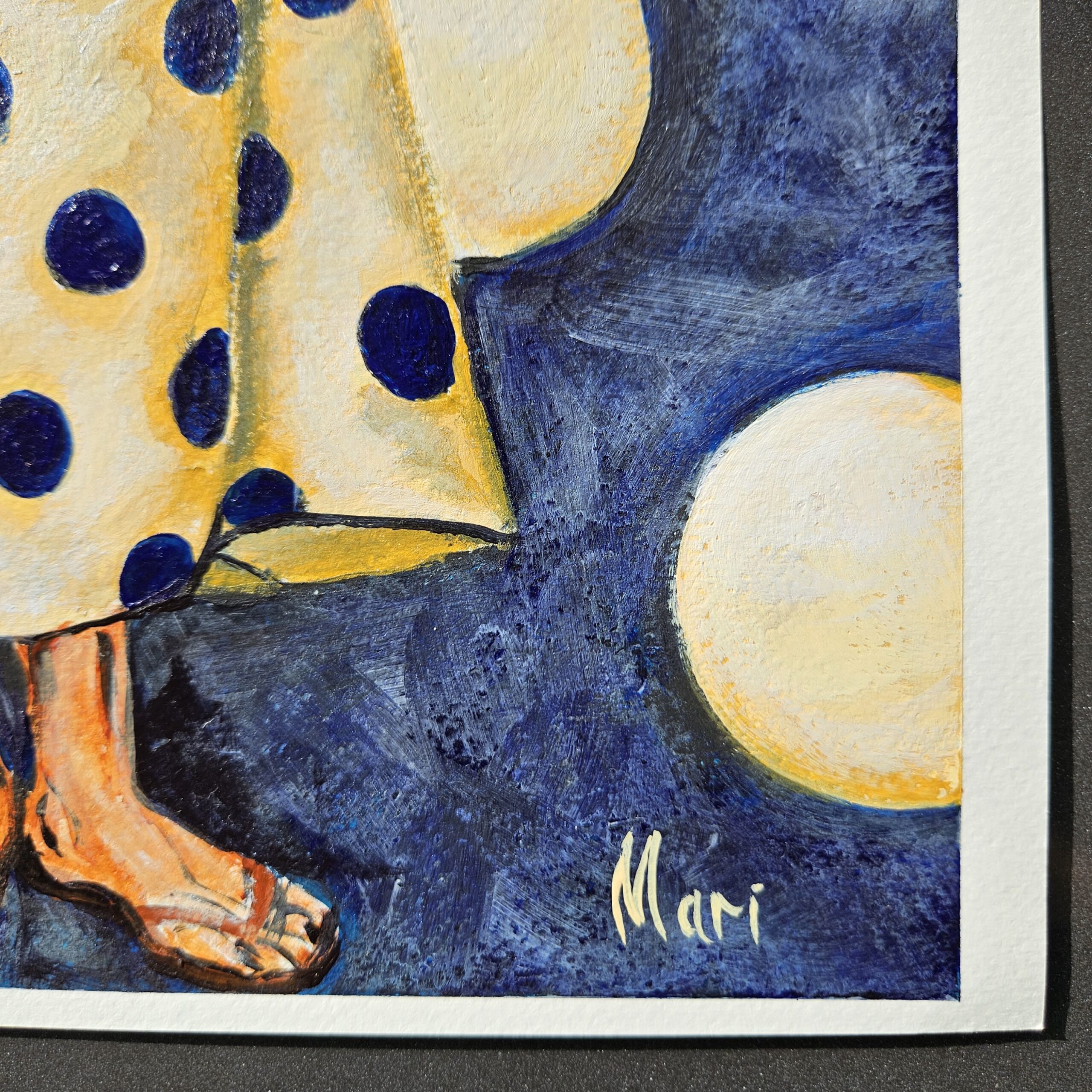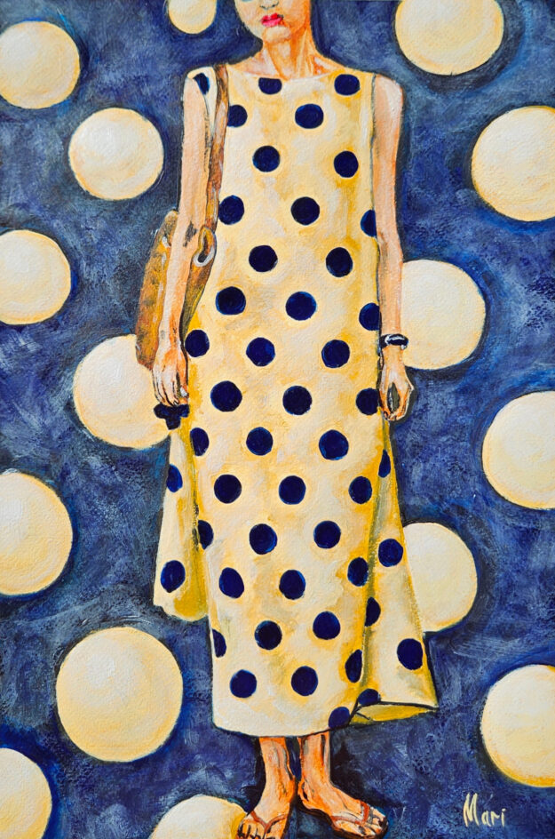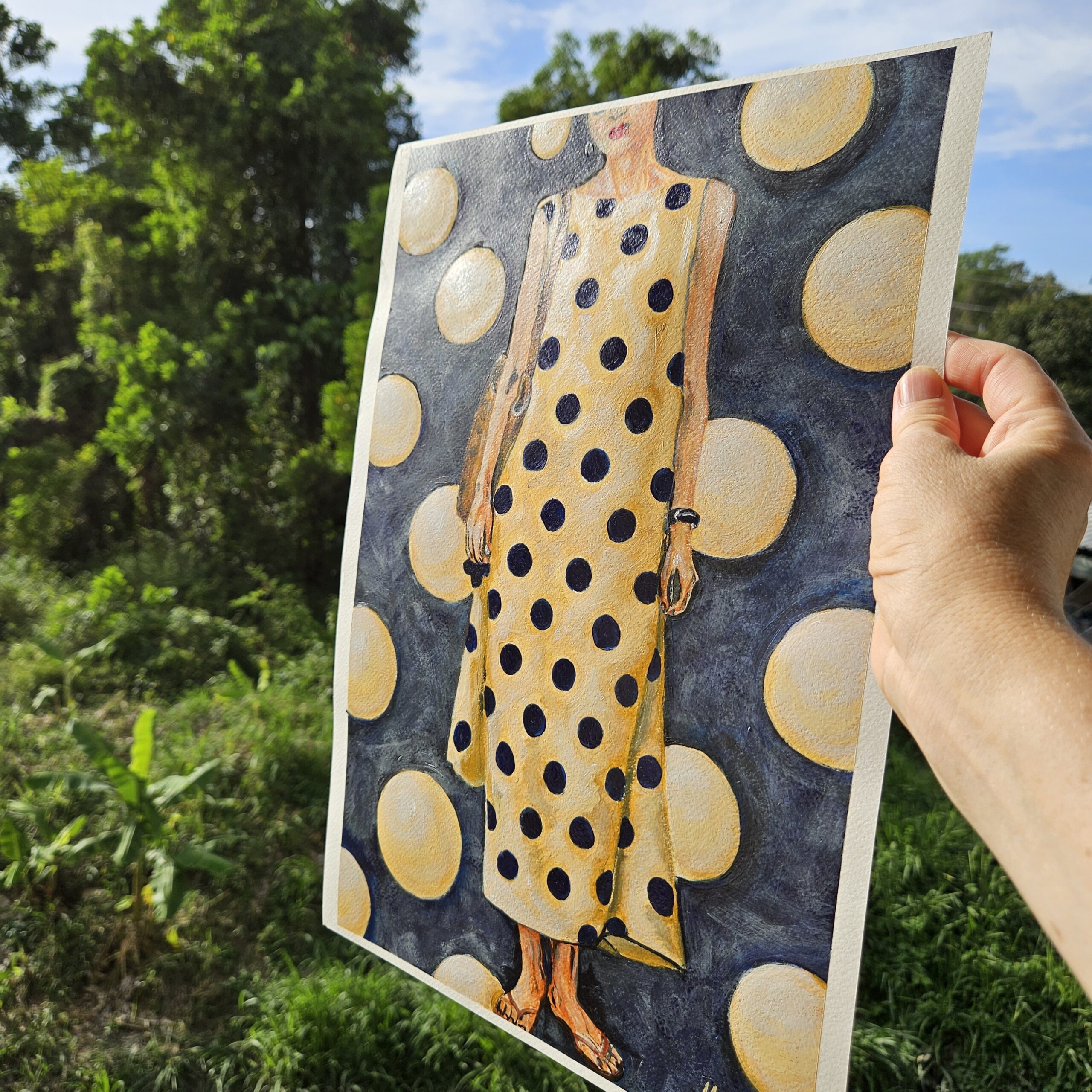 Polka Dot Dress Female Silhouette Fashion Figurative is a vibrant original painting that explores the elegance of fashion and contemporary figurative art. The composition presents a female silhouette dressed in a light dress with bold polka dots, standing against a deep blue background filled with luminous circular forms. The contrast between the soft cream tones of the dress and the rhythmic pattern of dark dots creates a strong visual identity and playful modern aesthetic.