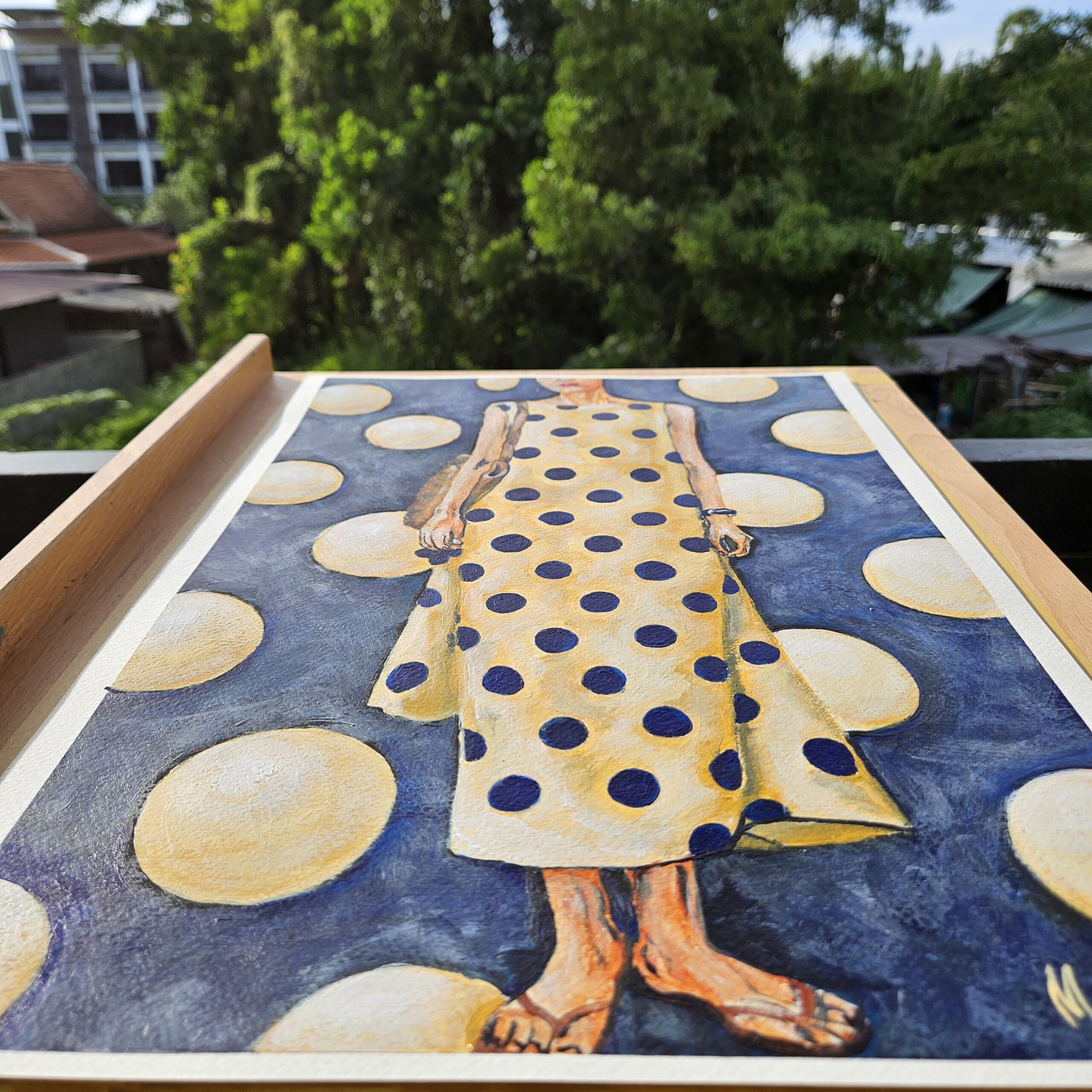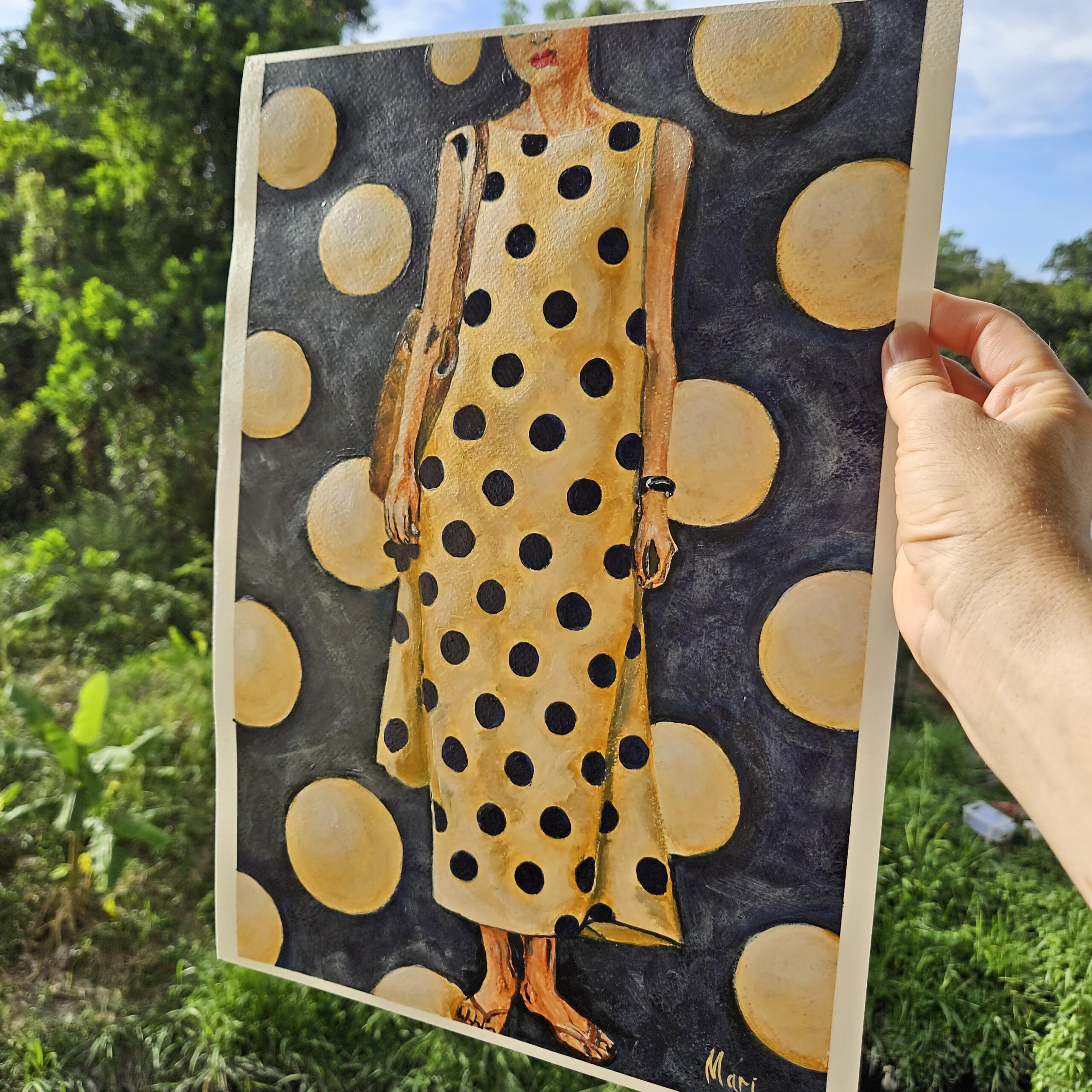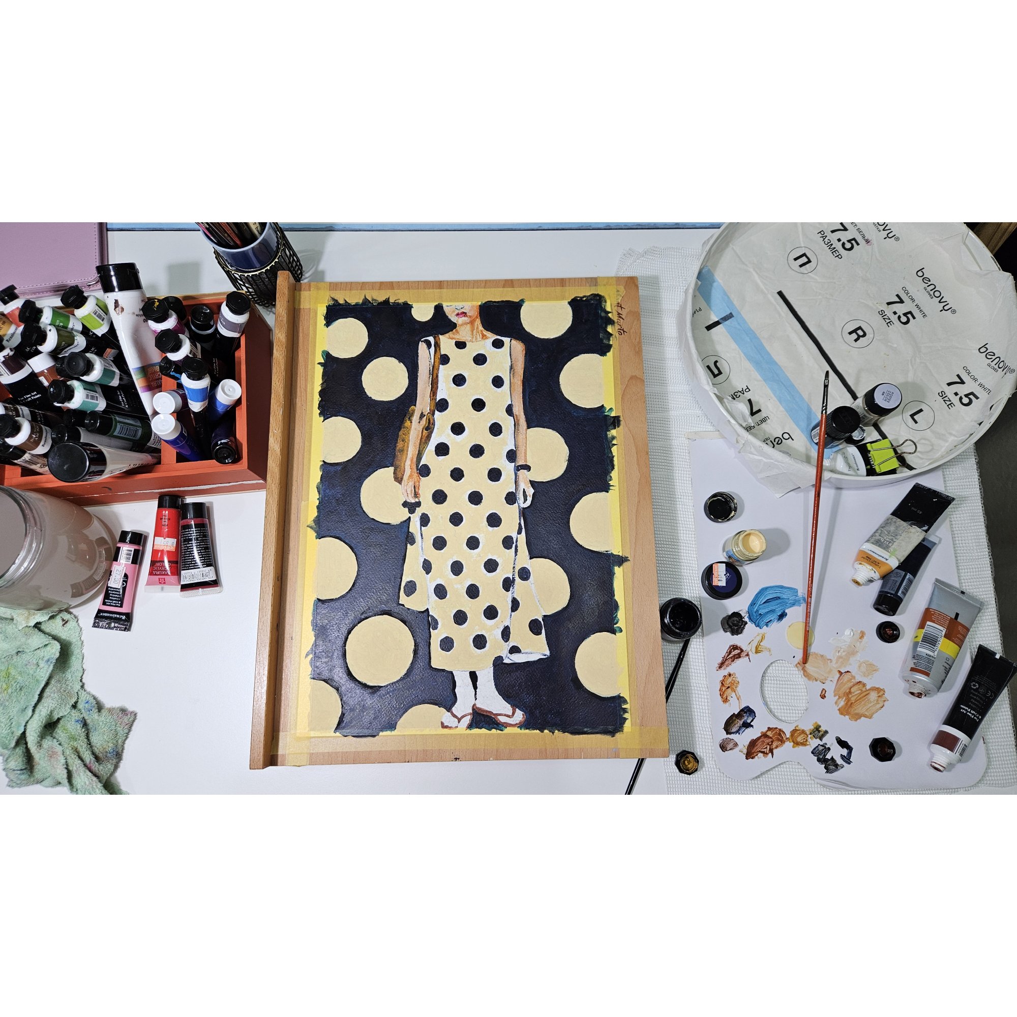 This expressive figurative painting celebrates the language of fashion and personal style. The elongated female figure, graceful posture, and minimal narrative details allow the viewer to focus on the balance between pattern, color, and silhouette. The work reflects elements of contemporary figurative art, combining fashion-inspired imagery with painterly brushwork.