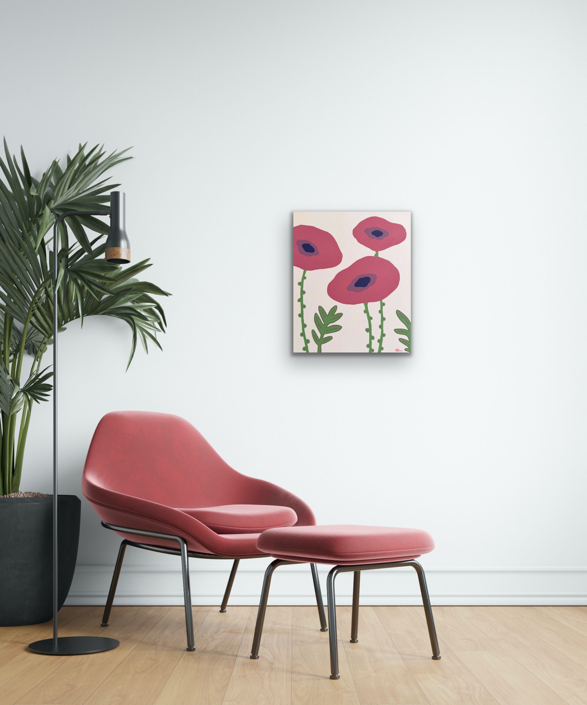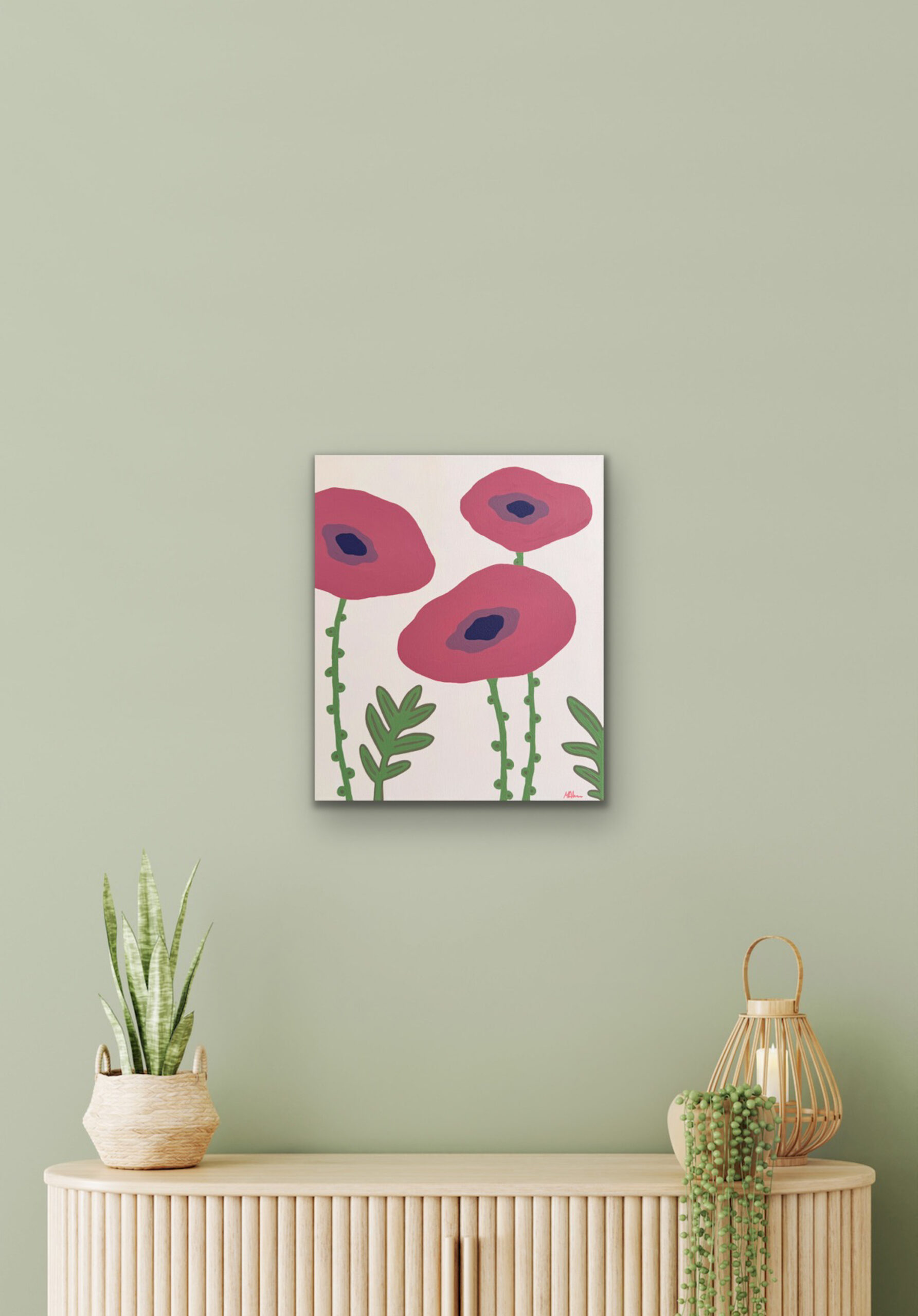 This acrylic painting depicts stylized poppies in a simplified, calm composition. The work focuses on clear shapes, muted color contrasts, and a sense of quiet space. By reducing details and leaving room for the background to breathe, the painting invites a slow, contemplative viewing. It is created as a gentle interior piece, bringing a feeling of stillness and soft rhythm into the space.