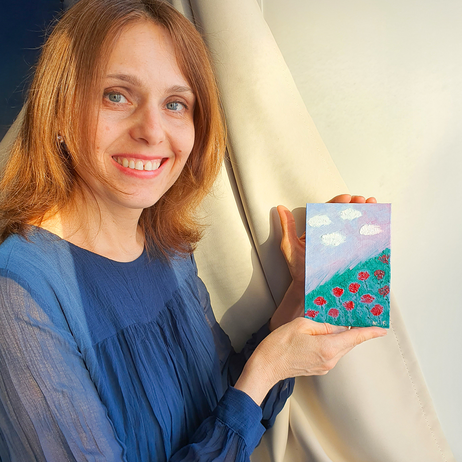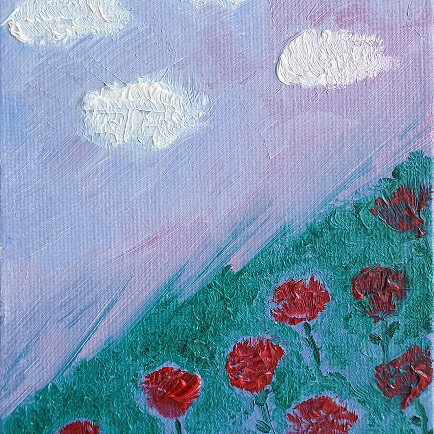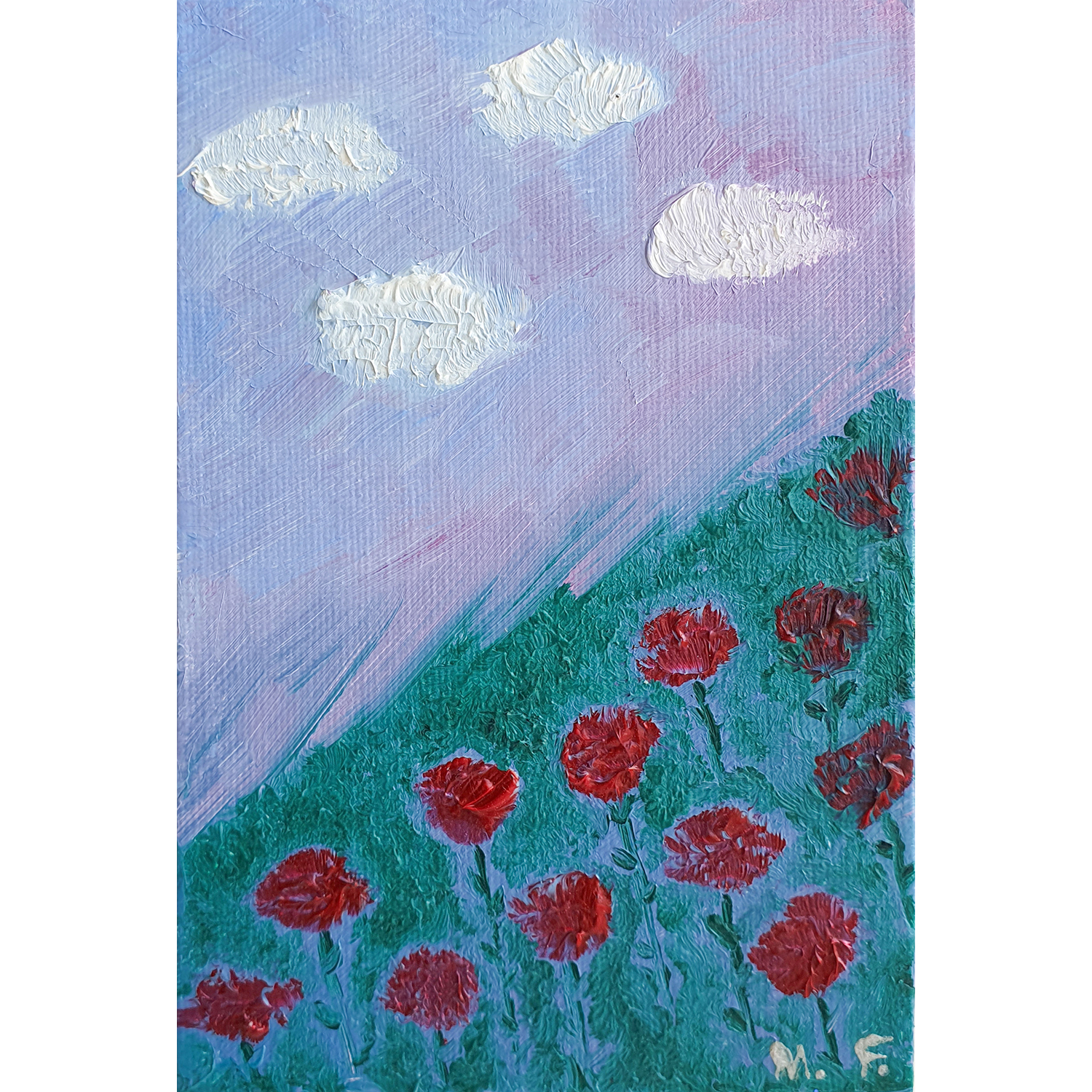 This original oil painting miniature captures a mountain slope in full bloom, painted at a sharp angle. The hillside is covered with vivid red tulips on a lush green carpet of grass, reaching upward as if gazing at the sky. Their delicate beauty is reflected in soft bluish-lilac tones of the heavens above. Gentle, fluffy white clouds, created with textured impasto brushstrokes, float across the canvas, adding depth and atmosphere.
