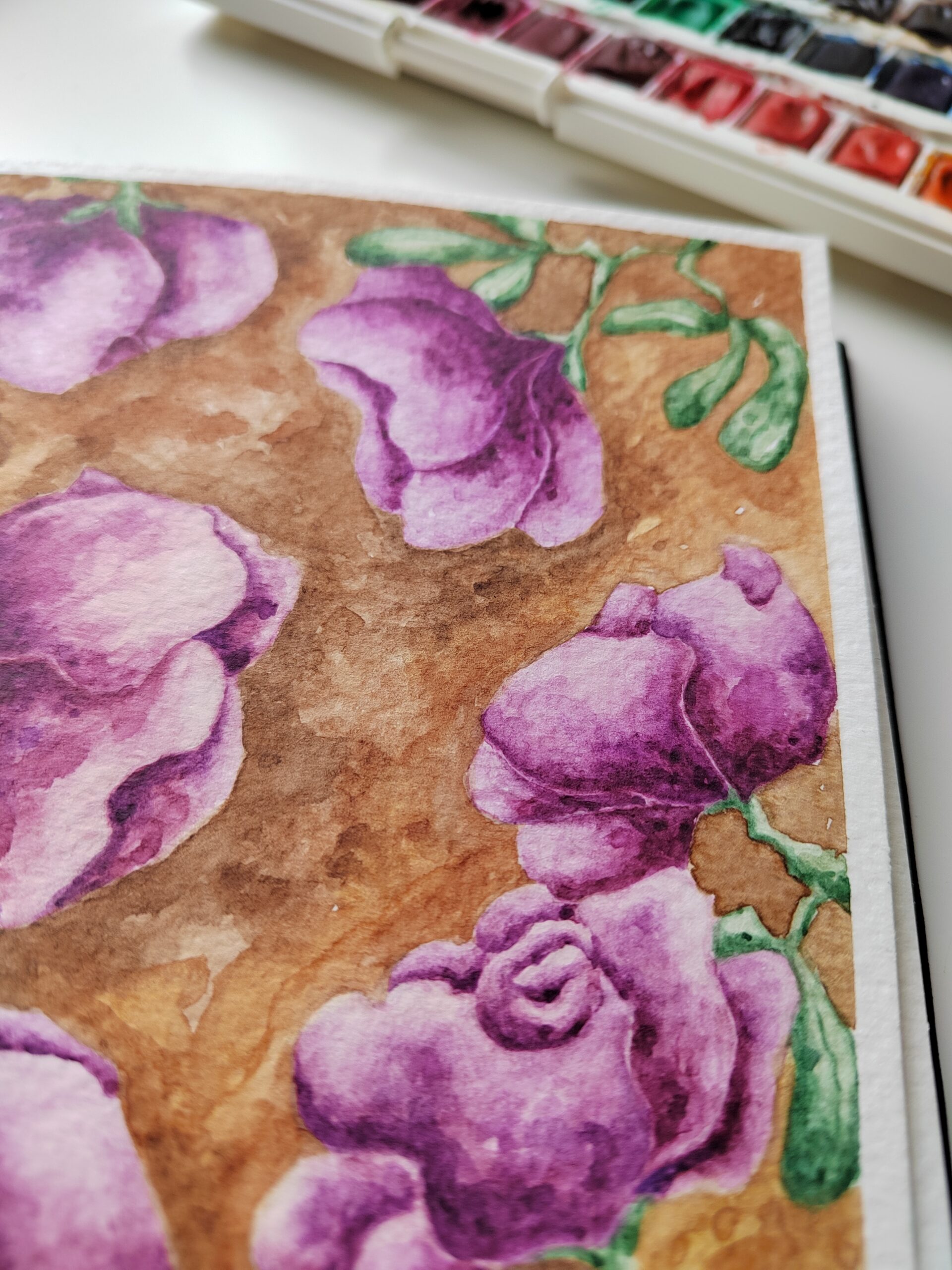 A watercolor painting featuring delicate purple roses with lush green stems and leaves, set against a warm brown background. The soft blending of colors and organic shapes give the piece a vintage and botanical charm, making it a perfect choice for floral art lovers.