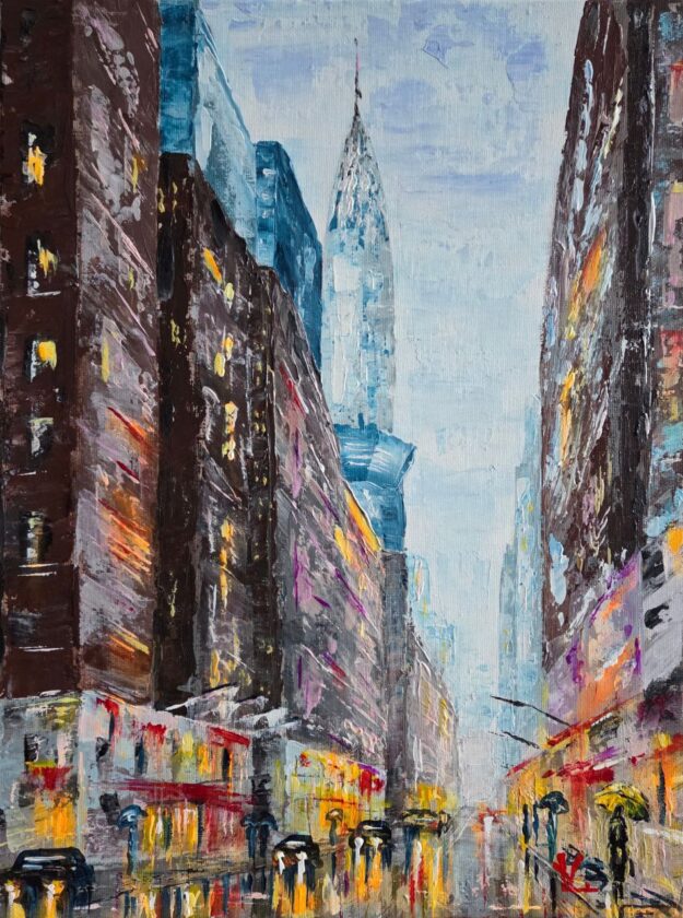 Rain in New York, 40×30 cm, acrylic, canvas on fiberboard, 2025