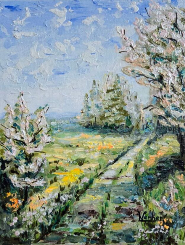 The painting depicts a quiet country road stretching into the distance, seemingly dissolving in the gentle haze of a spring morning. The road is unpaved—it lies in soft earth, slightly damp from a recent rain.