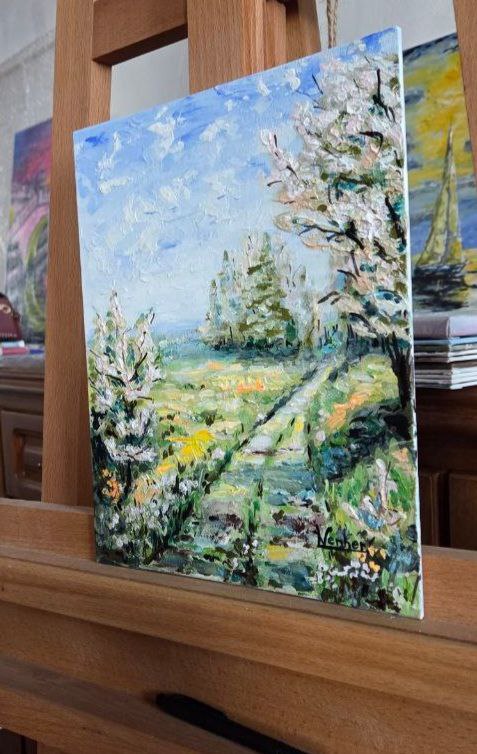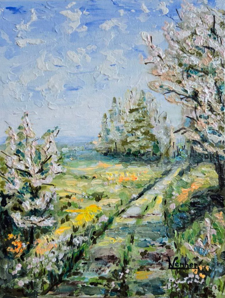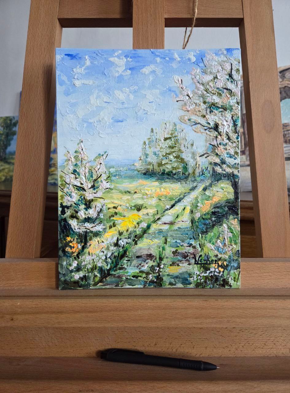 The sky above the road is clear, with light white clouds, and the air seems filled with the scent of blooming grasses and fresh earth. Everything in this scene speaks of a beginning—of the awakening of nature, of the quiet joy that spring brings.