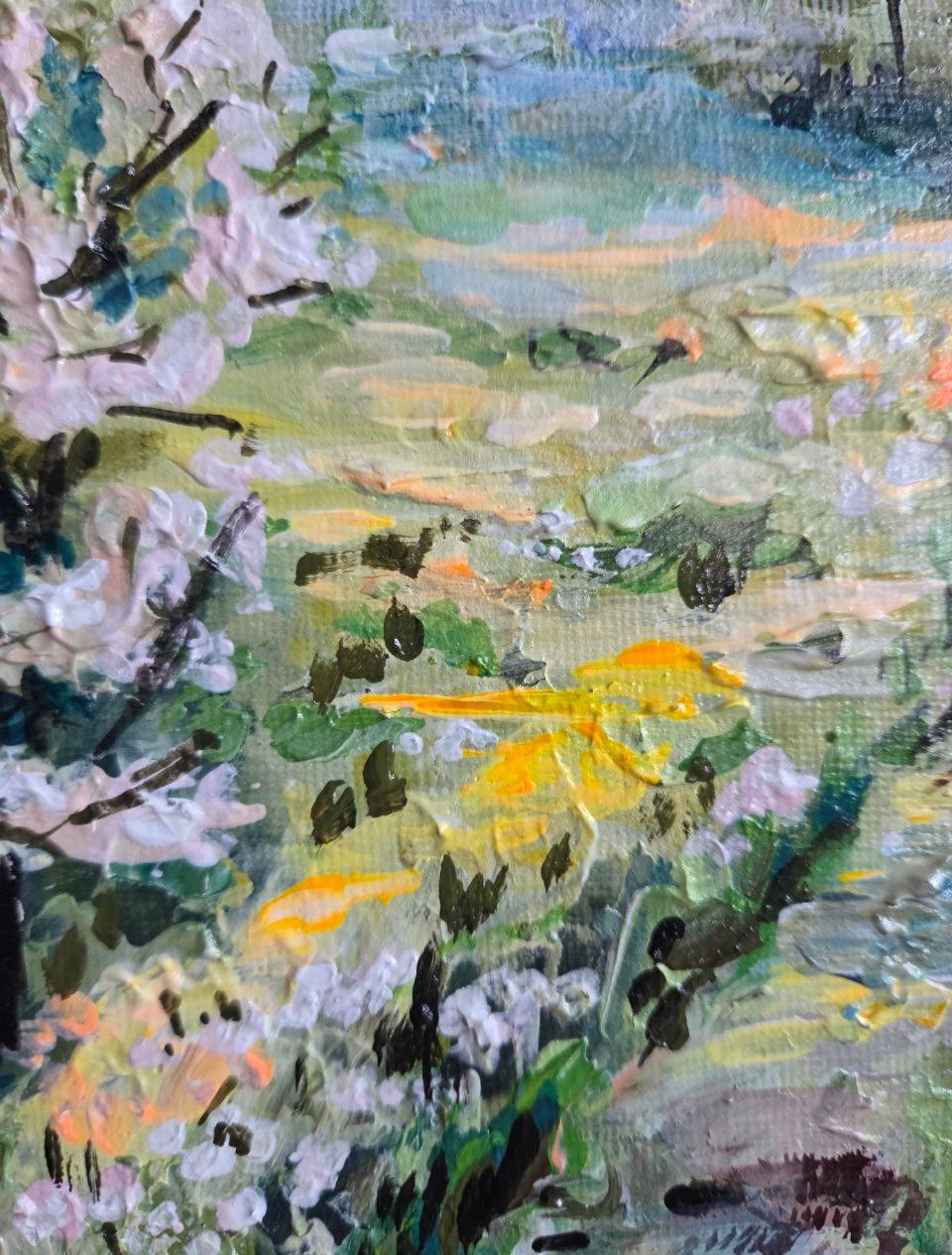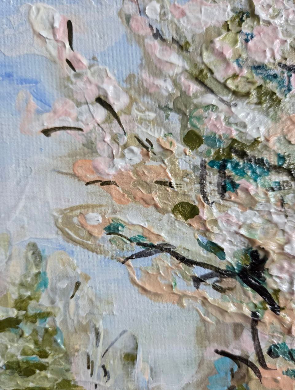 Young trees grow along the road, their delicate green leaves and flower petals still translucent in the sun. The tree branches lean slightly over the road, creating a gentle shadow that plays on the ground in intricate patterns. Somewhere among the trees, birdsong can be heard, invisible but clearly perceptible through the gentle movement of the leaves.
