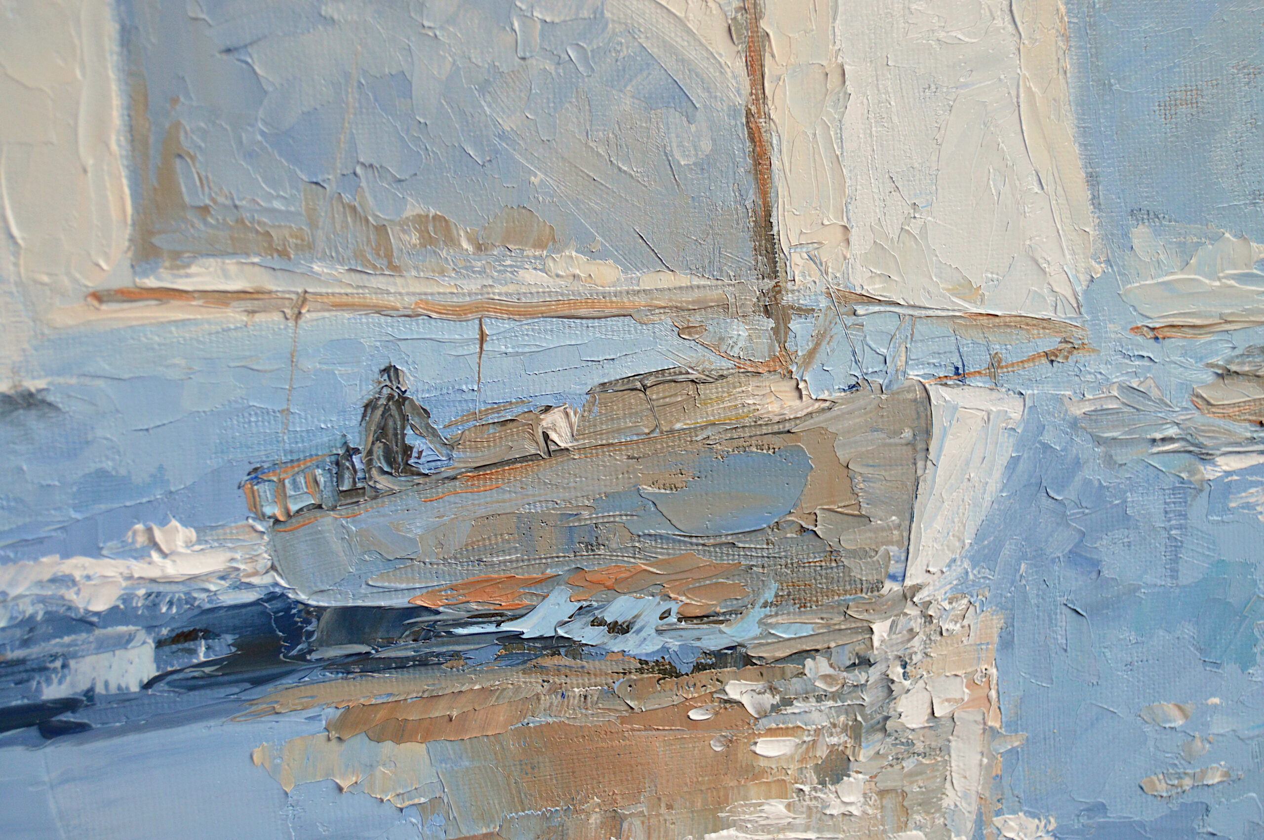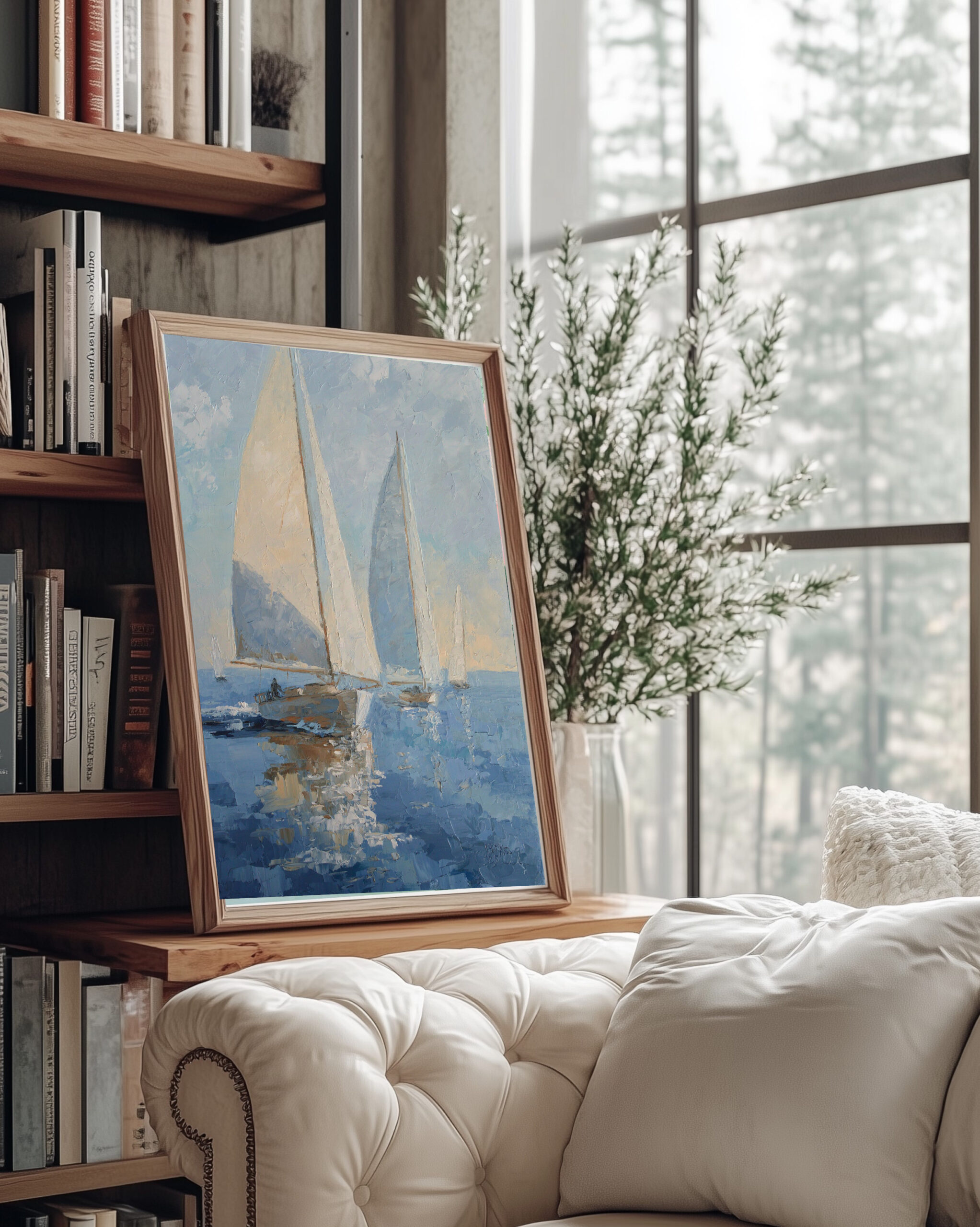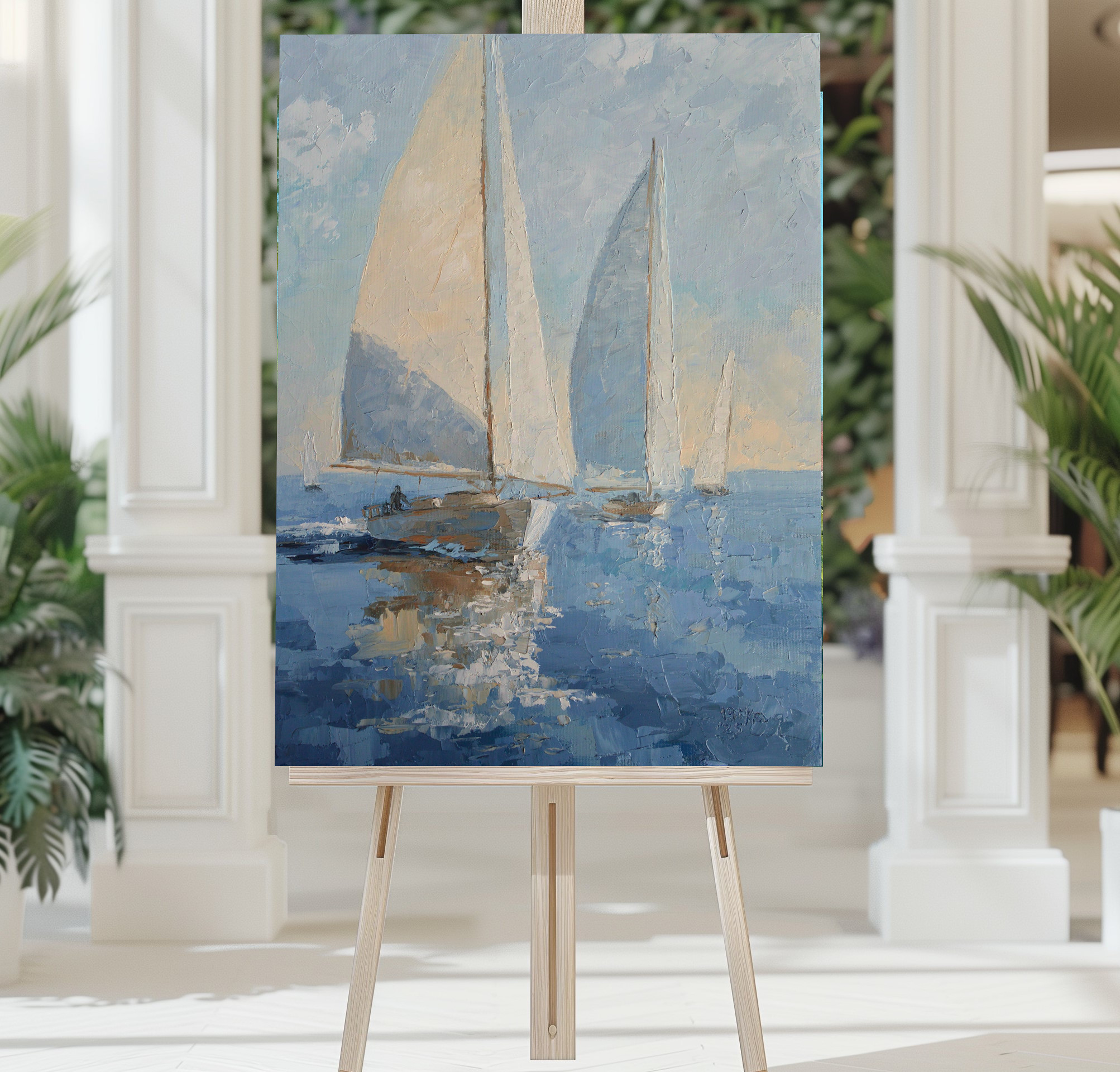 A serene seascape featuring graceful sailboats drifting across calm waters. Painted in soft blue and beige tones, this impressionistic oil painting captures the quiet beauty of the sea. Created with a palette knife on stretched canvas, the texture adds depth and movement, evoking a dreamlike coastal atmosphere.