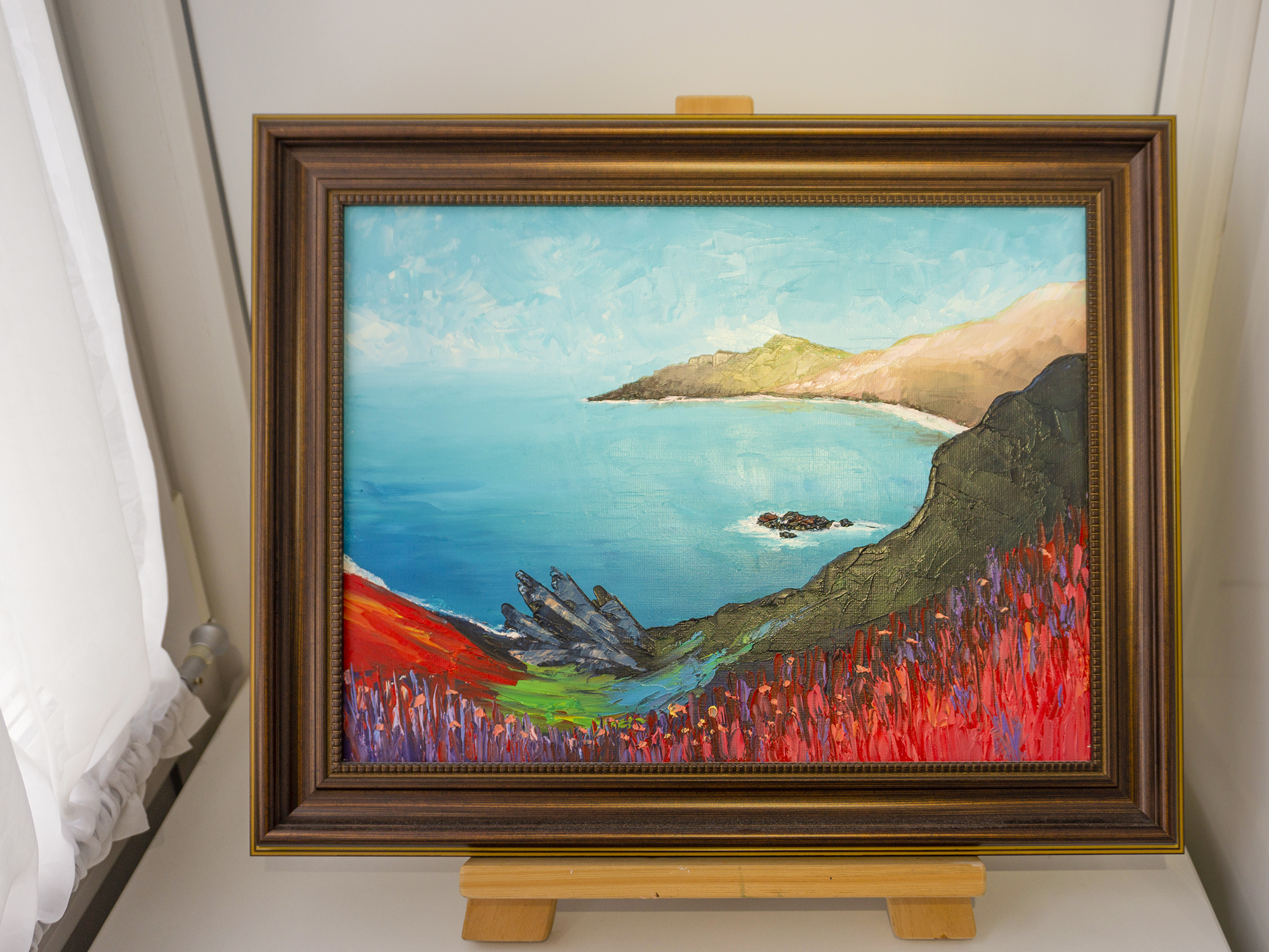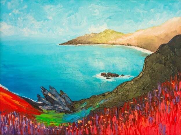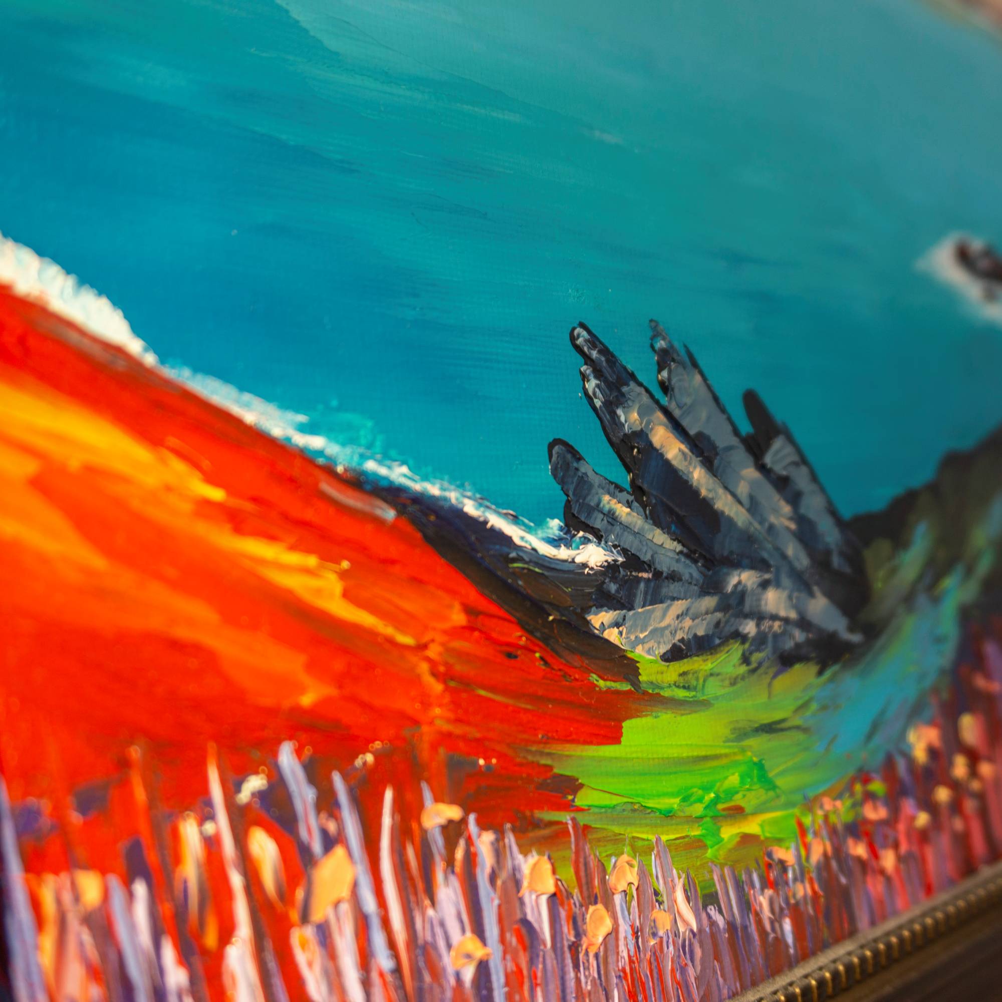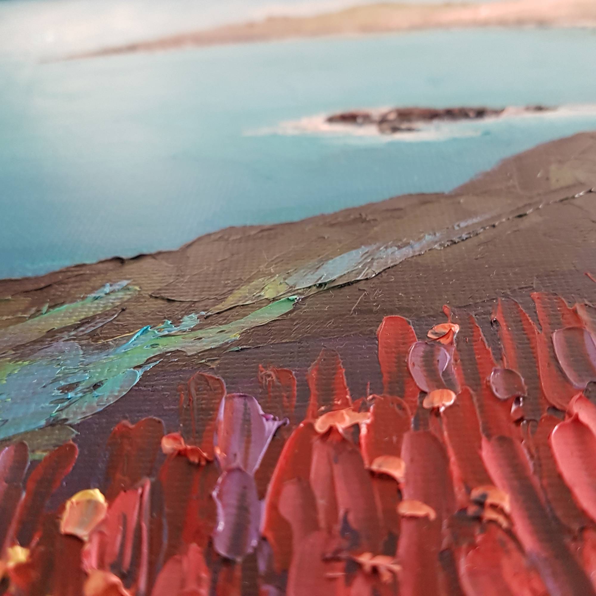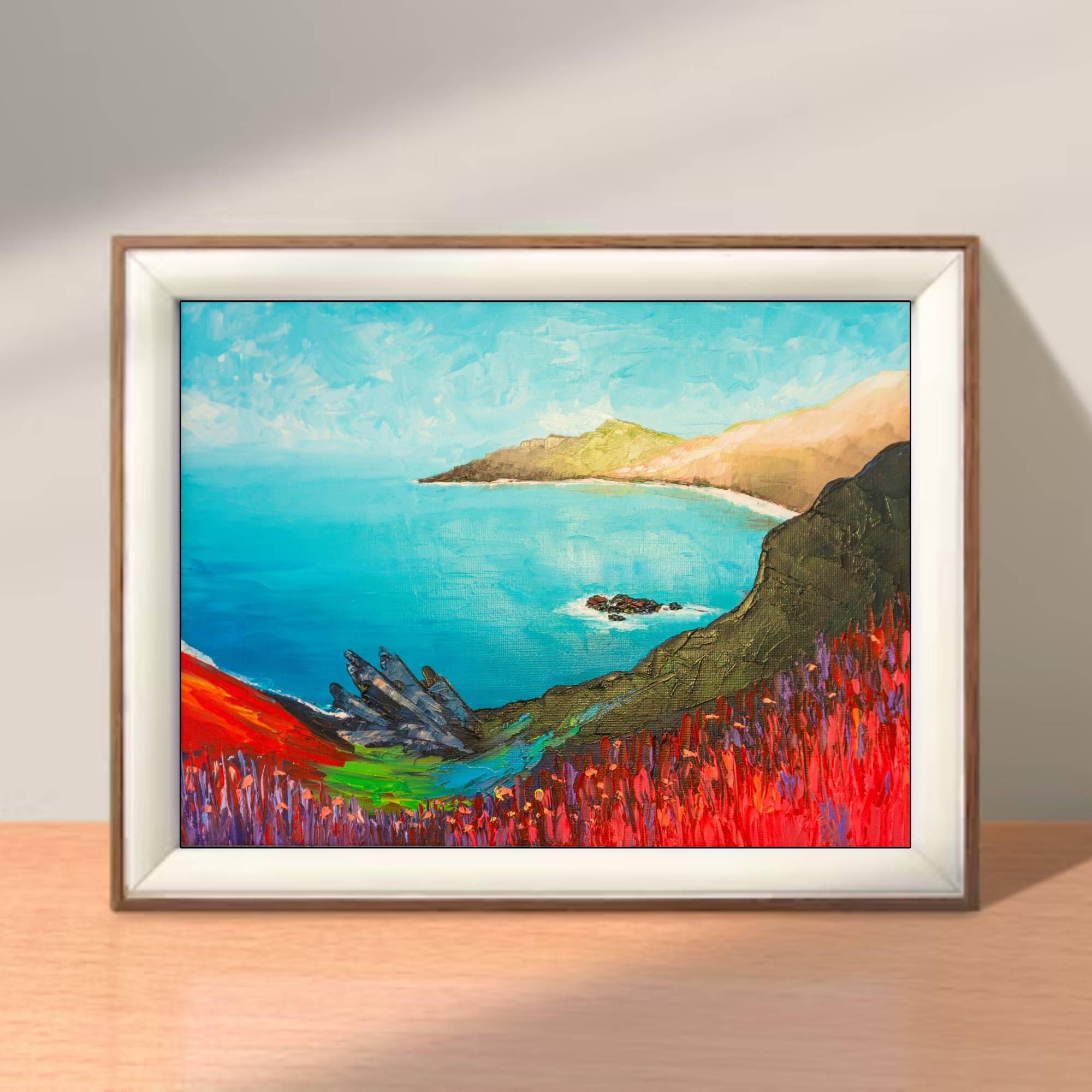 This original oil painting captures a vibrant coastal bay surrounded by cliffs and illuminated by soft natural light. The calm turquoise ocean stretches into the distance, while rugged rocks and sunlit hills shape the horizon. In the foreground, expressive strokes of red and wildflowers create a dynamic contrast, adding warmth and movement to the composition.