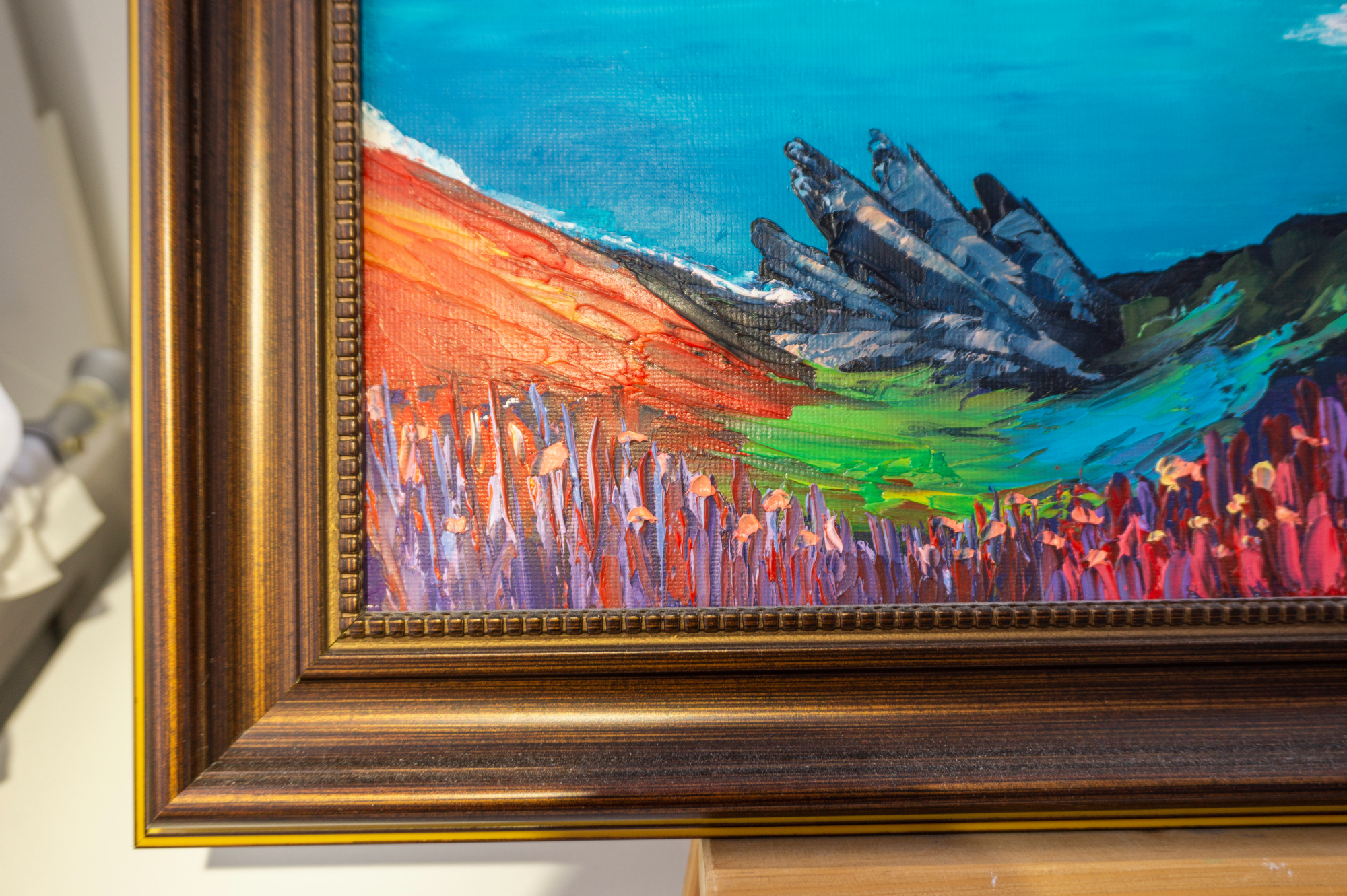 The painting is executed with thick, textured layers of oil paint applied using a palette knife. This technique enhances depth, creates tactile surface quality, and captures the energy of the landscape. Each stroke remains visible, emphasizing the handcrafted nature and individuality of the piece.