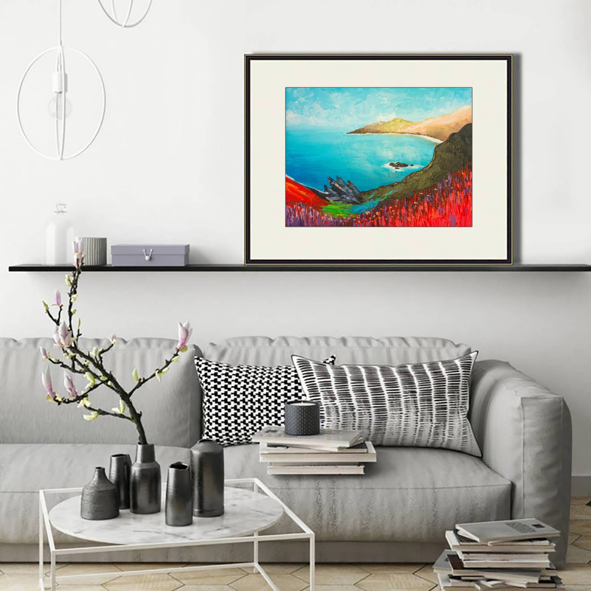 Coastal Bay Seascape Painting Cliffs Ocean View Wildflowers Landscape